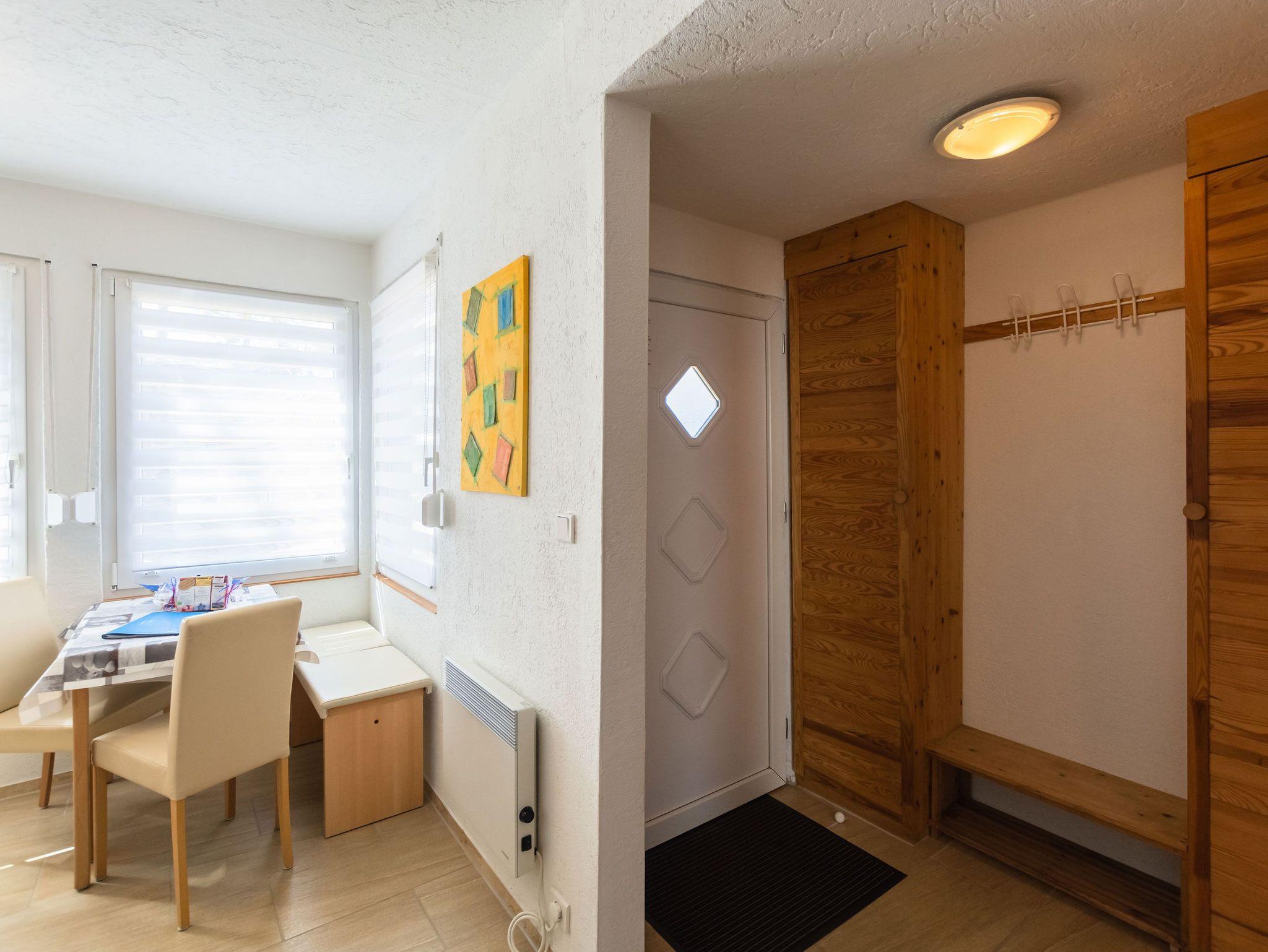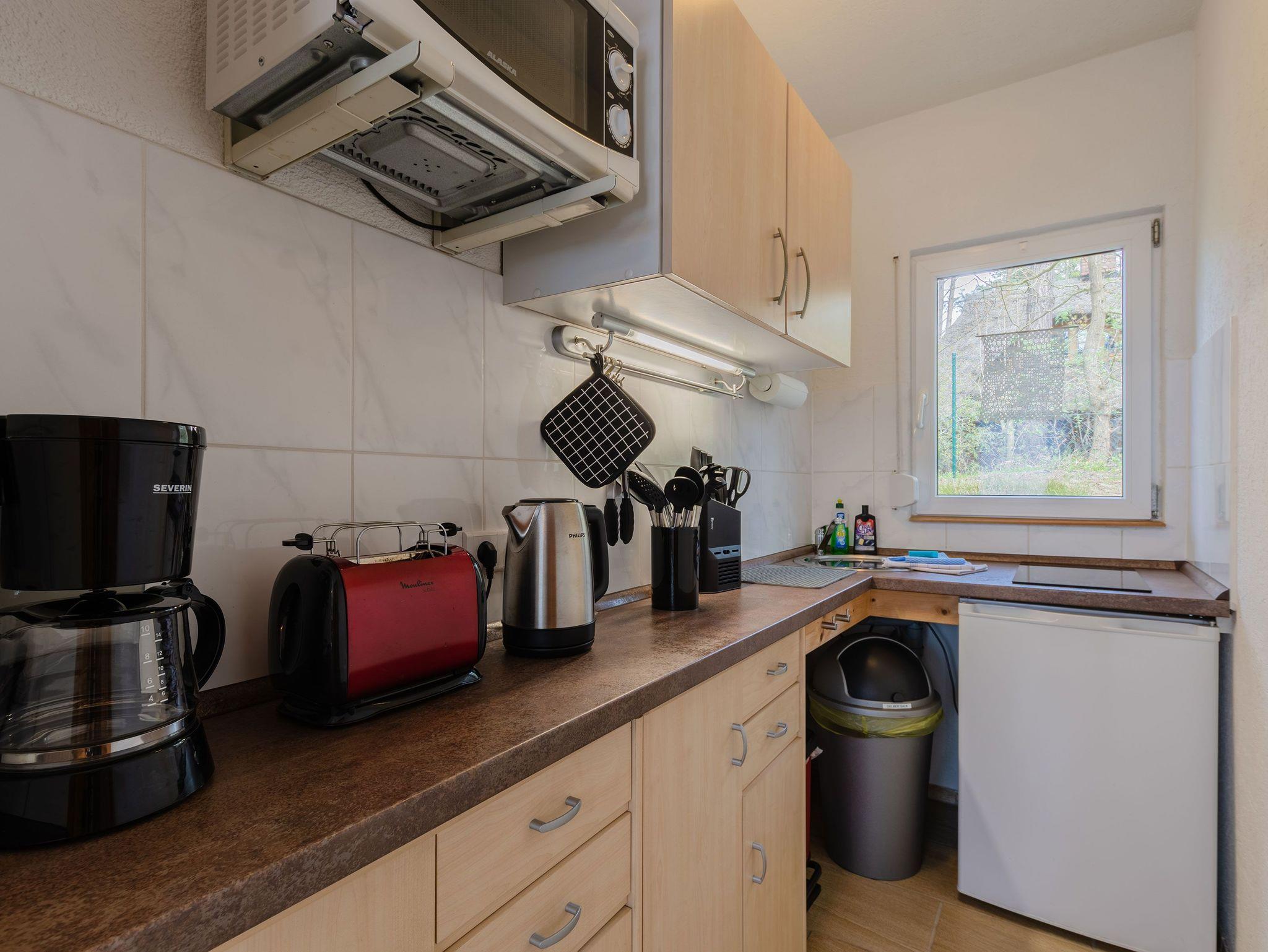 Die offene Küche ist mit einem kleinen Kochfeld, einem Kühlschrank, Kaffeefiltermaschine, Wasserkocher, Toaster sowie einer Mikrowelle ausgestattet. Ein kleiner Essbereich rundet das Gesamtangebot ab. Im Schlafbereich befindet sich ein Doppelbett (140x200) und ein Kleiderschrank.