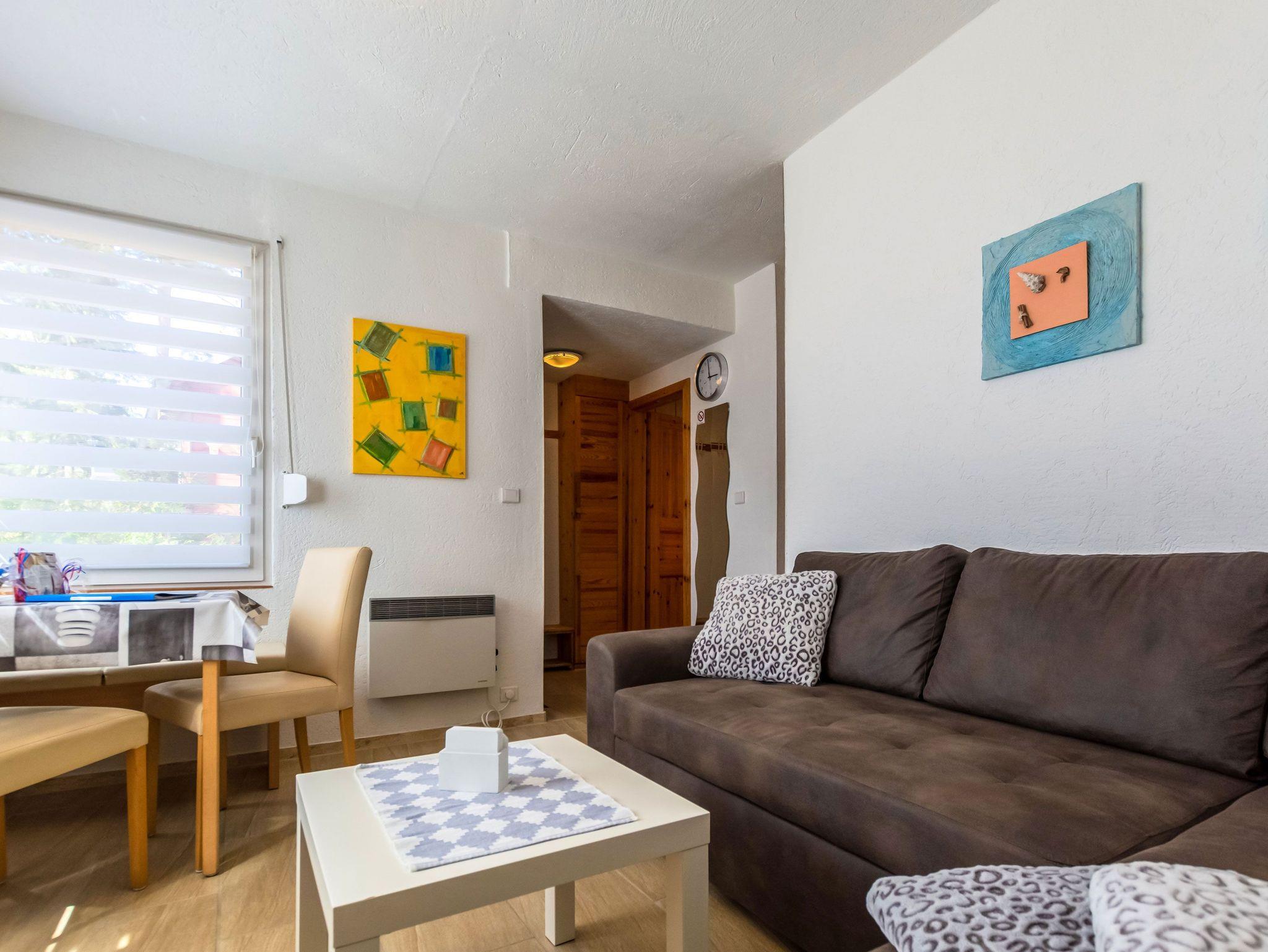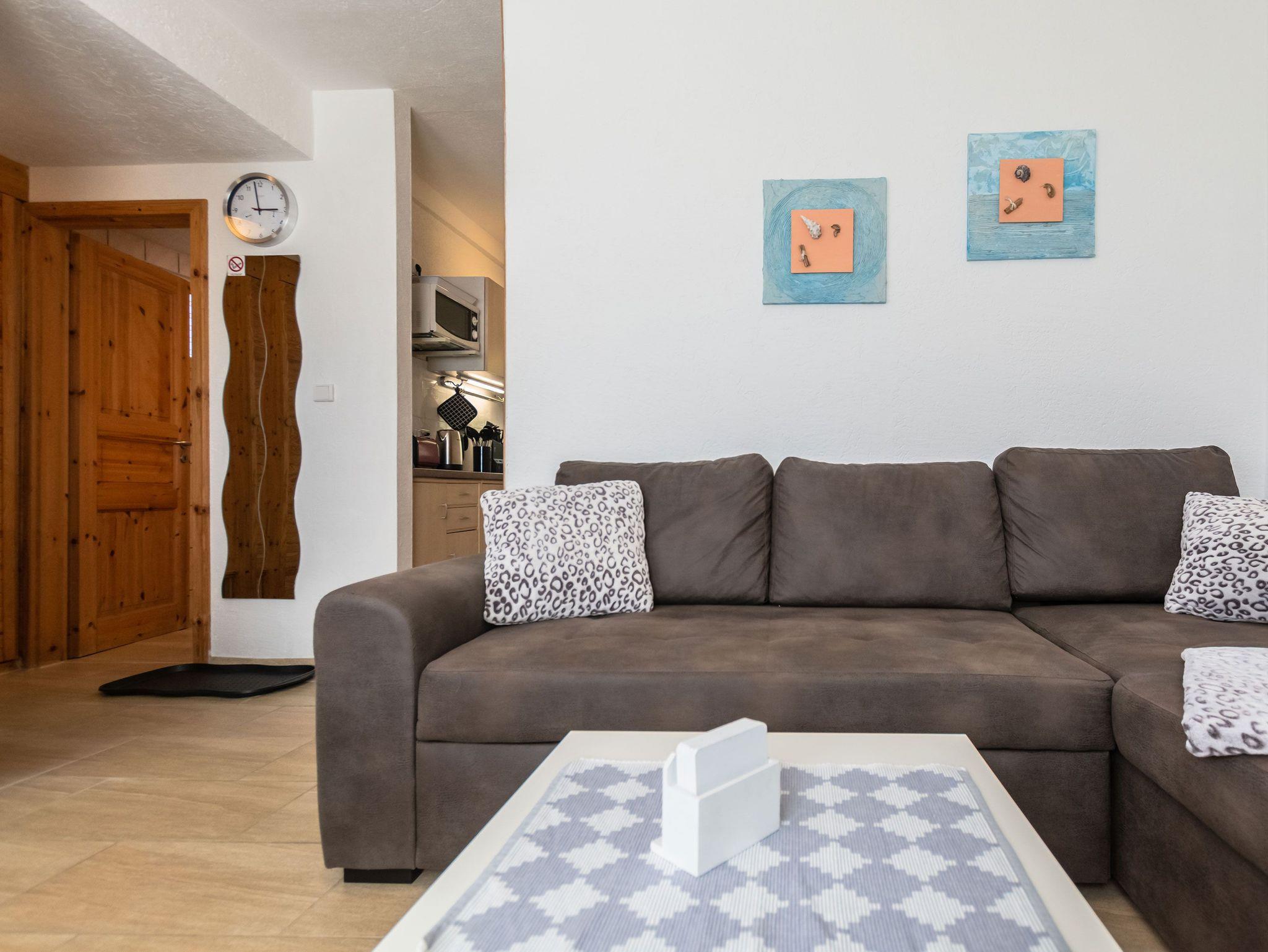 Der gemütliche Wohnbereich überzeugt mit einer Couchgarnitur, einem Fernseher und einem Radio. Zudem können hier 2 weitere Personen auf dem Schlafsofa die Nächte verbringen.
