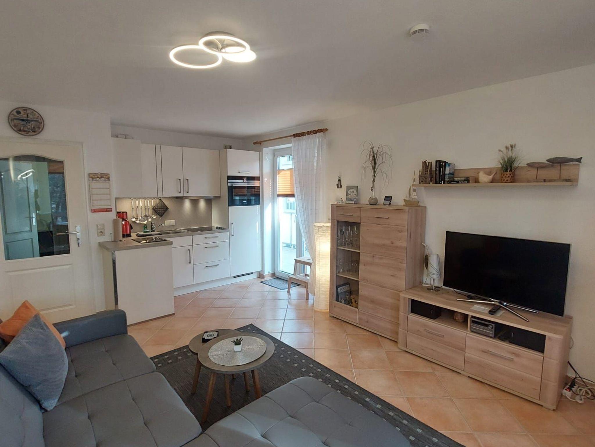 2-Zimmer-Ferienwohnung mit Balkon: 41 m², 1 WZ mit Küchenzeile und Ausgang zum Balkon (2 Balkon-Alu-Hochlehner mit Auflagen u. passende Klapphocker, ein Tisch und Sichtschutz-Balkonumrandung) , ein großer TV Flachbildschirm (HD TV), Fliegengitter im WZ- Fenster, Hifi Anlage mit CD, Wohnwand mit Bücherregal, kostenloses WLAN, moderne Küchenzeile mit Geschirrspüler, Cerankochfeld, Backofen, großer Kühlschrank mit Gefrierfach, 1 SZ mit Ausgang zum Balkon, Doppelbett (1.90x1.80 m), Kleiderschrank inkl. Spiegel, verdunkelte Plissees, ruhige Lage, 1 gefliestes Bad mit Fenster, WB, WC, Dusche mit flachen Einstieg, Waschplatz, beleuchteter Spiegel mit Uhrzeit, beheizter Handtuchhalter, Föhn, Fenster, kleiner Flur mit Schuhschrank, Flurgarderobe, Spiegel, Ferienwohnung komplett gefliest