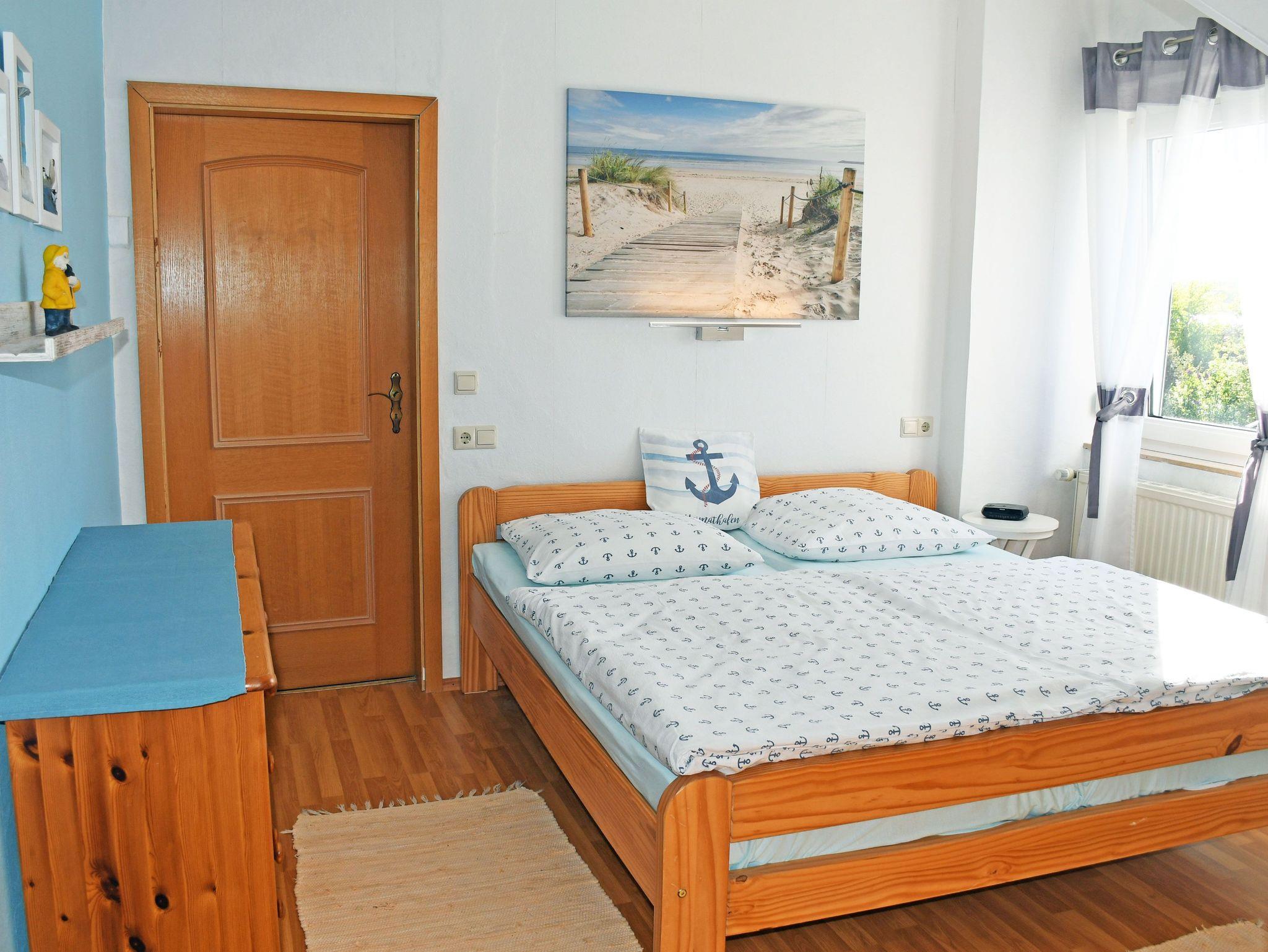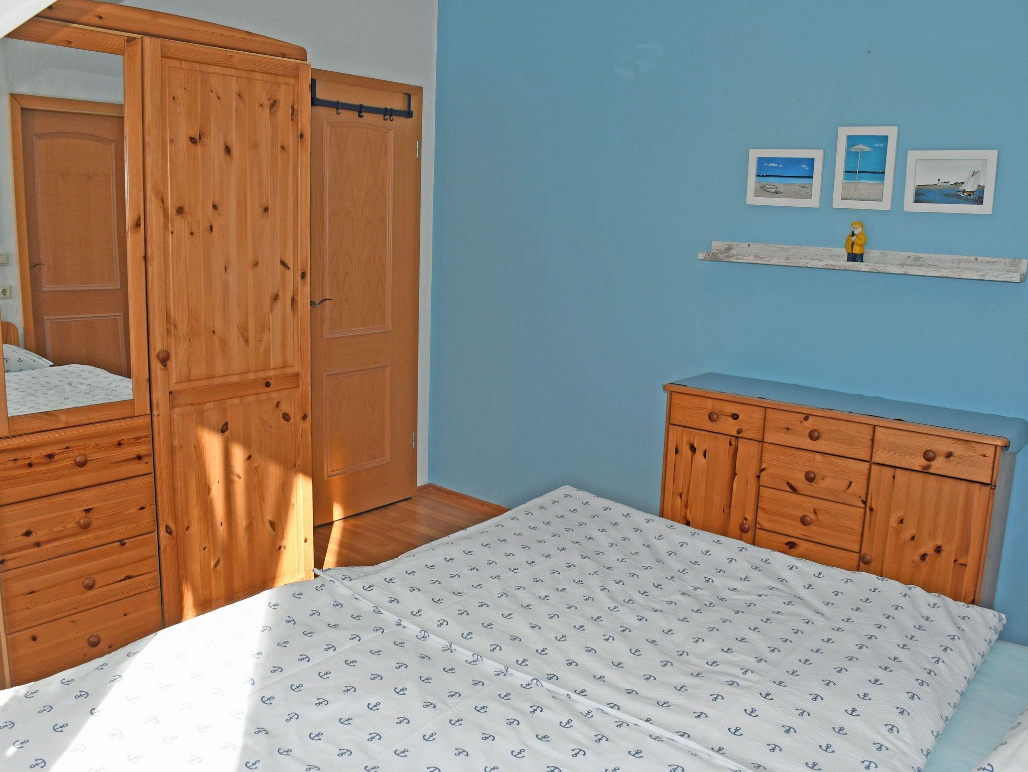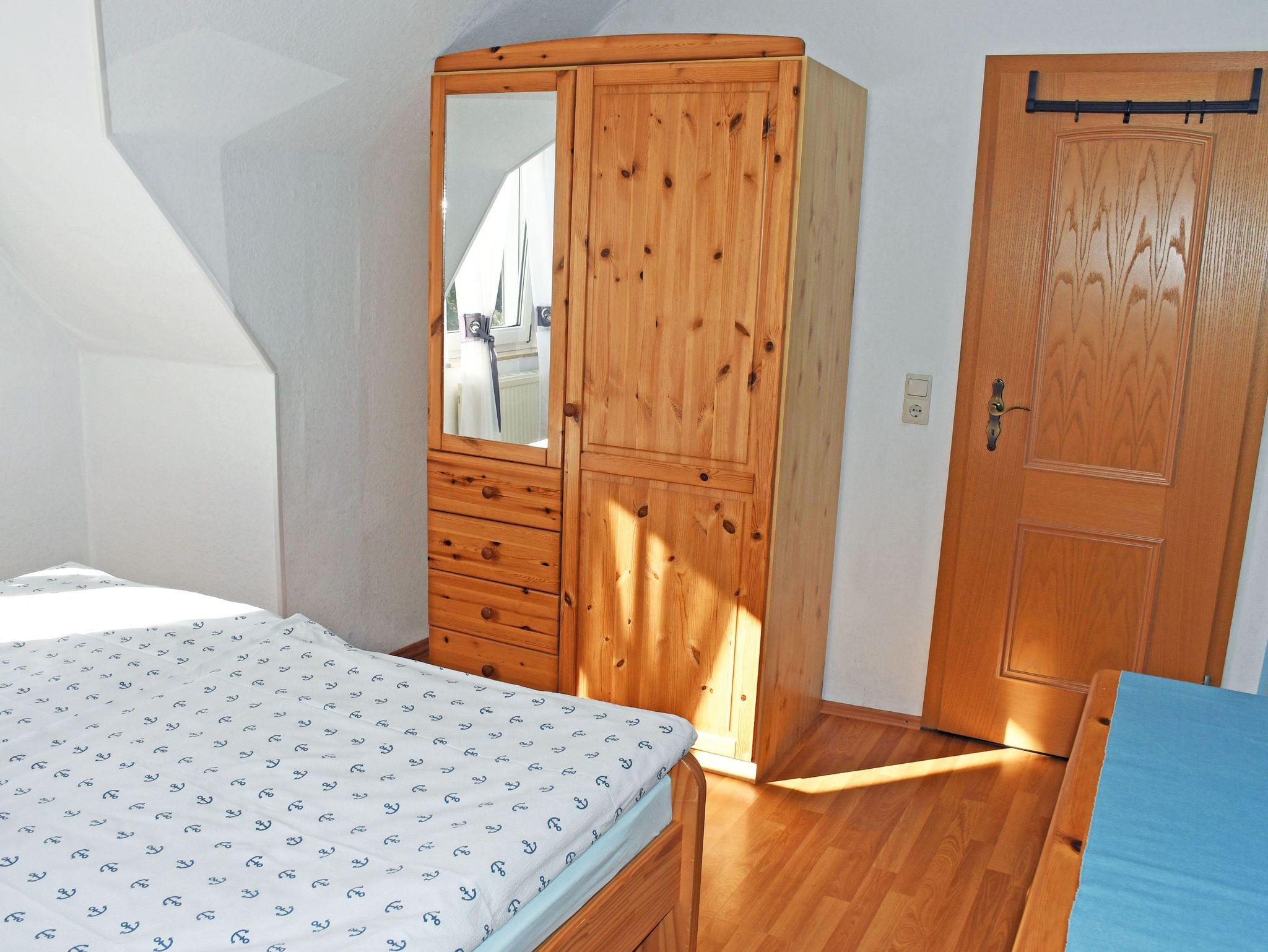 Über einen separaten Eingang und eine Treppe gelangt man im Obergeschoss in den Wohnflur. Im Schlafzimmer befinden sich ein bequemes Doppelbett mit einem Nachttisch und Leselampen und ein Kleiderschrank. Dahinter befindet sich das Wohnzimmer. Hier stehen eine Sitzcouch mit Tisch, Sessel und ein Flachbild-TV-Gerät.