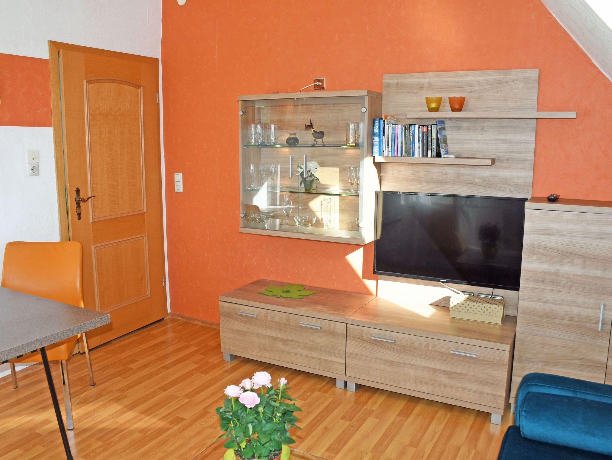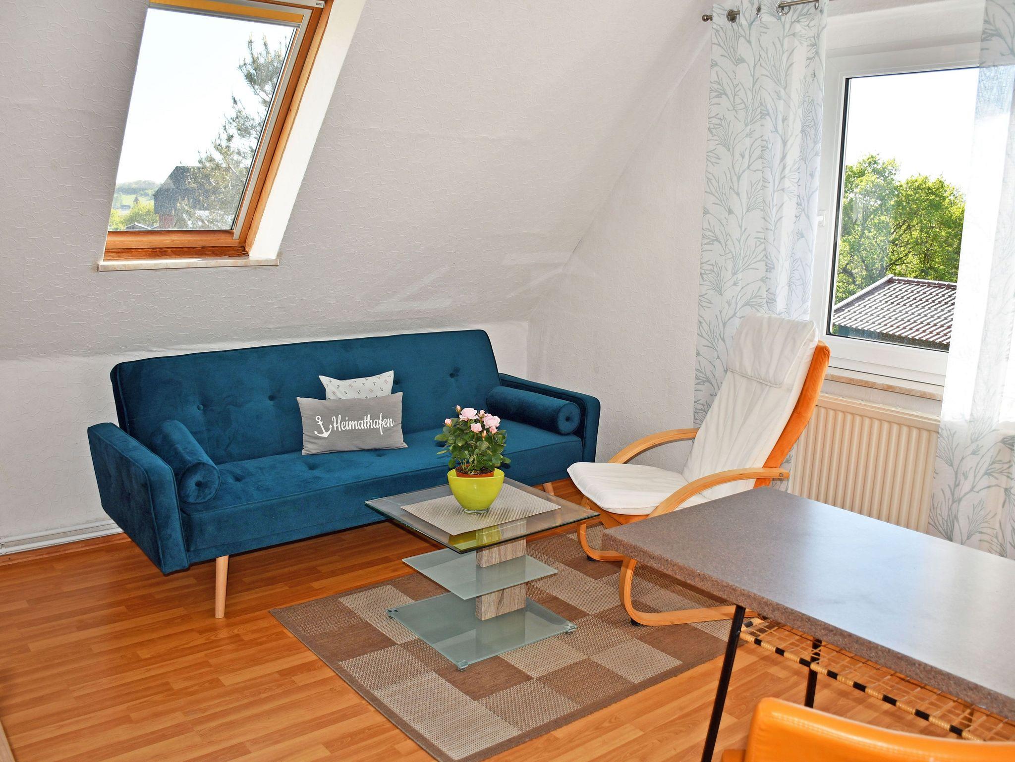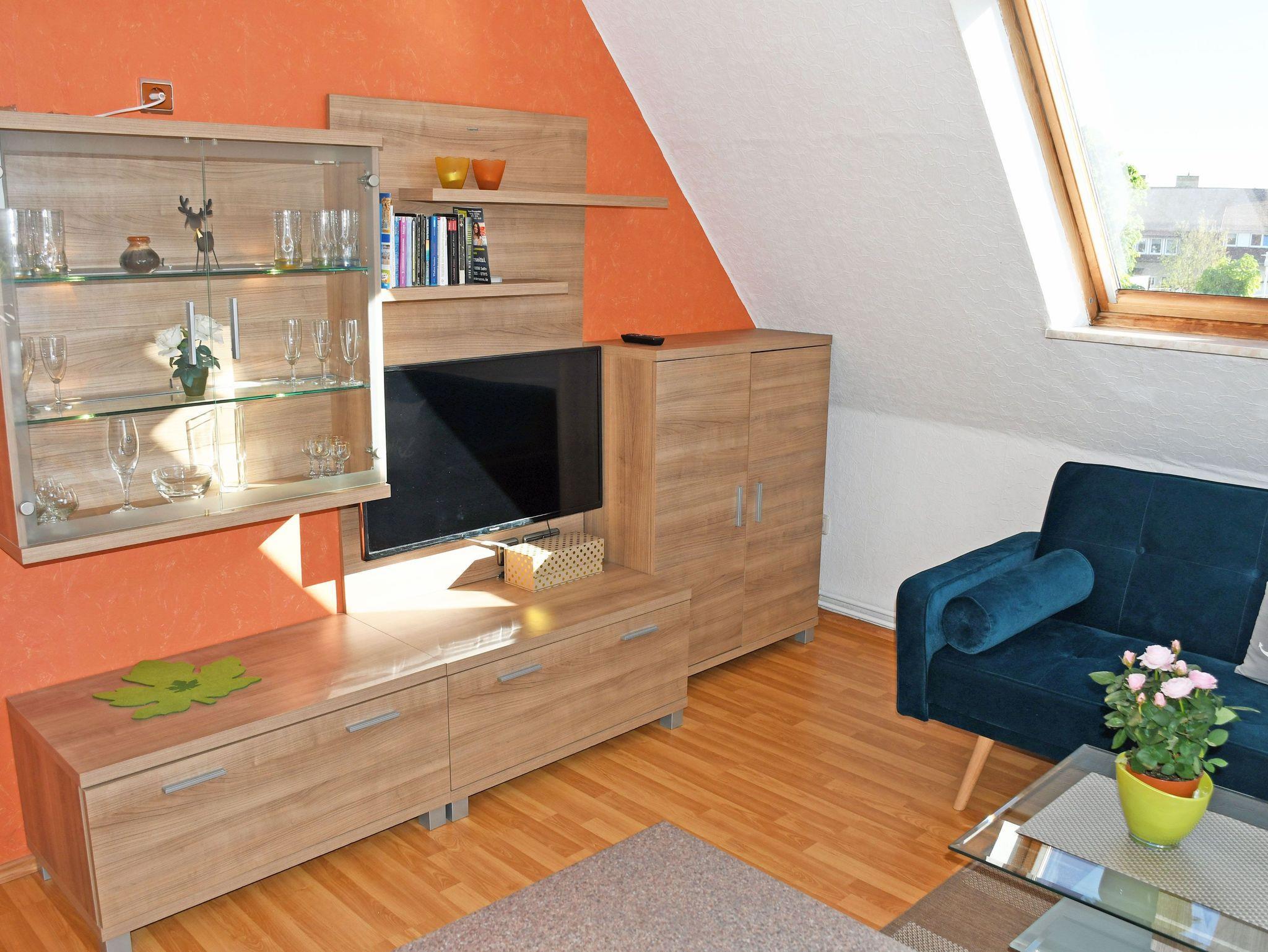 Über einen separaten Eingang und eine Treppe gelangt man im Obergeschoss in den Wohnflur. Im Schlafzimmer befinden sich ein bequemes Doppelbett mit einem Nachttisch und Leselampen und ein Kleiderschrank. Dahinter befindet sich das Wohnzimmer. Hier stehen eine Sitzcouch mit Tisch, Sessel und ein Flachbild-TV-Gerät.