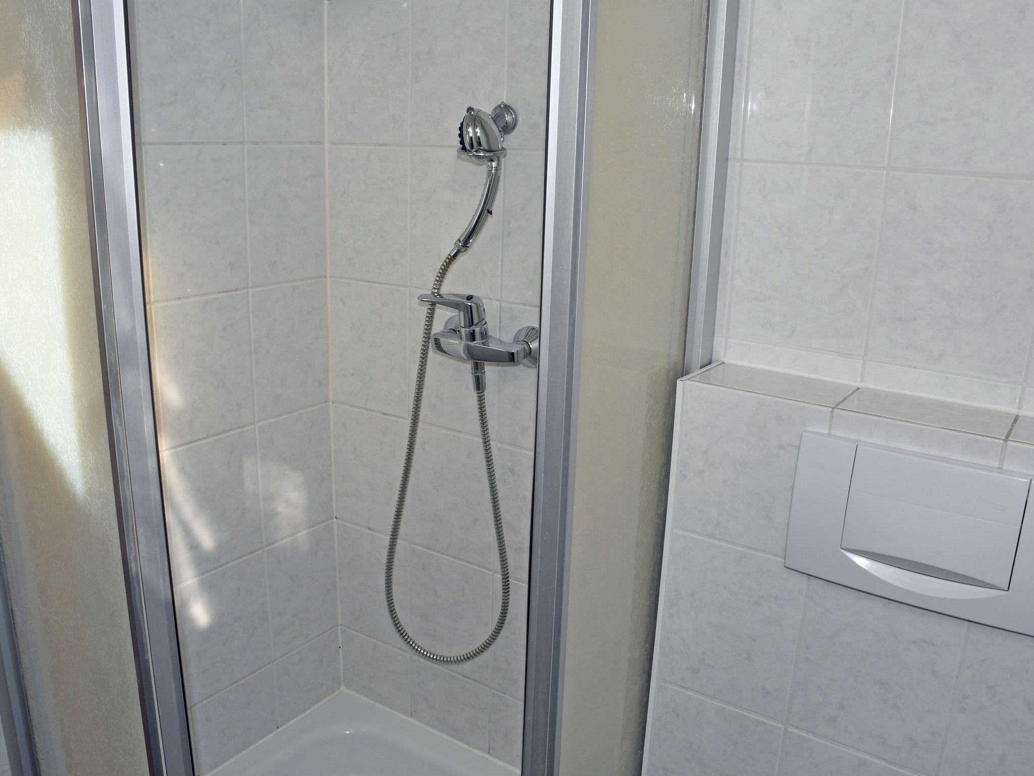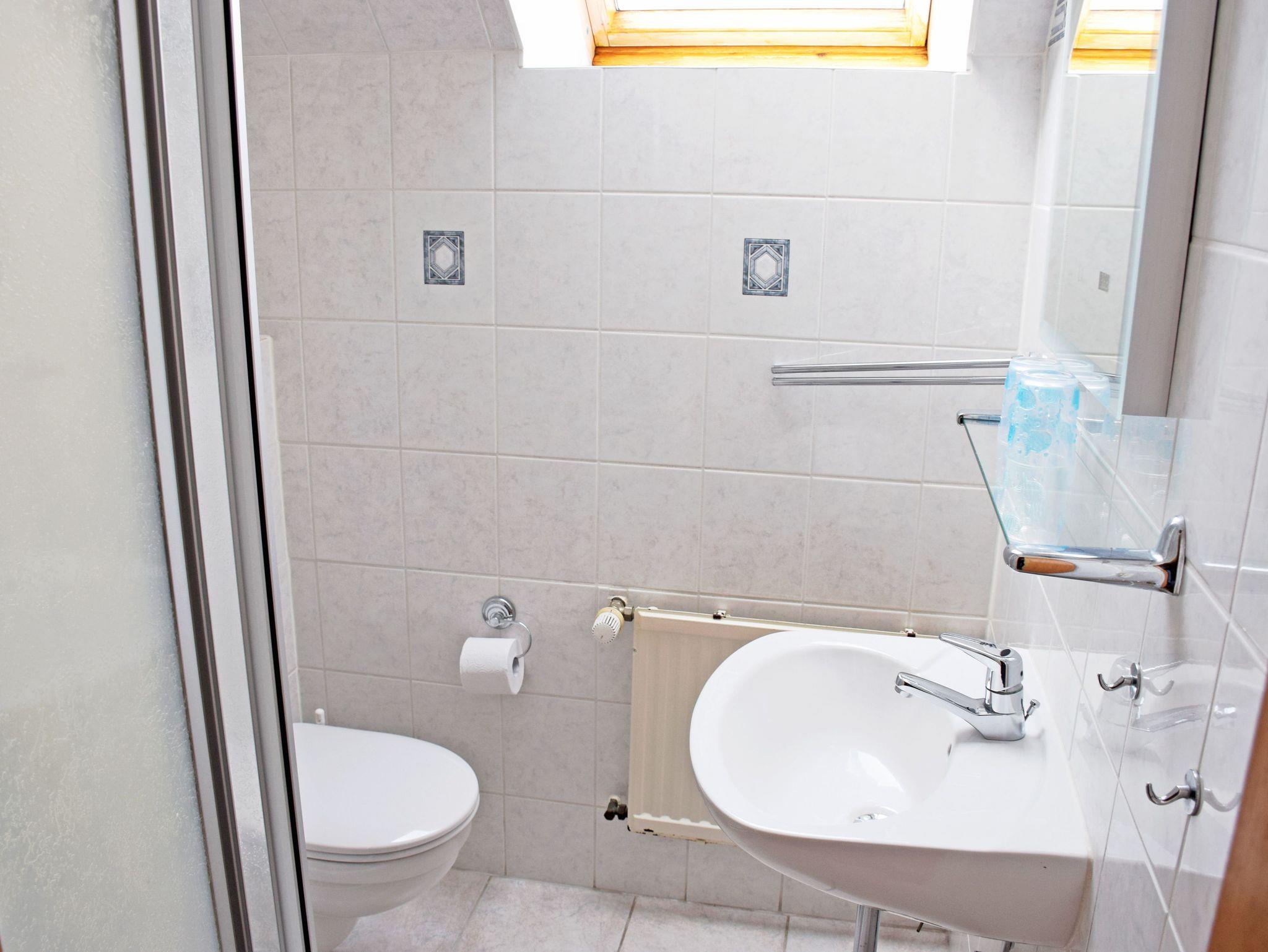 Das Bad verfügt über WC und Dusche und Tageslicht.