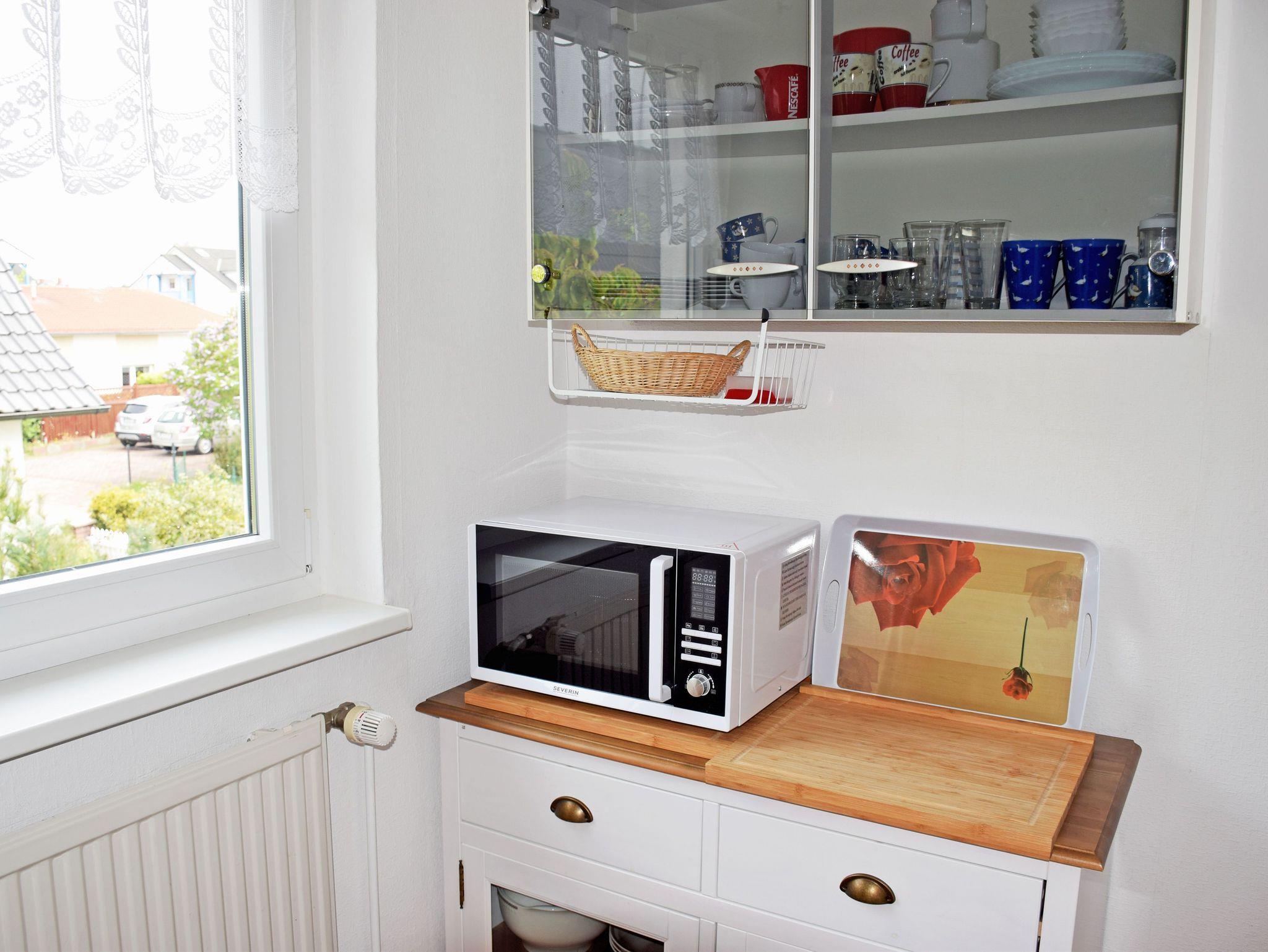 In der separaten Küche stehen ein kleiner Esstisch mit Stühlen und eine Küchenzeile. Die Küchenzeile ist mit einem Herd, Mikrowelle, Wasserkocher, Kaffeemaschine, Toaster, Spüle und Kühlschrank ausgestattet.