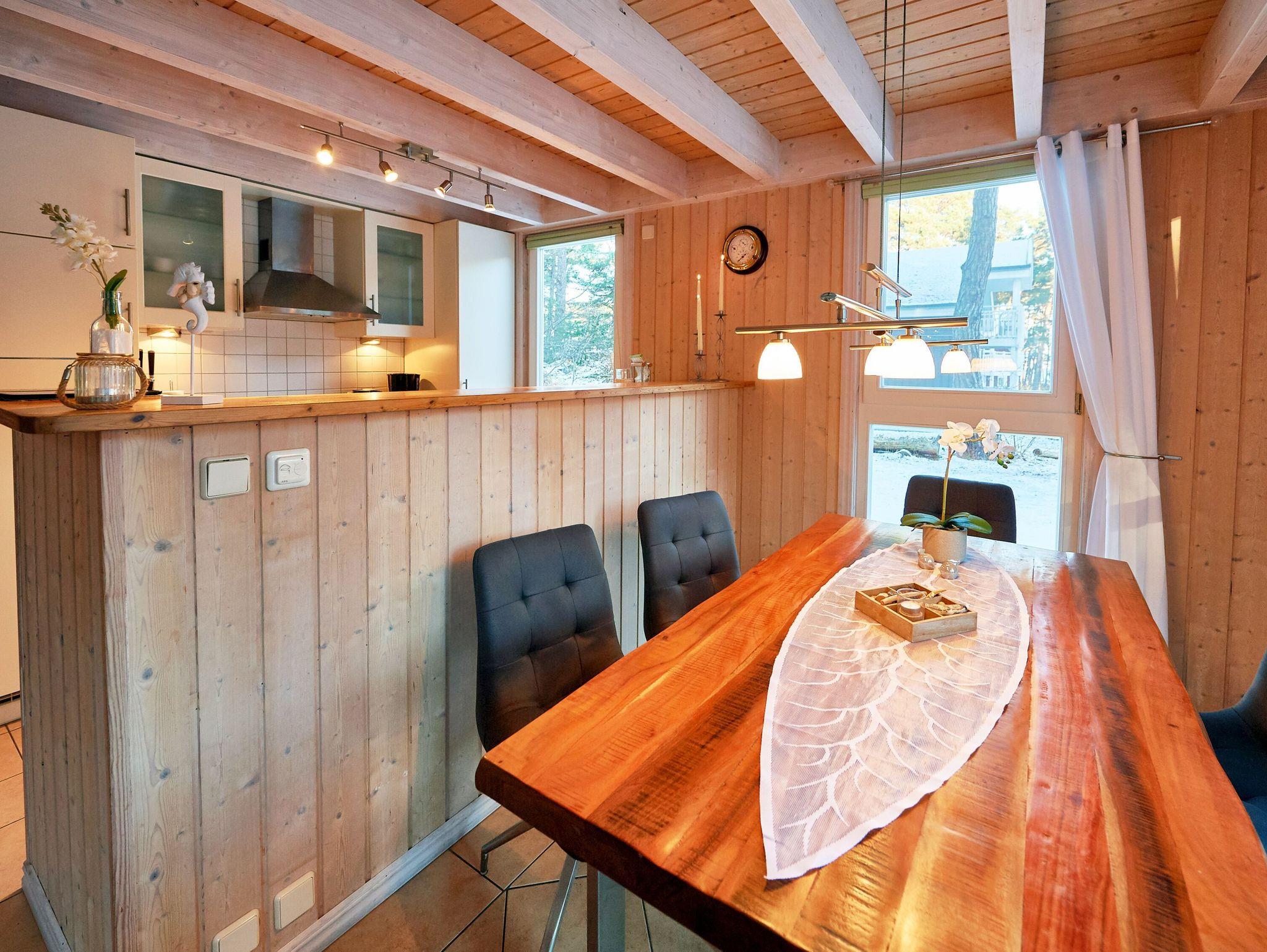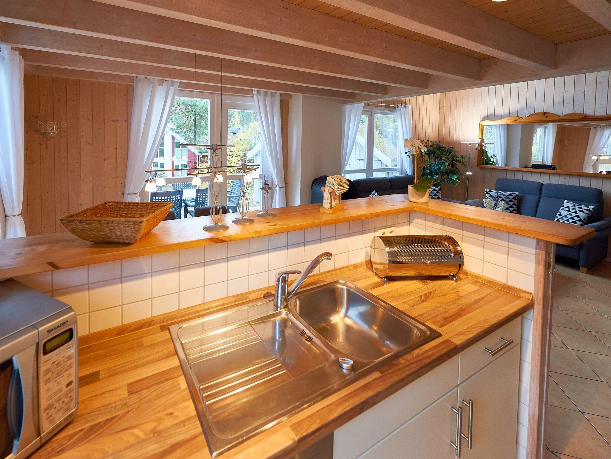 Im Erdgeschoss befindet sich das kombinierte Wohn-/Esszimmer mit großem Esstisch, einer bequemen Polsterecke, Kaminofen, Flachbild-TV und Stereoanlage. Die vorgelagerte Terrasse ist saisonal von ca. Mai bis Ende September möbliert. Die harmonisch in den Raum integrierte Küchenzeile ist mit einem 4-Platten-Cerankochfeld, Backofen, Kühlschrank, Geschirrspülmaschine, Mikrowelle und diversem Kleininventar ausgestattet, so dass man sich bequem selbst bekochen kann. In fußläufiger Entfernung vom Ferienhaus gibt es darüber hinaus einige einladende Restaurants und natürlich auch einen Backshop.