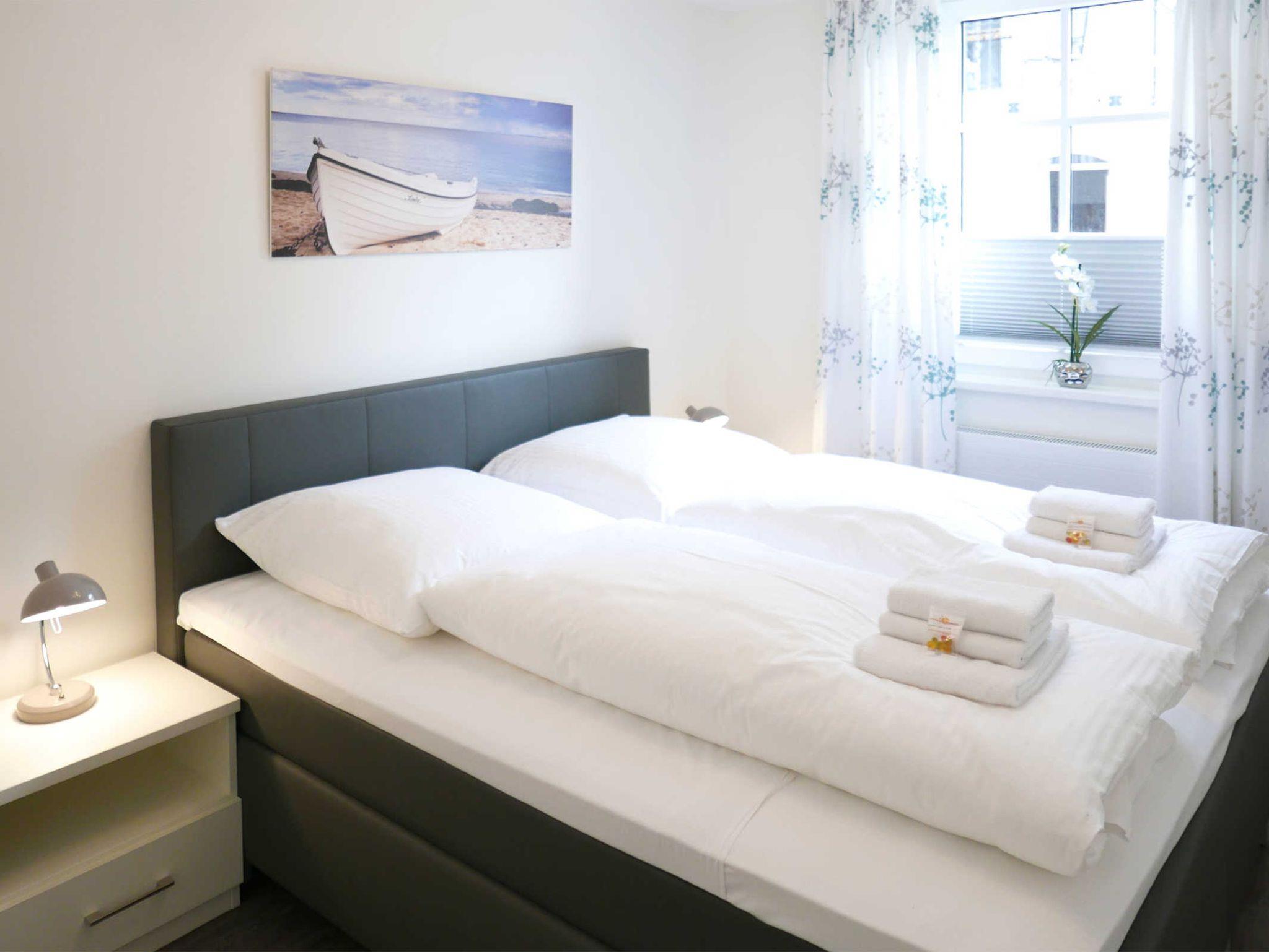 Moderne 2-Zimmer-Ferienwohnung für 2 Personen mit gemütlichem Sofabereich, hochwertiger Ausstattung und großzügiger Terrasse im Haus Meeresblick. Von hier haben Sie einen direkten Zugang zum Strand. Das Haus ist mit einem Fahrstuhl, einer Tiefgarage und einem großen Wellnessbereich mit Schwimmbad (ca. 8,00 m x 4,00 m - 1,35 m tief), zwei Saunen (eine finnische Sauna/eine Bio-Sauna) und einem Massagebereich ausgestattet.