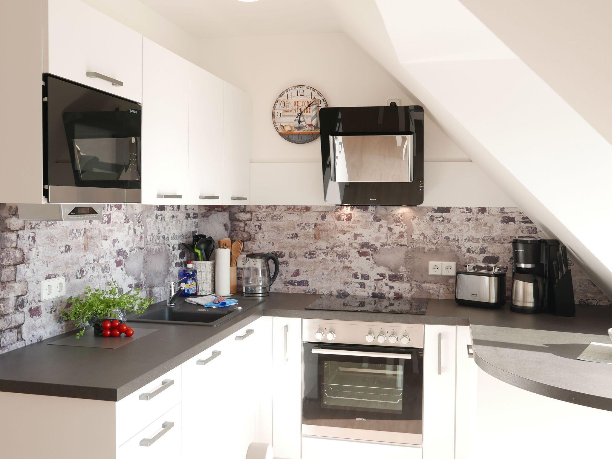 Die moderne Küche ist ausgestattet mit einem Herd, einem Kühlschrank mit Gefrierfunktion, einem Backofen, einer Mikrowelle, einer Geschirrspülmaschine, einer Kaffeemaschine, sowie einem Toaster.