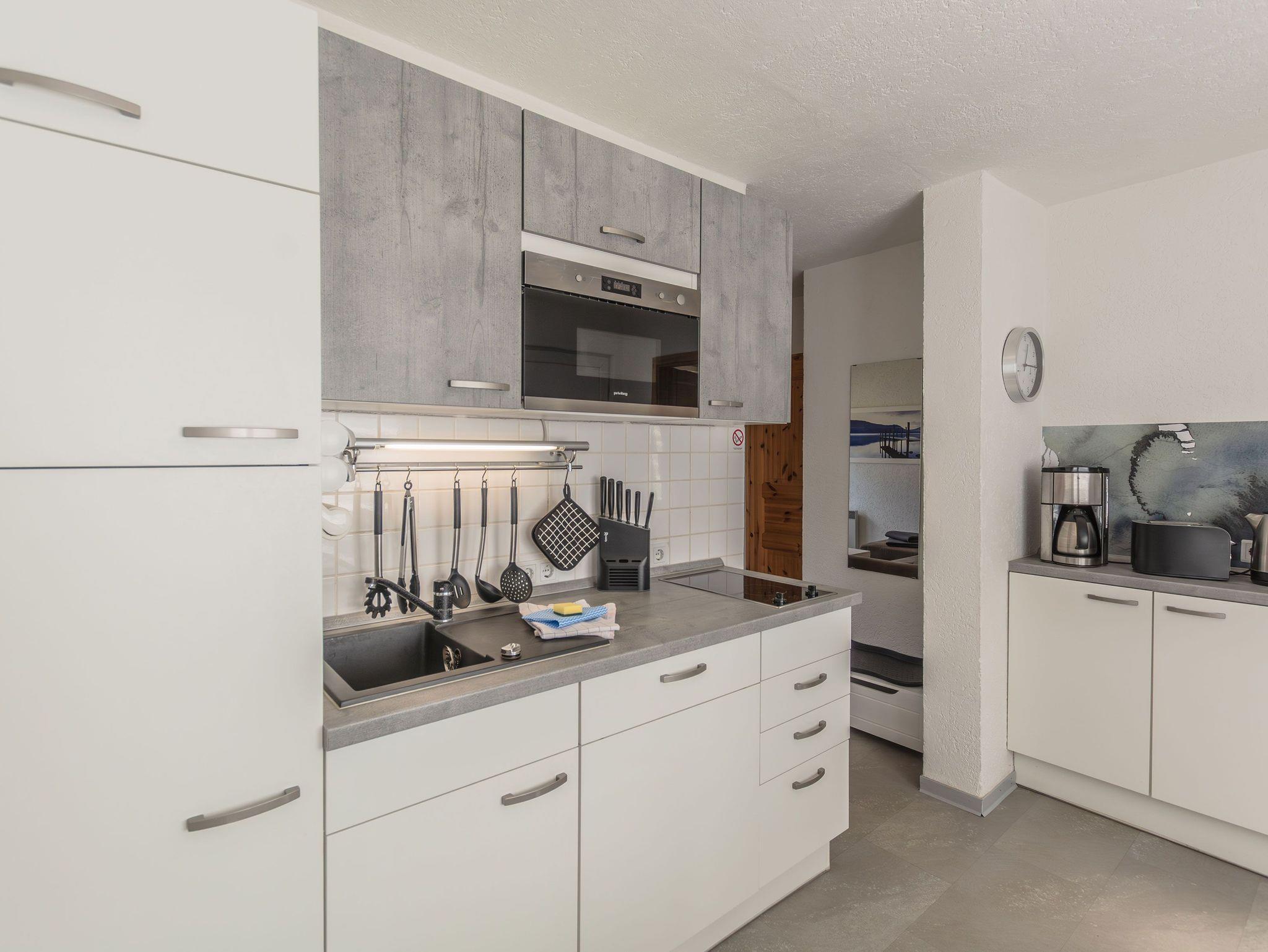 Die offene Küche ist mit einem kleinen Kochfeld, einem Geschirrspüler, einem Kühlschrank mit Tiefkühlfach, Kaffeefiltermaschine, Wasserkocher, Toaster sowie einer Mikrowelle ausgestattet. Ein kleiner Essbereich rundet das Gesamtangebot ab. Im Schlafbereich befindet sich ein Doppelbett (140 x 200) und ein Kleiderschrank.