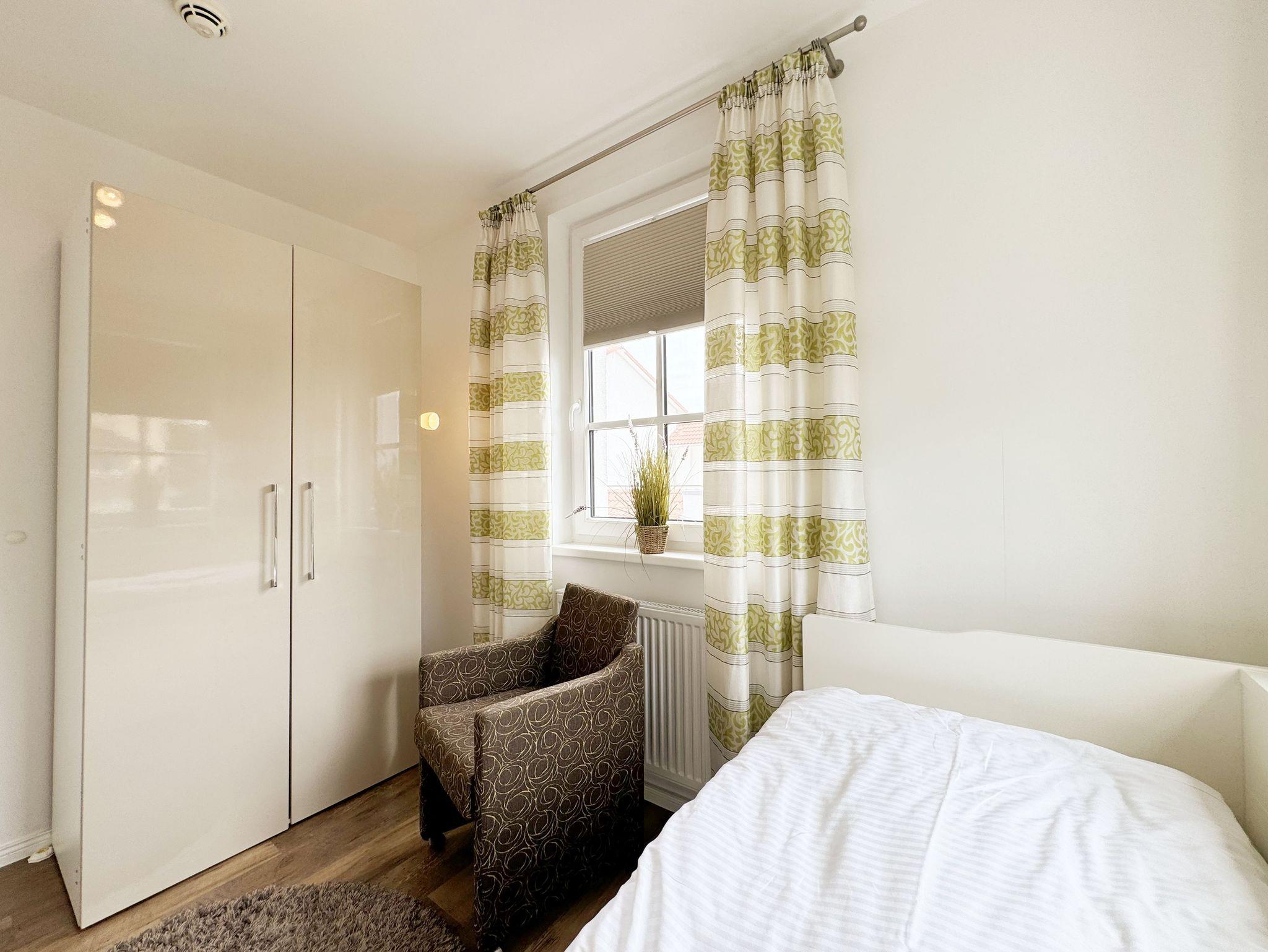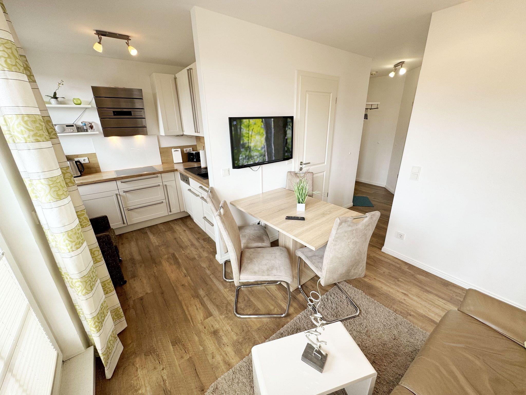 Herzlich Willkommen in Ihrer Nichtraucher/Ferienwohnung, die mit viel Liebe zum Detail ausgestattet und eingerichtet worden ist. Sie wohnen in einer 3-Zimmer Wohnung (ca. 44 qm), die für 2 bis 4 Personen ausgelegt ist. Die Wohnung A 3.19 befindet sich in der 2. Etage und ist per Fahrstuhl vom Haupthaus durch den Flur bequem zu erreichen. In der hellen Wohnung finden Sie einen kombinierten Wohn-, Koch- und Essbereich. Die moderne integrierte Küchenzeile lässt keine Wünsche offen. Eine Mikrowelle mit Grillfunktion, Ceranfeld, moderne Abzugshaube, Spülmaschine, Kühlschrank mit Gefrierfach, Kaffeemaschine und andere praktische Helfer lassen beim Kochen keine Wünsche offen. Ein Essplatz mit 4 Stühlen ist im Küchenbereich integriert. In dem sich anschließenden Wohnbereich ist eine gemütliche Couch, eine Leselampe, LCD-TV, und ein DAB-Radio vorhanden. Auch auf einen Internetanschluss (WLAN) müssen Sie im Urlaub nicht verzichten. Dieser ist für Sie inklusive! Durch die großen lichtdurchfluteten Balkonfenster gelangen Sie direkt auf den bestuhlten Balkon mit Sonnenschirm, der mit einer Südausrichtung zum Kurpark und Inselparadies einlädt. Das 1. Schlafzimmer der Wohnung ist mit einem Doppelbett (1,80 m x 2,00 m), Nachttischkonsolen, Kleiderschrank, Smart-TV, Insektenschutzgitter und Verdunklungsplissees liebevoll eingerichtet. Das 2. Schlafzimmer verfügt über ein Kojen Bett (gesamte Liegefläche 1,60 m x 2,00 m für 1 bis 2 Personen) mit hochwertigen Matratzen, welches einfach und bequem zu bedienen ist. Verdunklungsplissees und Fliegenschutzgitter runden den Komfort im 2. Schlafzimmer ab. Das moderne Bad ist mit einer ebenerdigen Dusche mit Klarglasfront, Waschtisch, WC, Haartrockner und einem Handtuchheizkörper ausgestattet. Für unsere kleinen Gäste haben Sie 1x Kinderhochstuhl in der Wohnung inklusive. Ein eigener PKW-Stellplatz (123, Einfahrtshöhe 2,00m) befindet sich in der Tiefgarage des Hauses. Im Keller des Hauses haben Sie die Möglichkeit eine Waschmaschine/Trockner gegen Gebühr zu nutzen. Mit dem Fahrstuhl des Hauses A gelangen sie in das Untergeschoss der Meeresblickanlage, wo Sie ein großzügiger und heller Wellnessbereich erwartet. Hier können sie in einem Pool kleine Bahnen schwimmen, in 2 Saunen Ihren Kreislauf in Schwung bringen, in einem dazugehörigen Ruheraum Ihren Körper wieder beruhigen, in einer Schneckendusche sowie weiteren Duschen das kühle Nass genießen und auf einer Außenterrasse mit Außendusche die frische Luft einatmen. Die Erstausstattung eines Wäschepaketes (komplette Bettwäsche, 1 Duschhandtuch, 2 kleine Handtücher) können Sie bis 14 Tage vor Anreise gegen einen Aufpreis dazu buchen oder durch eigene ergänzen. Ab 2 gebuchten Paketen erhalten Sie einmalig 1 Geschirrhandtuch und 1 Duschvorleger hinzu.