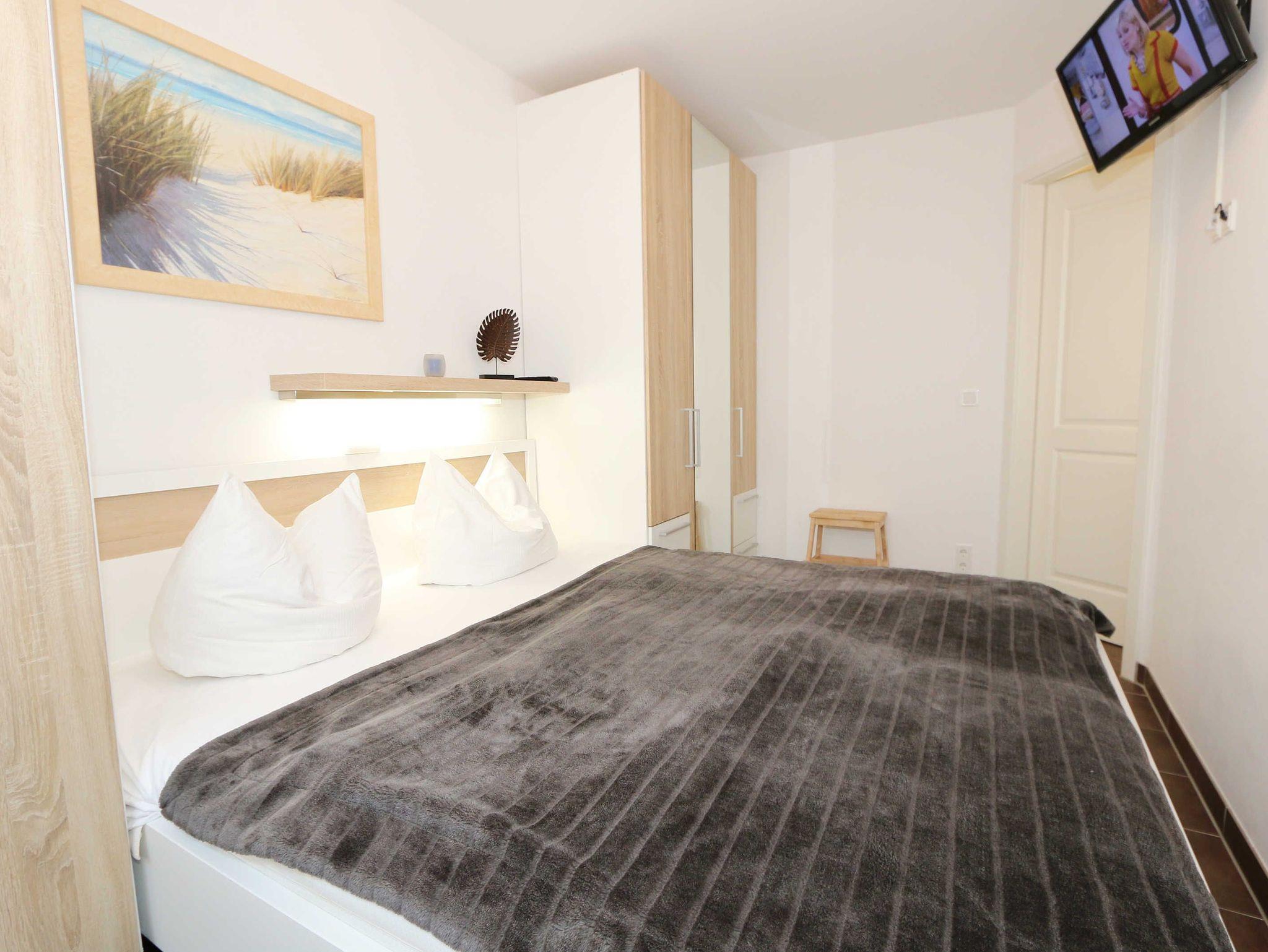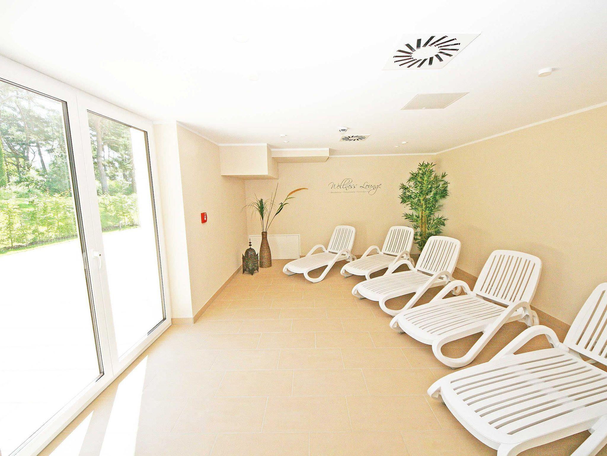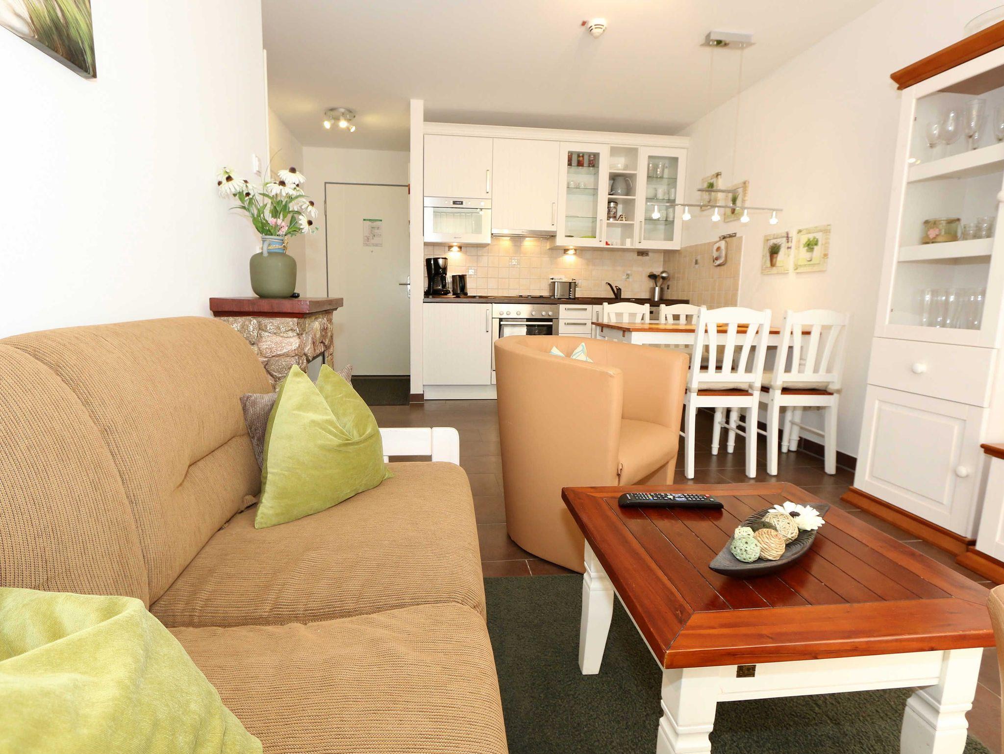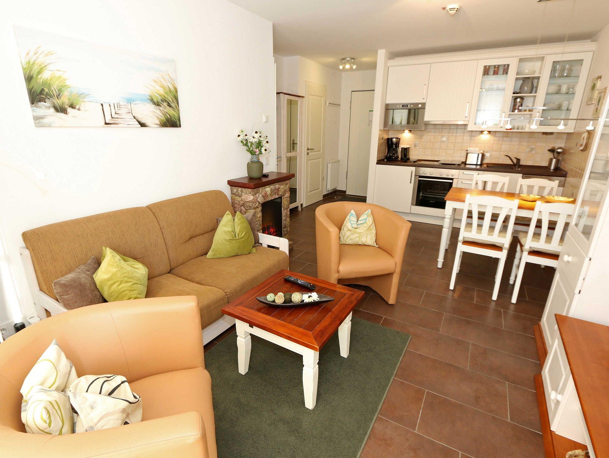 Ihre Nichtraucher/Ferienwohnung ist mit viel Liebe zum Detail ausgestattet und eingerichtet worden. Sie wohnen in einer ca. 40 qm 2-Zimmer Wohnung, die für 2 bis 4 Personen ausgelegt ist. Die Wohnung A.0.04 befindet sich im Erdgeschoss und ist per Fahrstuhl von der Tiefgarage bequem zu erreichen. In der Wohnung finden Sie einen kombinierten Wohn/Koch- und Essbereich. Die integrierte Küchenzeile lässt mit Mikrowelle, Backofen, Ceranfeld, Spülmaschine, Kühlschrank mit Gefrierfach, Kaffeemaschine, Nespresso Maschine und anderen praktischen Hilfsutensilien keine Wünsche offen. Im Wohnbereich ist eine Essecke, eine gemütliche Couch, die in wenigen Handgriffen zur 2. Schlafstätte umfunktioniert werden kann (1,60m x 2,00m), ein Couchtisch, eine Stehlampe, 2 Vitrinen, ein Sideboard mit Smart-TV, DVD-Player und eine Musikanlage vorhanden. Auch auf einen Internetanschluss (WLAN) müssen Sie im Urlaub nicht verzichten. Dieser ist für Sie inklusive! Die Terrasse ist vom Wohn/Essbereich begehbar und komplett möbliert. Ein Strandkorb gehört auf Ihrer Terrasse von April bis Oktober für Sie dazu. Das Schlafzimmer ist mit einem Doppelbett (1,80m x 2,00m), Nachttischkonsolen mit Beleuchtung, einem Kleiderschrank, eine Kleiderablage, einen Safe und ein 2. Smart-TV ausgestattet. Das Bad verfügt über eine ebenerdige Dusche, einen Waschplatz, ein WC, ein Handtuchheizkörper, ein Kosmetikspiegel sowie einen festinstallierten Fön. Im Abstellraum befinden sich Reinigungsutensilien sowie ein Wäscheständer. Ein eigener PKW-Stellplatz (Nr.81, Einfahrtshöhe 2,00 m) befindet sich in der Tiefgarage des Hauses. Im Keller des Hauses haben Sie die Möglichkeit eine Waschmaschine/Trockner gegen Gebühr zu nutzen. Keine Haustiere erlaubt!! (Menschen mit Tierhaarallergie vor Buchung der Wohnung Kontakt mit dem Vermieter aufnehmen). Mit dem Fahrstuhl des Hauses A gelangen sie in das Untergeschoss der Meeresblickanlage, wo Sie ein großzügiger und heller Wellnessbereich erwartet. Hier können sie in einem Pool kleine Bahnen schwimmen, in 2 Saunen Ihren Kreislauf in Schwung bringen, in einem dazugehörigen Ruheraum Ihren Körper wieder beruhigen, in einer Schneckendusche sowie weiteren Duschen das kühle Nass genießen und auf einer Außenterrasse mit Außendusche die frische Luft einatmen. Die Erstausstattung eines Wäschepaketes (komplette Bettwäsche, 1 Duschhandtuch, 2 kleine Handtücher) können Sie bis 14 Tage vor Anreise gegen einen Aufpreis dazu buchen oder durch eigene ergänzen. Ab 2 gebuchten Paketen erhalten Sie einmalig 1 Geschirrhandtuch und 1 Duschvorleger hinzu.