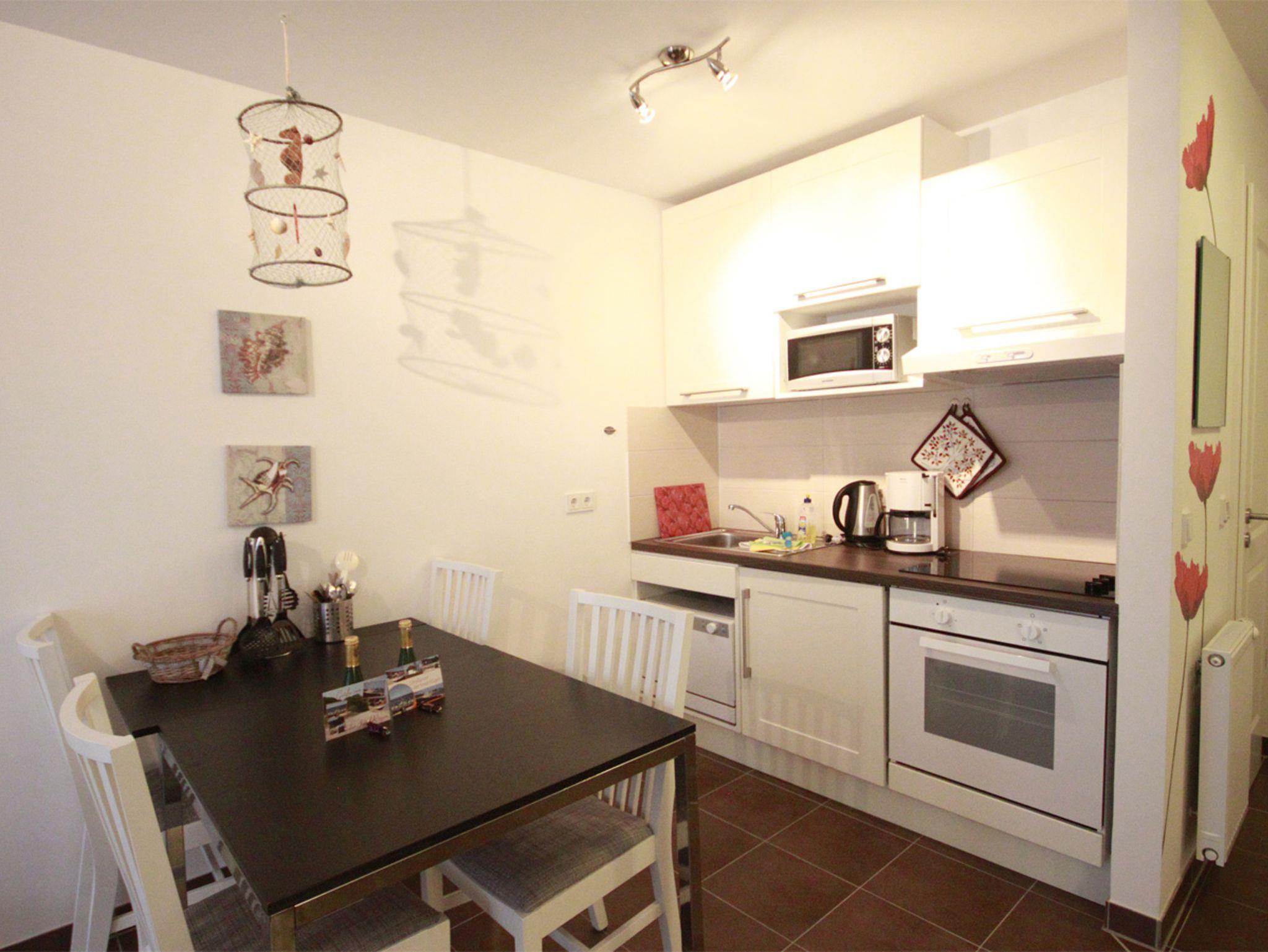 Die integrierte Küchenzeile ist mit 4-Plattenherd, Backofen, Kühlschrank mit Gefrierfach, Geschirrspülmaschine, Kaffeemaschine, Toaster und Mikrowelle ausgestattet.