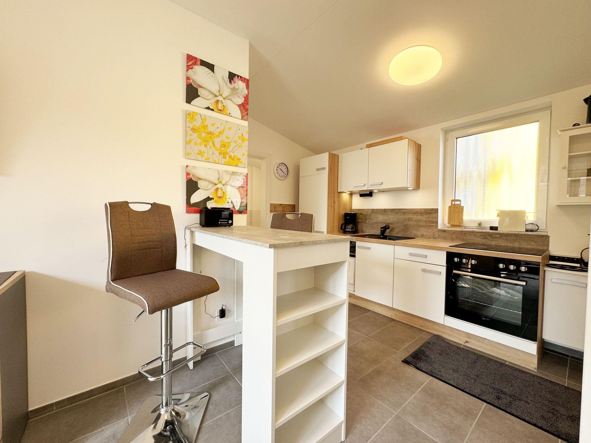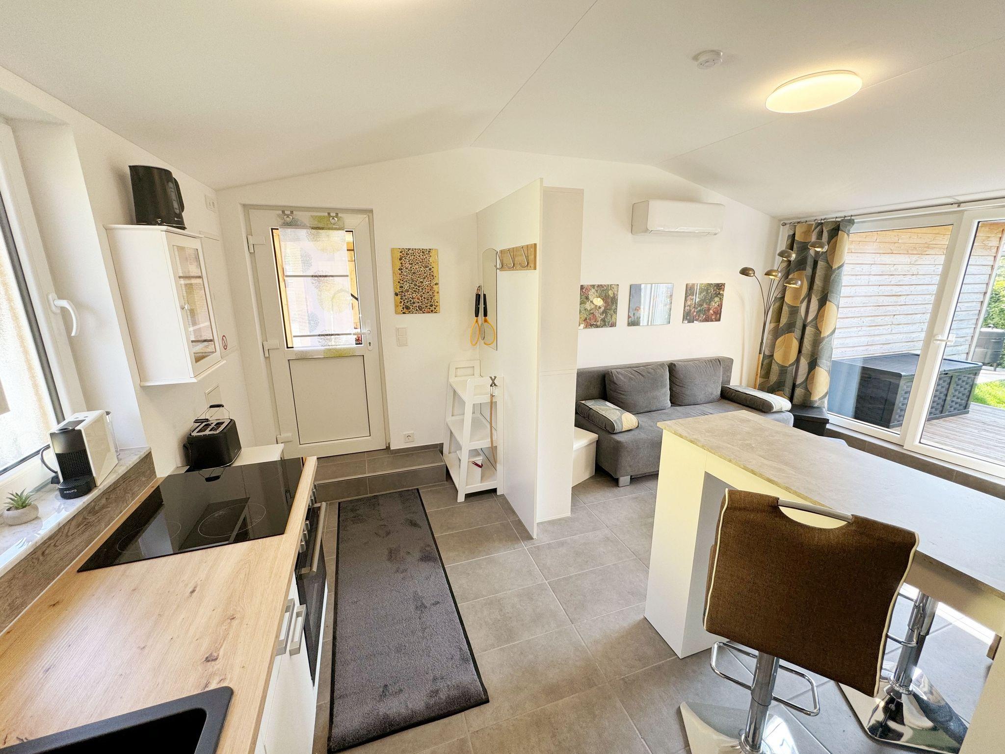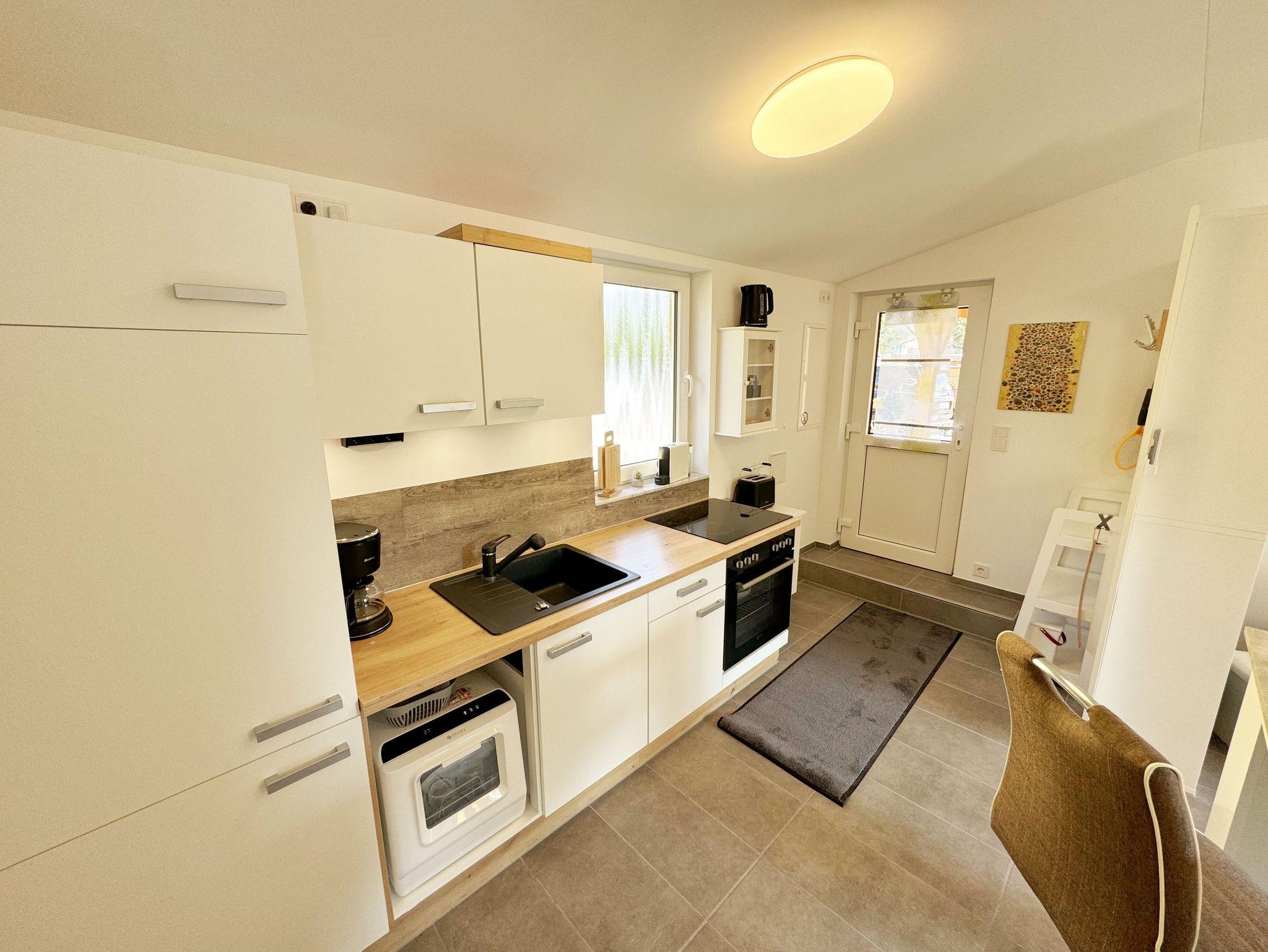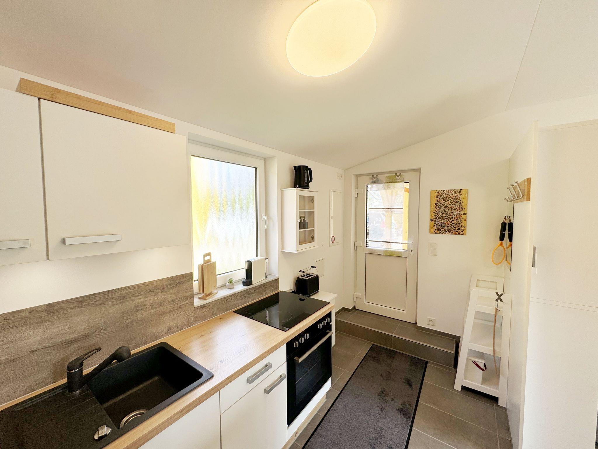 Der 2024 fertiggestellte, gemütliche und liebevoll eingerichtete Bungalow Nr.02 „Fantasie“ bietet Ihnen Platz für max. 2 Personen. Der Nichtraucher Bungalow umfasst ca. 40 m². Beim Betreten des Hauses befindet sich die offene Küchenzeile welche mit einem Cerankochfeld, einem Backofen, einer Geschirrspülmaschine, einem Kühlschrank mit Gefrierfach, einem Geschirrspüler, einem Mixer, einer Kaffeemaschine, einer Nespresso Maschine, einem Wasserkocher, einem Toaster und umfangreichen Küchenutensilien ausgestattet ist. Im angrenzenden Wohnbereich rundet ein Essplatz in Form eines Thekentisches mit bequemen Stühlen den Küchenbereich ab. Im Wohnbereich bietet Ihnen eine Couch mit einem Couchtisch, einer Designer-Stehlampe, einem Sideboard mit einem Smart-TV, WLAN und einem DAB-Radio den benötigten Komfort. Das wohnliche Ambiente wird zudem durch einige Fotografien abgerundet. Für viel natürliches Licht sorgt die große Terrassentür. Durch einen kleinen Absatz gelangen Sie hier auf Ihre bestuhlte Terrasse (Süden) mit einem Sonnenschirm, einem Holzkohlegrill sowie einen an der Wand befestigten Wäschetrockner. Im großen Schlafzimmer mit einem Doppelbett (1,80m x 2,00m), Nachttischablagen mit Beleuchtung, einem Kleiderschrank, Verdunklungsmöglichkeit und Insektenschutzgitter können Sie einen erholsamen Schlaf genießen. Im modernen Tageslicht-Bad befindet sich eine ebenerdige Dusche, ein Waschplatz, ein WC, ein Kosmetikspiegel, ein beheizbarer Handtuchtrockner sowie ein Fön. Der gesamte Bungalow ist mit einer hochwertigen Keramikfliese ausgelegt. Für kühle oder heiße Tage können Sie ein Split Gerät (Klima & Wärme), das sich im Wohnbereich befindet, nutzen. Im kleinen Abstellraum, im Eingangsbereich, befindet sich ein Staubsauger, Wischutensilien, sowie ein Besen mit Handfeger und Schaufel. Sie möchten in Ihrem Urlaub Fahrrad fahren? Hierfür finden Sie im angrenzenden Fahrradschuppen zusätzlich 2 Fahrräder mit einer 26 & 28iger Rahmengröße, die Sie gerne nutzen können (kein Vertragsbestandteil) oder Sie bringen gerne auch Ihre eigenen Räder mit, welche Sie hier abstellen können. Ein PKW-Stellplatz (Nr. 2) befindet sich direkt auf dem Grundstück und ist für Sie inklusive. Haustiere sind nicht erlaubt. Die Erstausstattung eines Wäschepaketes (komplette Bettwäsche, 1 Duschhandtuch, 1 kleines Handtuch) können Sie bis 14 Tage gegen einen Aufpreis dazu buchen oder durch eigenes Ergänzen. Ab 2 gebuchten Paketen erhalten Sie einmalig 1 Geschirrhandtuch und 1 Duschvorleger hinzu.