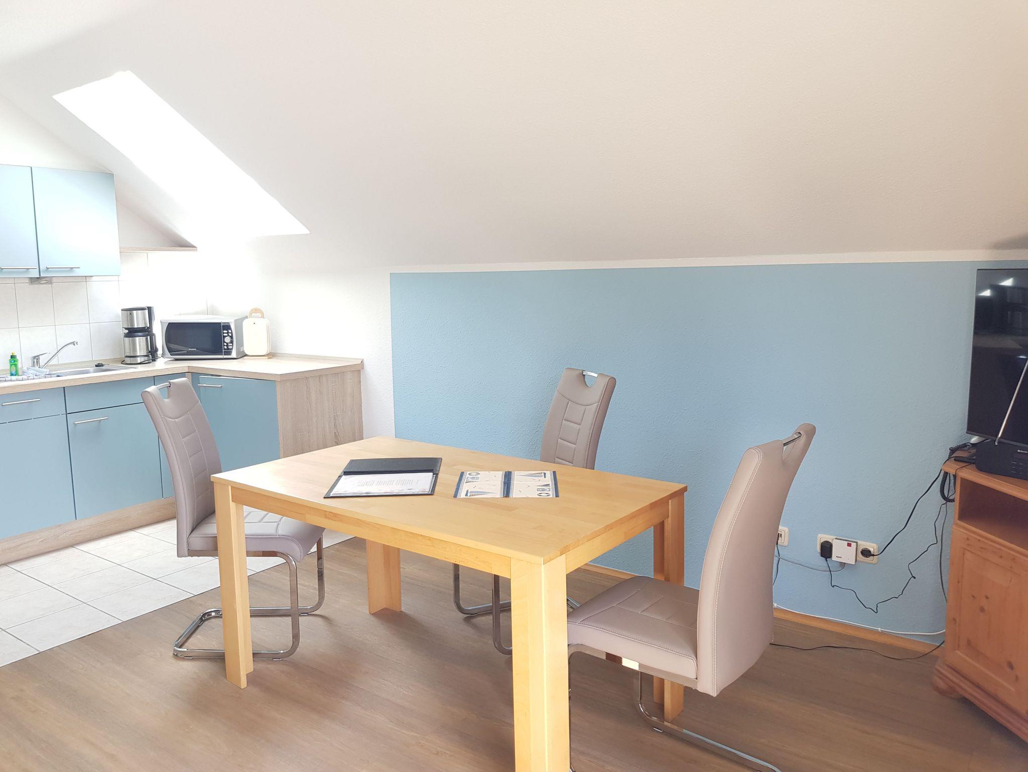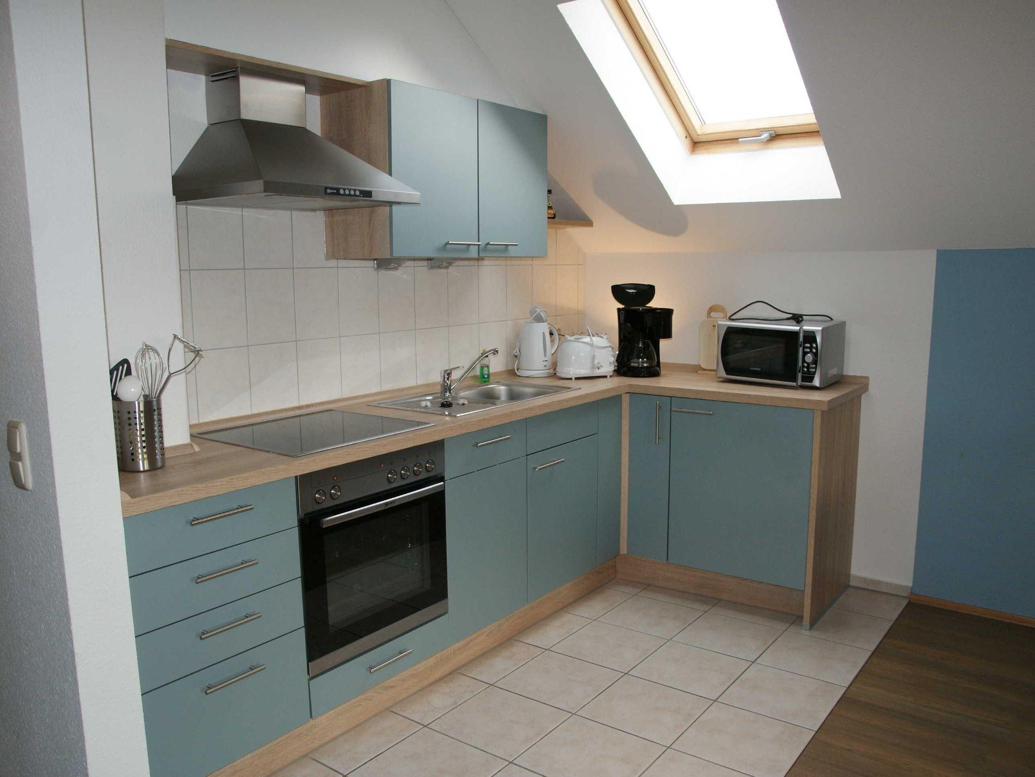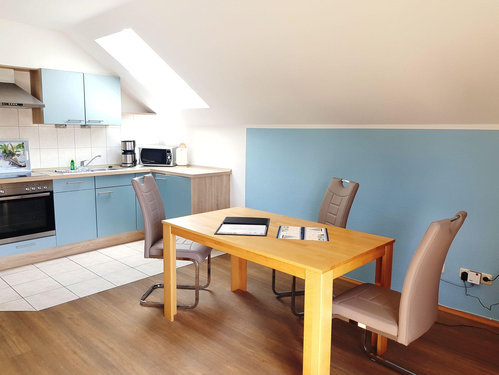 • kombinierten Wohn- und Essbereich mit komplett ausgestatteter Küchenzeile mit 4-Zonen-Ceranfeld, Backofen, Geschirrspüler, Mikrowelle, Kühlschrank, Wasserkocher, Kaffeemaschine, Toaster und diversen Küchenutensilien