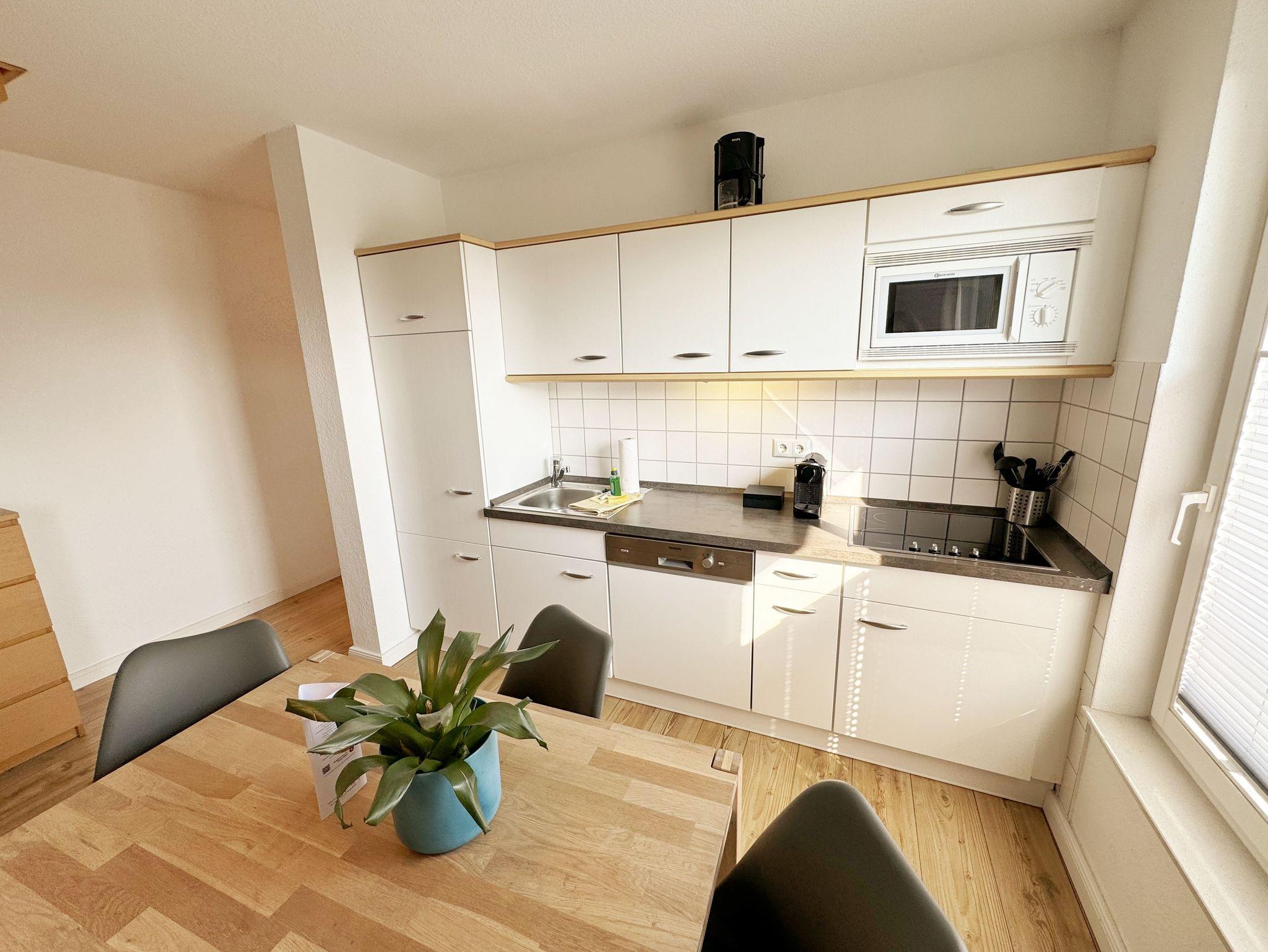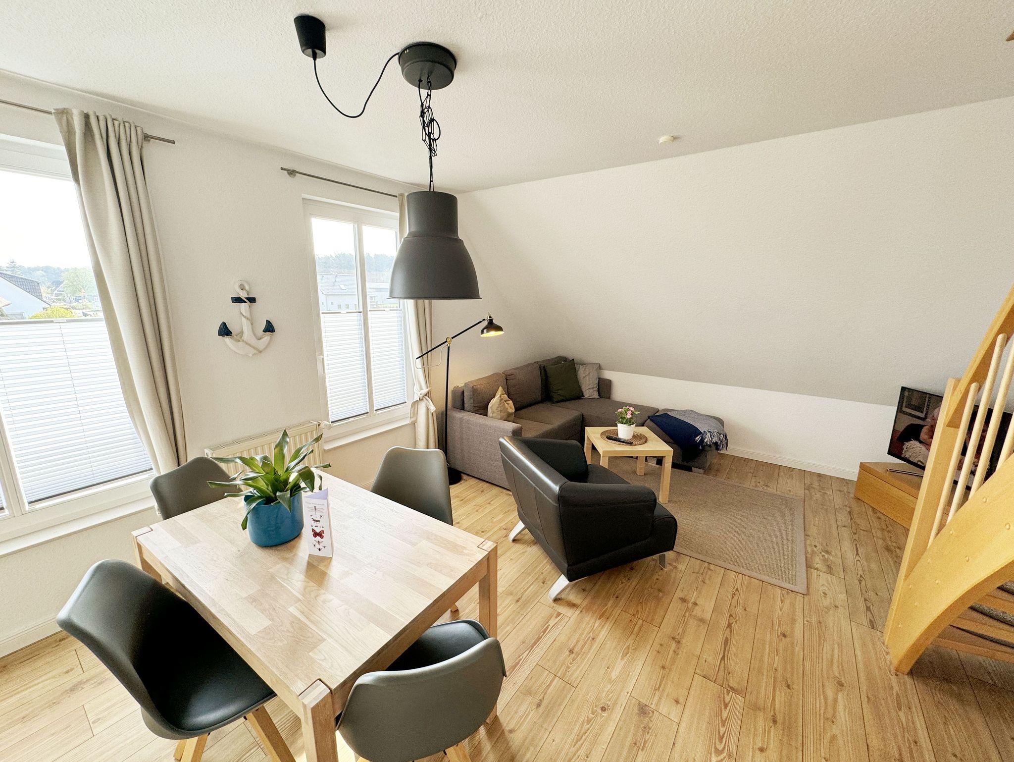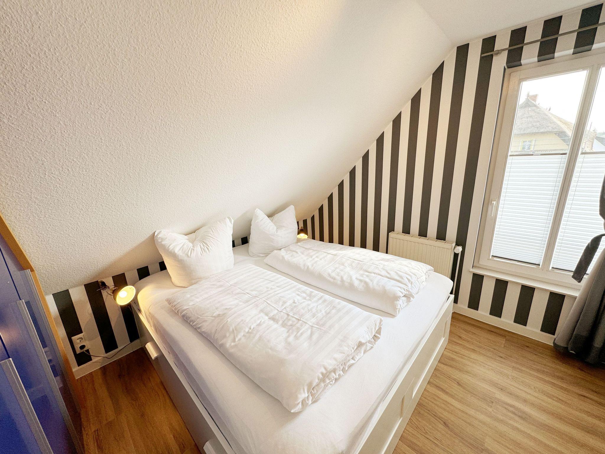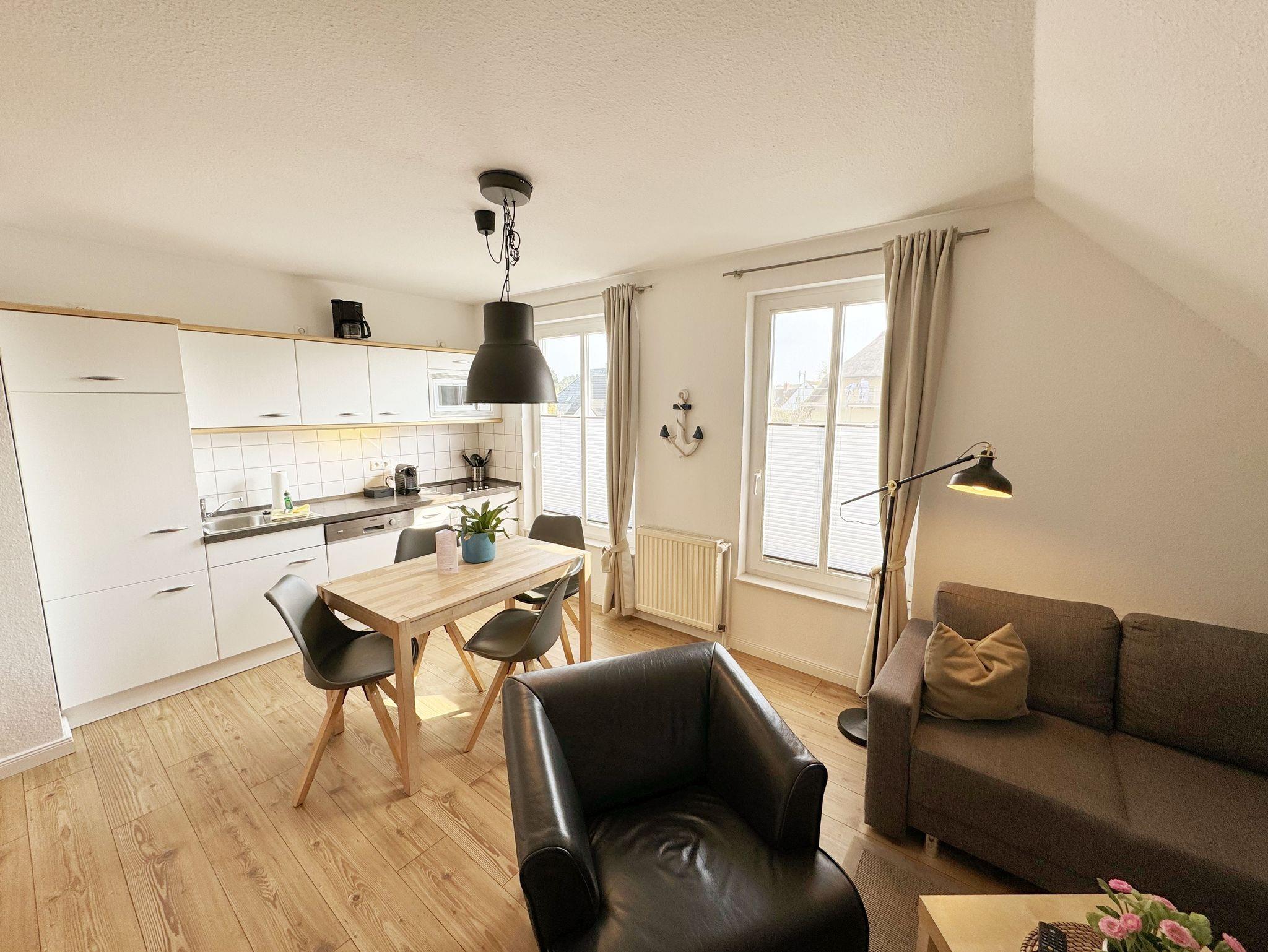 Die 70 qm Nichtraucher-Maisonette-Wohnung ist modern und hell im skandinavischen Stil eingerichtet und bietet Platz für max. 4 Erwachsene + 1 Kleinkind bis 3 Jahre im Kinderreisebett. Fotografien der Insel lassen Sie beim Eintreten auf der Insel ankommen. Über einen kleinen Flur mit Garderobe gelangen Sie direkt in den großen Wohn- und Essbereich mit Einbauküche. Die bodentiefen Fenster mit Absturzsicherung und Insektenschutzgittern sorgen für viel Tageslicht. Der Wohnbereich ist gemütlich gestaltet und lädt zum Entspannen ein. Er verfügt über eine bequeme Eckcouch mit variablem Fußteil, ein Couchtisch, einen Sessel und eine Stehlampe. Hier können Sie es sich gemütlich machen, einen Film auf dem 32-Zoll-Smart-TV genießen oder der Musik aus dem Bluetooth-Radio lauschen. Ein WLAN-Anschluss rundet den technischen Bereich ab. In dem Sideboard finden Sie ausreichend Stauraum für Ihre persönlichen Gegenstände. Zusätzlich befindet sich dort eine Spielesammlung für die ganze Familie sowie eine kleine Auswahl an Büchern. Die Einbauküche beinhaltet alles, was Sie zur Zubereitung Ihrer Mahlzeiten benötigen. Wie ein Induktionsherd, ein Kühlschrank mit Gefrierfach, eine Mikrowelle und ein Geschirrspüler. Darüber hinaus steht Ihnen sowohl eine Filter-Kaffeemaschine als auch eine Nespresso-Kapselmaschine, ein Wasserkocher, ein Toaster, ein Messerblock sowie viele Kochutensilien zur Verfügung. Ein Esstisch rundet den Küchenbereich ab. Von hier aus gelangen Sie über eine Treppe in den oberen Schlafbereich. Hier befinden sich zwei Einzelbetten (je 0,90m x 2,00m), die auch zu einem Doppelbett verschoben werden können, verstellbare Lattenroste, zwei Nachttischablagen mit Leseleuchten, ein Kleiderschrank sowie ein Verdunklungsrollo. Der Raum bietet dazu Platz, um ein Kinderreisebett aufzustellen. Die Treppe ist dazu durch ein Treppenschutzgitter gesichert. Das unter Schlafzimmer verfügt über ein komfortables Doppelbett (1,60m x 2,00m) mit Wand-Nachttischlampe, verstellbare Lattenroste sowie ein geräumiger Kleiderschrank. Die bodentiefen Fenster sind mit Verdunklungsvorhängen und Insektenschutzgitter ausgestattet, um Ihnen einen erholsamen Schlaf zu ermöglichen. Das kompakte Tageslicht-Bad ist funktional gestaltet und verfügt über eine Eck-Dusche, ein Fön, ein WC, ein Waschplatz und ein Insektenschutzgitter. Eine Ablage bietet Platz für Kosmetikutensilien und ein beleuchteter Spiegel sorgt für die richtige Ausleuchtung. Ebenso finden Sie in Ihrer Wohnung einen Wäscheständer, Reinigungsutensilien und einen Standventilator vor. Wenn es Sie nach draußen zieht, so steht Ihnen ein 2500 qm großer Gemeinschaftsgarten zur Verfügung, der zum Verweilen einlädt. Dort finden Sie Strandkörbe Sitzgelegenheiten sowie einen Grillplatz, den Sie gemeinsam mit anderen Gästen nutzen können. Ein Haustier ist gegen eine Gebühr ein gern gesehener Gast. Ihre mitgebrachten oder geliehenen Fahrräder können Sie auf dem Grundstück abstellen. Ein PKW-Stellplatz befindet sich direkt am Haus. Die Erstausstattung eines Wäschepaketes (komplette Bettwäsche, 1 Duschhandtuch, 2 kleine Handtücher) können Sie bis 14 Tage vor Anreise gegen einen Aufpreis dazu buchen oder durch eigene ergänzen. Ab 2 gebuchten Paketen erhalten Sie einmalig 1 Geschirrhandtuch und 1 Duschvorleger hinzu.