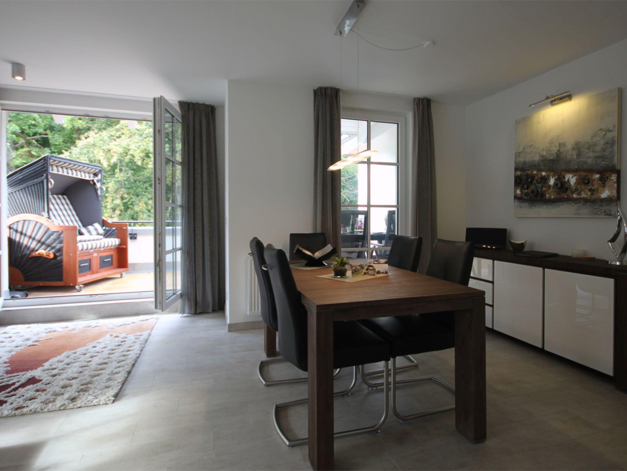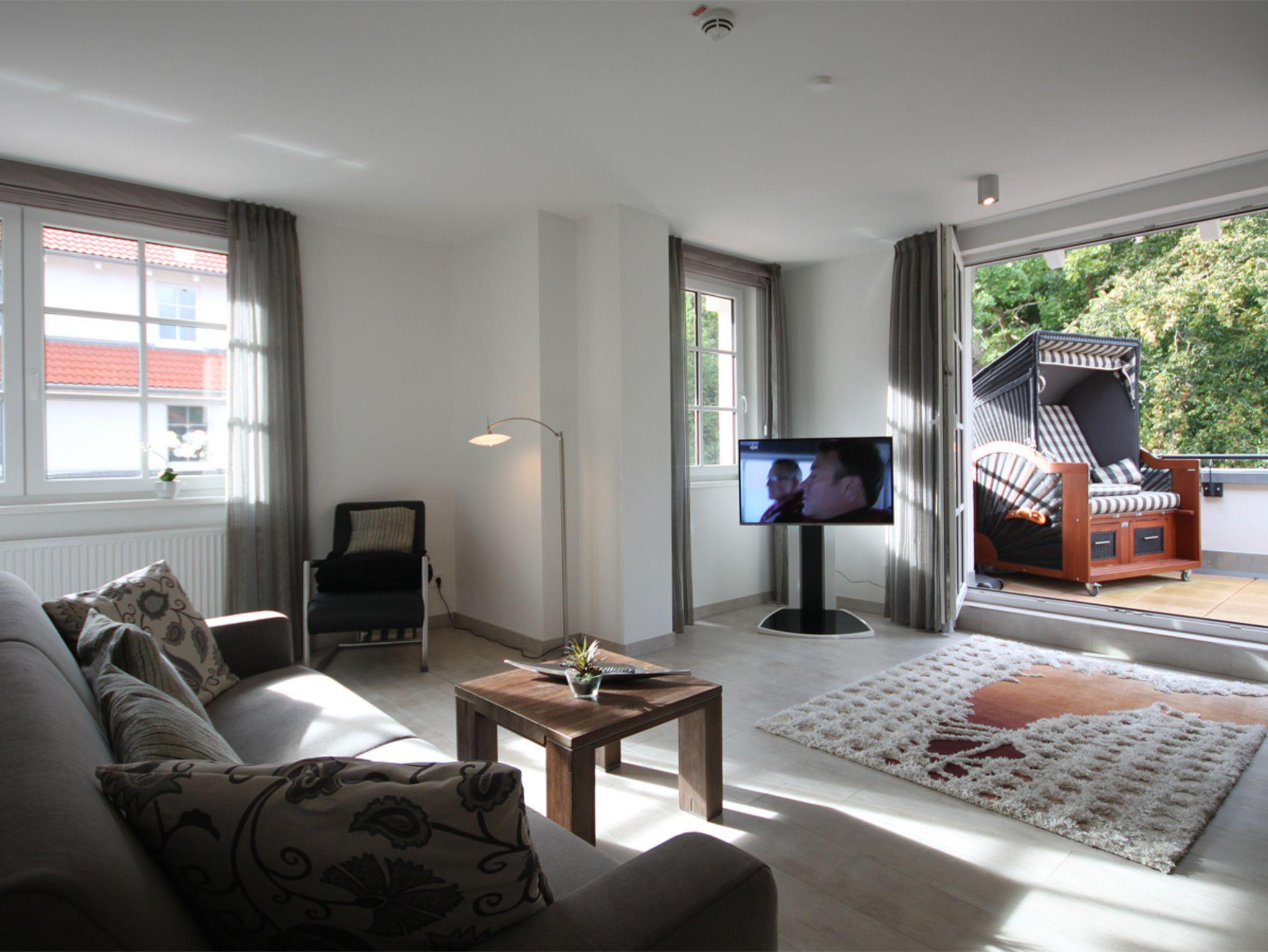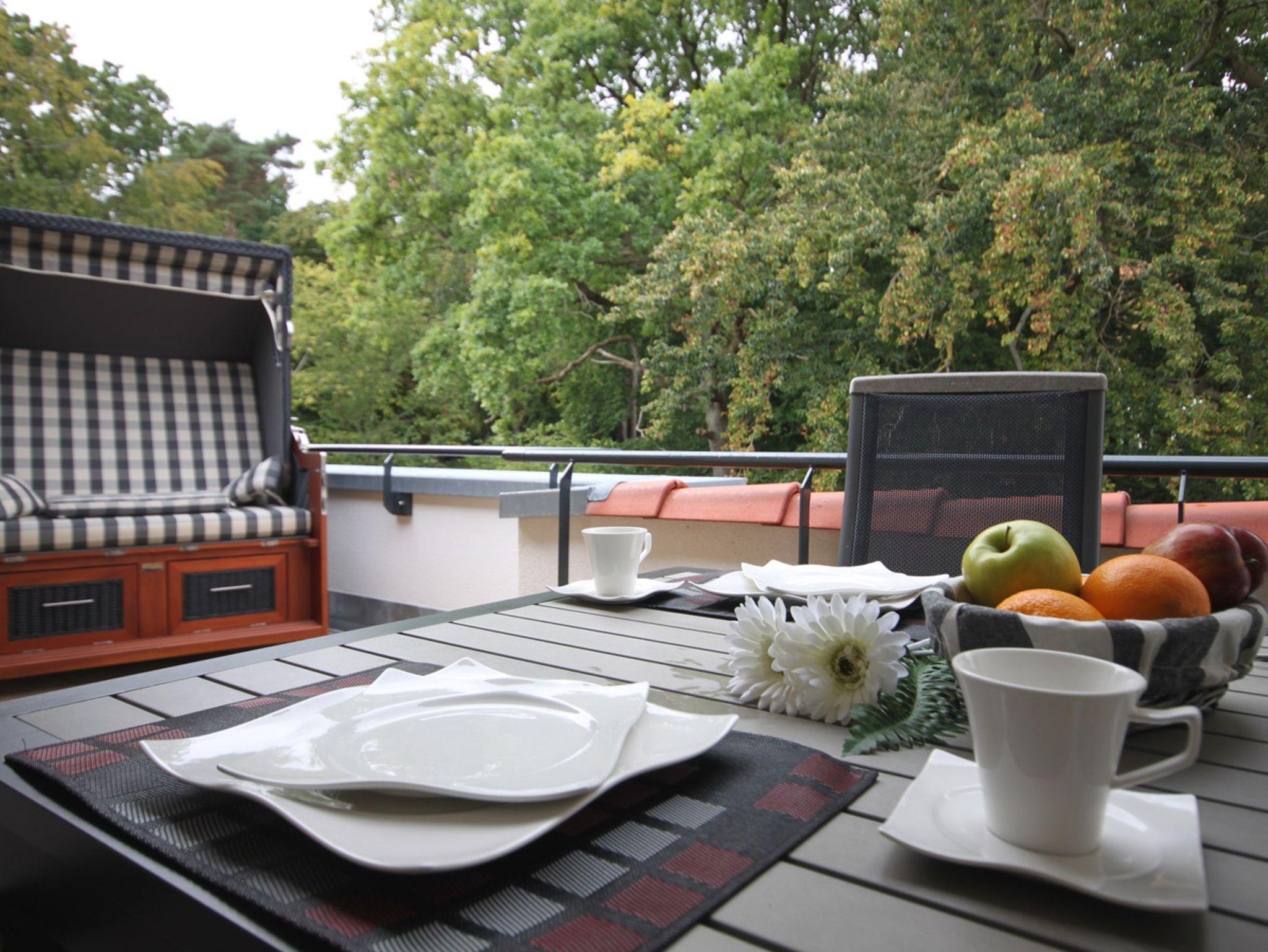Wohnung mit Sonnendecks: Die gleichnamige Ferienwohnung ist ein wahres Luxus-Objekt. Mit einer Wohnfläche von 75 Quadratmetern, zwei Balkonen, einem Gäste-WC und einem Strandkorb im Außenbereich bietet die Wohnung Sonnendeck die perfekte Ausstattung für bis zu vier Personen. Das separate Schlafzimmer mit Doppelbett, TV und Kleiderschrank hat zwei Schlafplätze. Weitere zwei Personen können auf dem Schlafsofa im Wohn-/Essbereich übernachten, wo ebenfalls ein Fernsehgerät aufgestellt ist. Die Wohnung, die sich im dritten Obergeschoss befindet, hat einen großzügig möblierten Balkon mit Strandkorb und einen kleineren zweiten Balkon. Beide sind in Richtung Kiefernwald gelegen. Die Unterkunft ist für vier Personen eingerichtet, der Essbereich sogar für fünf. In der Küchenzeile finden Sie einen Vier-Plattenherd mit Cerankochfeld und Backofen, einen Kühlschrank, eine Mikrowelle, eine Spülmaschine sowie einen Toaster und eine Kaffeemaschine vor.