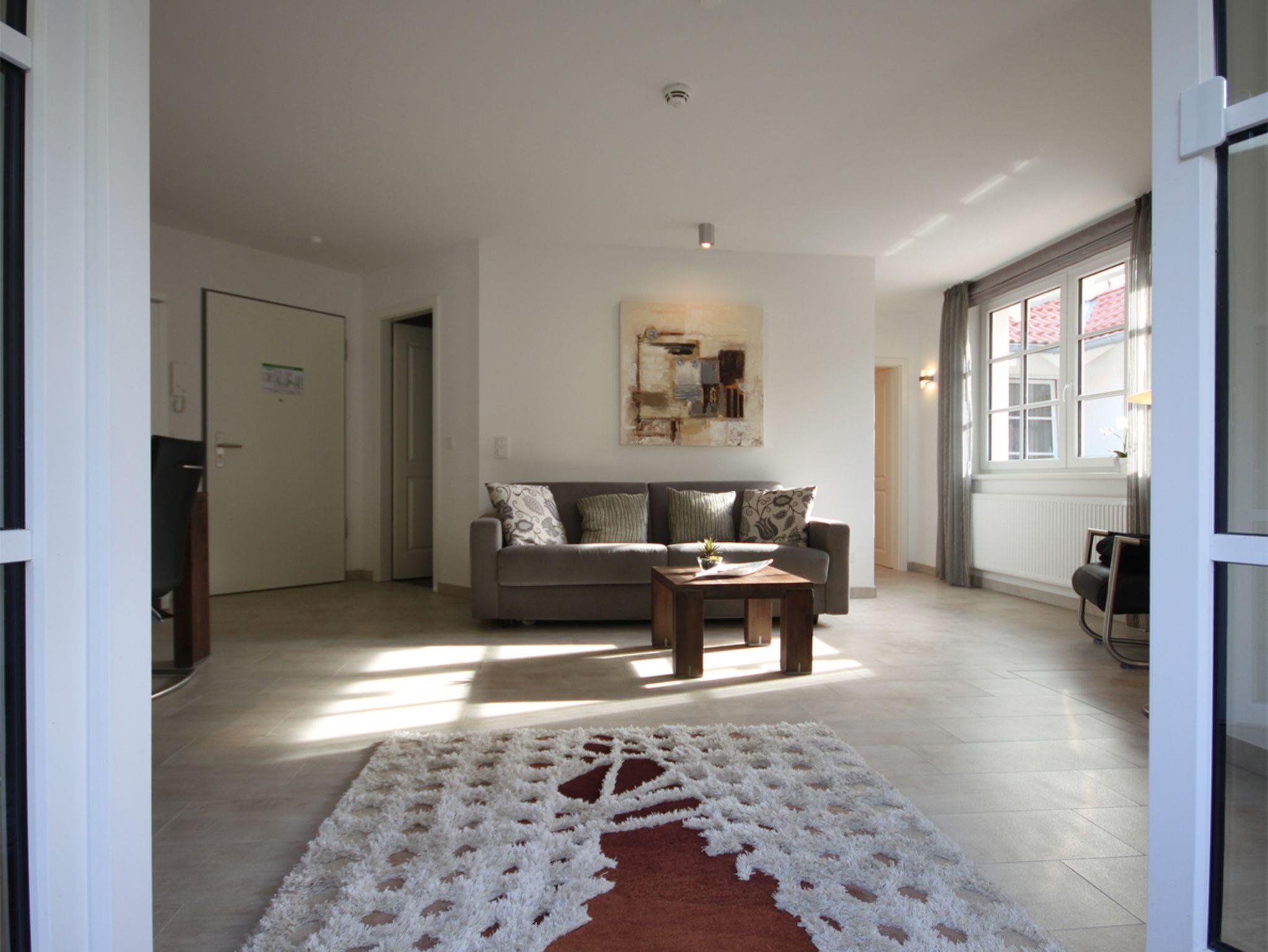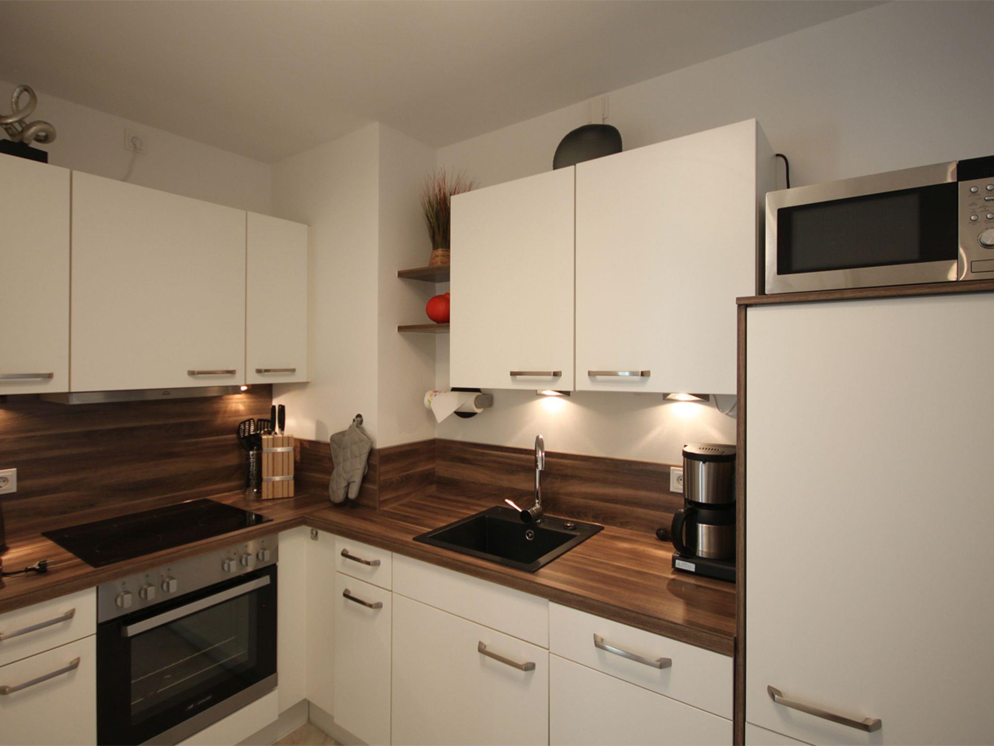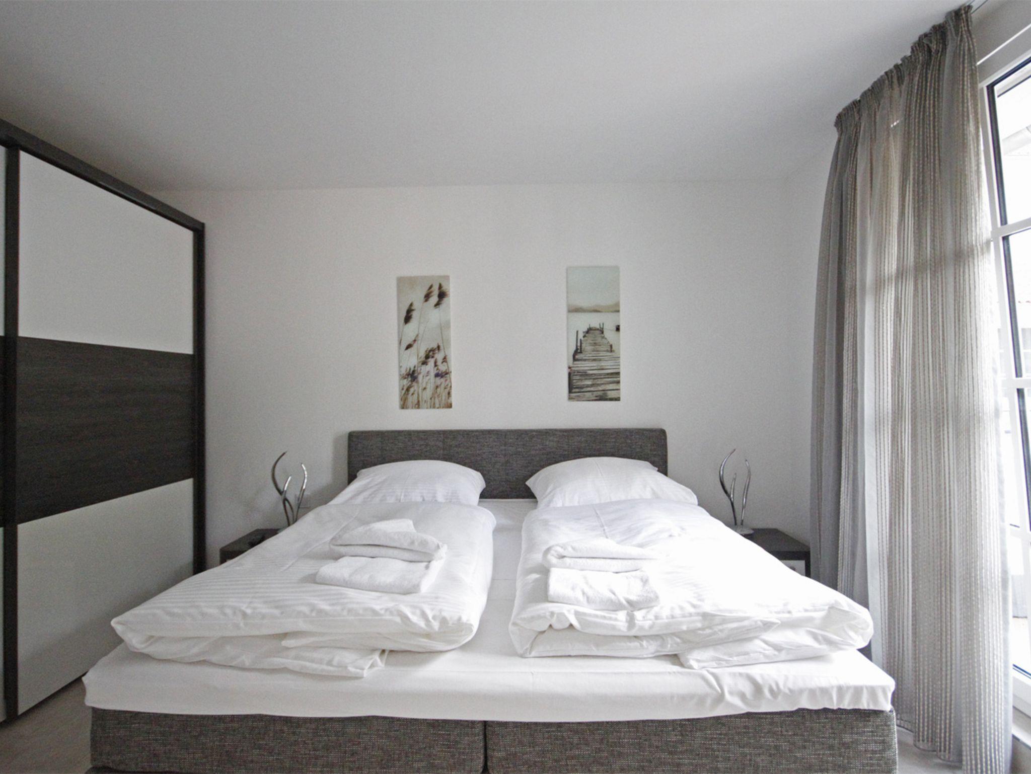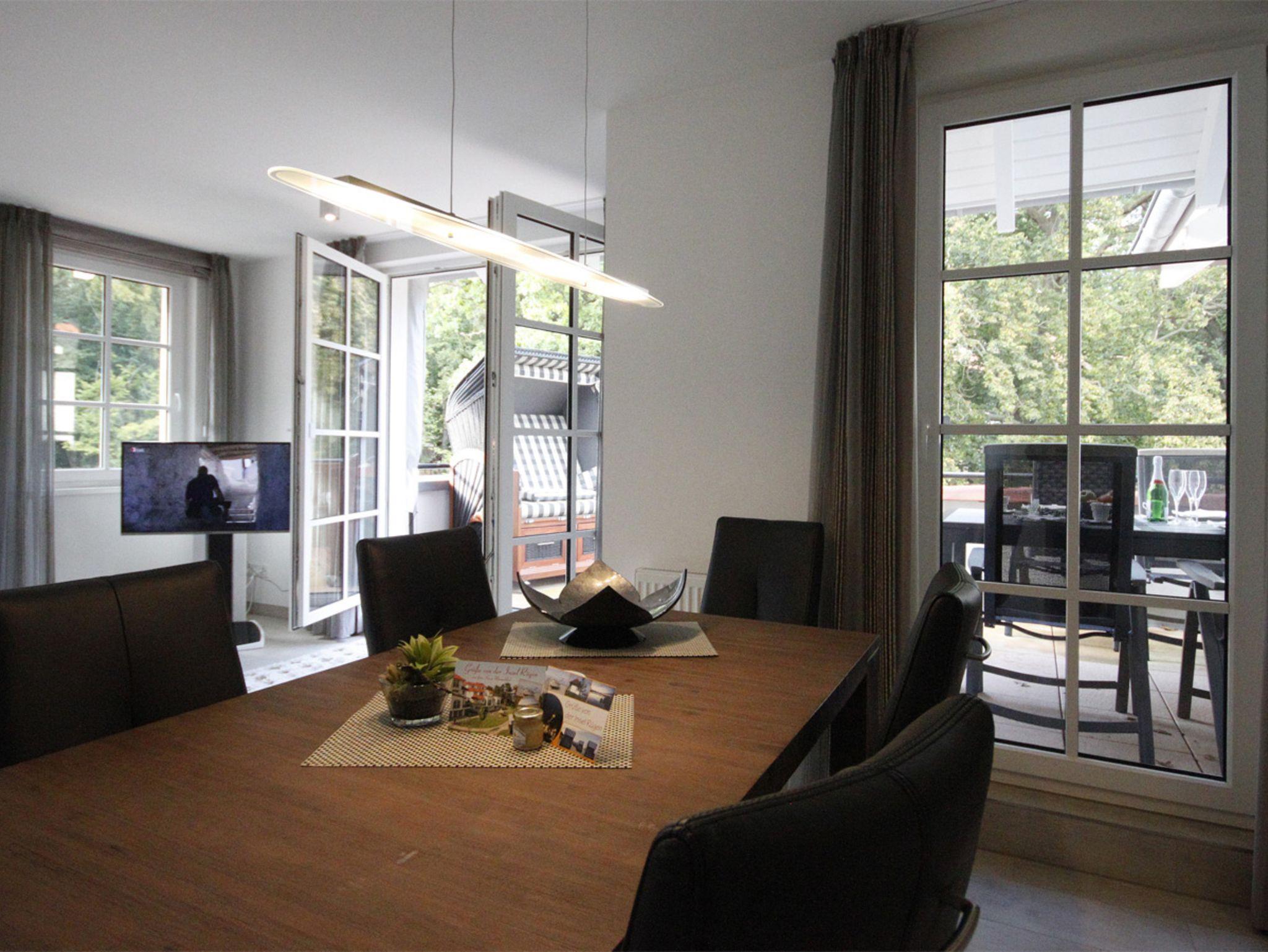 Wohnung mit Sonnendecks: Die gleichnamige Ferienwohnung ist ein wahres Luxus-Objekt. Mit einer Wohnfläche von 75 Quadratmetern, zwei Balkonen, einem Gäste-WC und einem Strandkorb im Außenbereich bietet die Wohnung Sonnendeck die perfekte Ausstattung für bis zu vier Personen. Das separate Schlafzimmer mit Doppelbett, TV und Kleiderschrank hat zwei Schlafplätze. Weitere zwei Personen können auf dem Schlafsofa im Wohn-/Essbereich übernachten, wo ebenfalls ein Fernsehgerät aufgestellt ist. Die Wohnung, die sich im dritten Obergeschoss befindet, hat einen großzügig möblierten Balkon mit Strandkorb und einen kleineren zweiten Balkon. Beide sind in Richtung Kiefernwald gelegen. Die Unterkunft ist für vier Personen eingerichtet, der Essbereich sogar für fünf. In der Küchenzeile finden Sie einen Vier-Plattenherd mit Cerankochfeld und Backofen, einen Kühlschrank, eine Mikrowelle, eine Spülmaschine sowie einen Toaster und eine Kaffeemaschine vor.