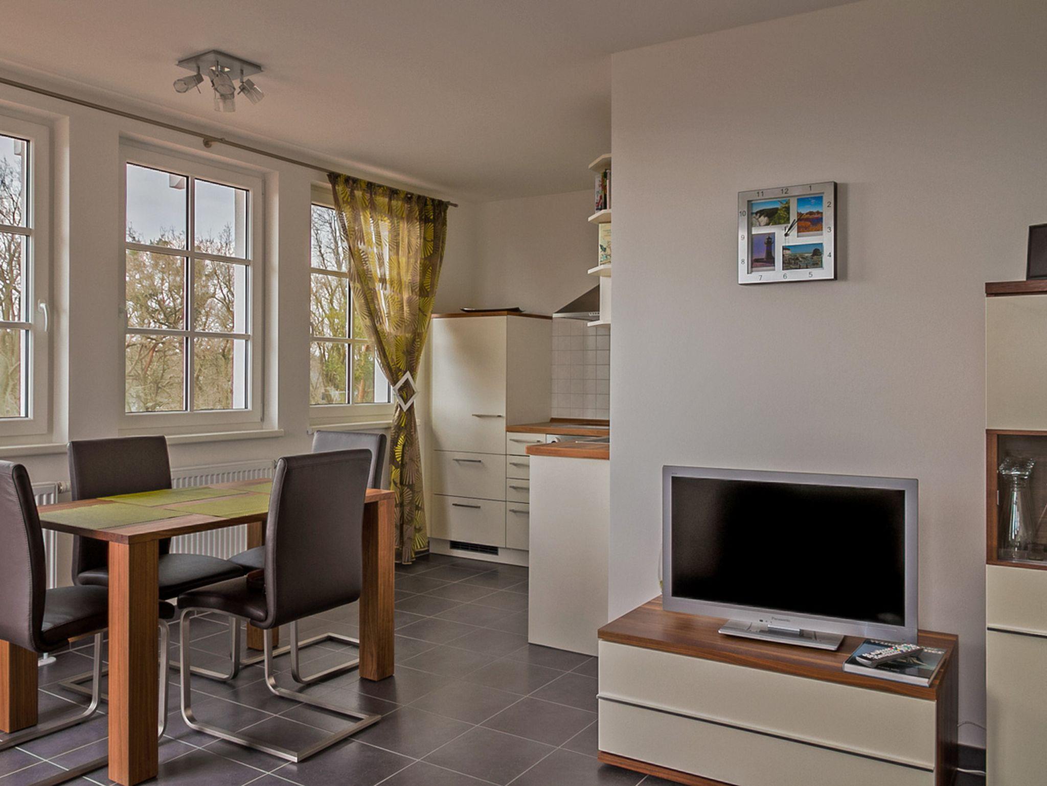 Im separaten Schlafzimmer ist ein Doppelbett sowie ein Kleiderschrank. Der Wohn- und Essbereich ist mit TV, CD-Player und Radio ausgestattet. Die gut eingerichtete Küchenzeile hält einen Vierplattenherd mit Backofen, einen Kühlschrank mit Gefrierfach, eine Spülmaschine, eine Mikrowelle sowie einen Toaster und eine Kaffeemaschine vor. Der Kochbereich ist in den Wohnraum integriert. Ein Babybett findet in dieser Wohnung leider keinen Platz.