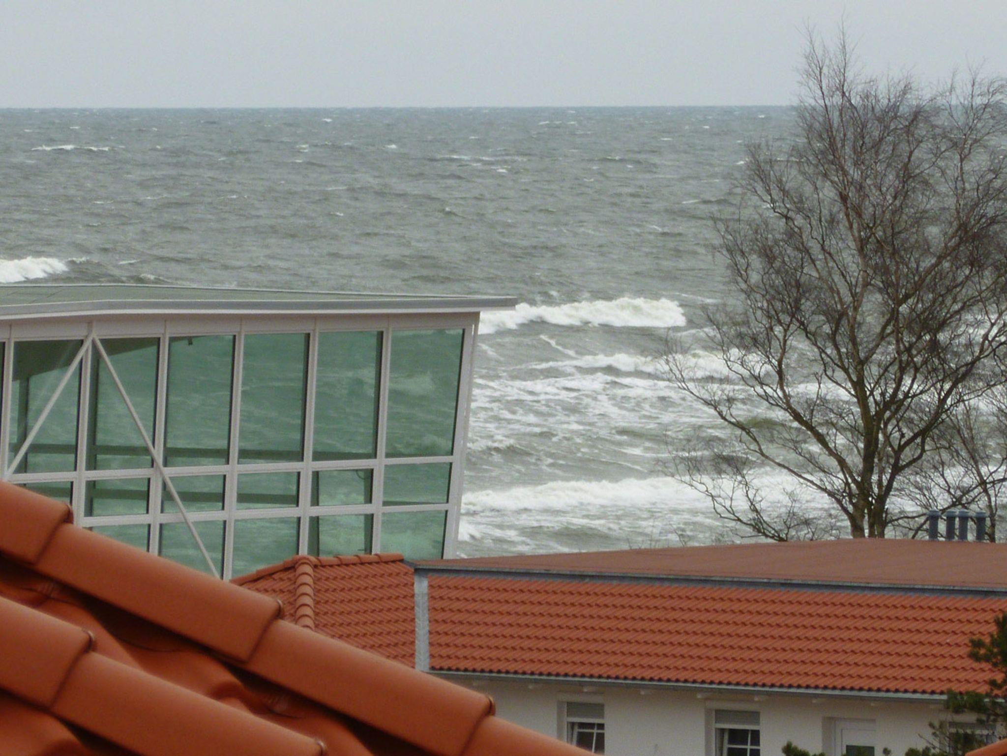 Meerblick vom Balkon aus über die Dächer hinweg: Die 45-Quadratmeter-Wohnung Südost liegt im vierten Stockwerk des Hauses Meeresblick und bietet daher einen freien Blick, teilweise bis zur Ostsee. Sie hat Platz für 2 Personen und ist über den Lift bis zur dritten Etage erreichbar - in die vierte gelangen Sie über das Treppenhaus.