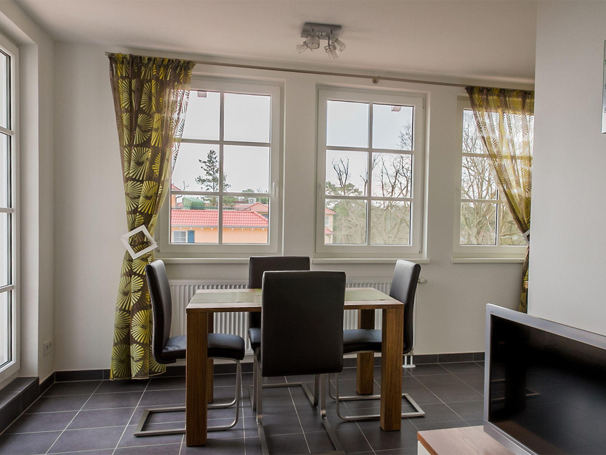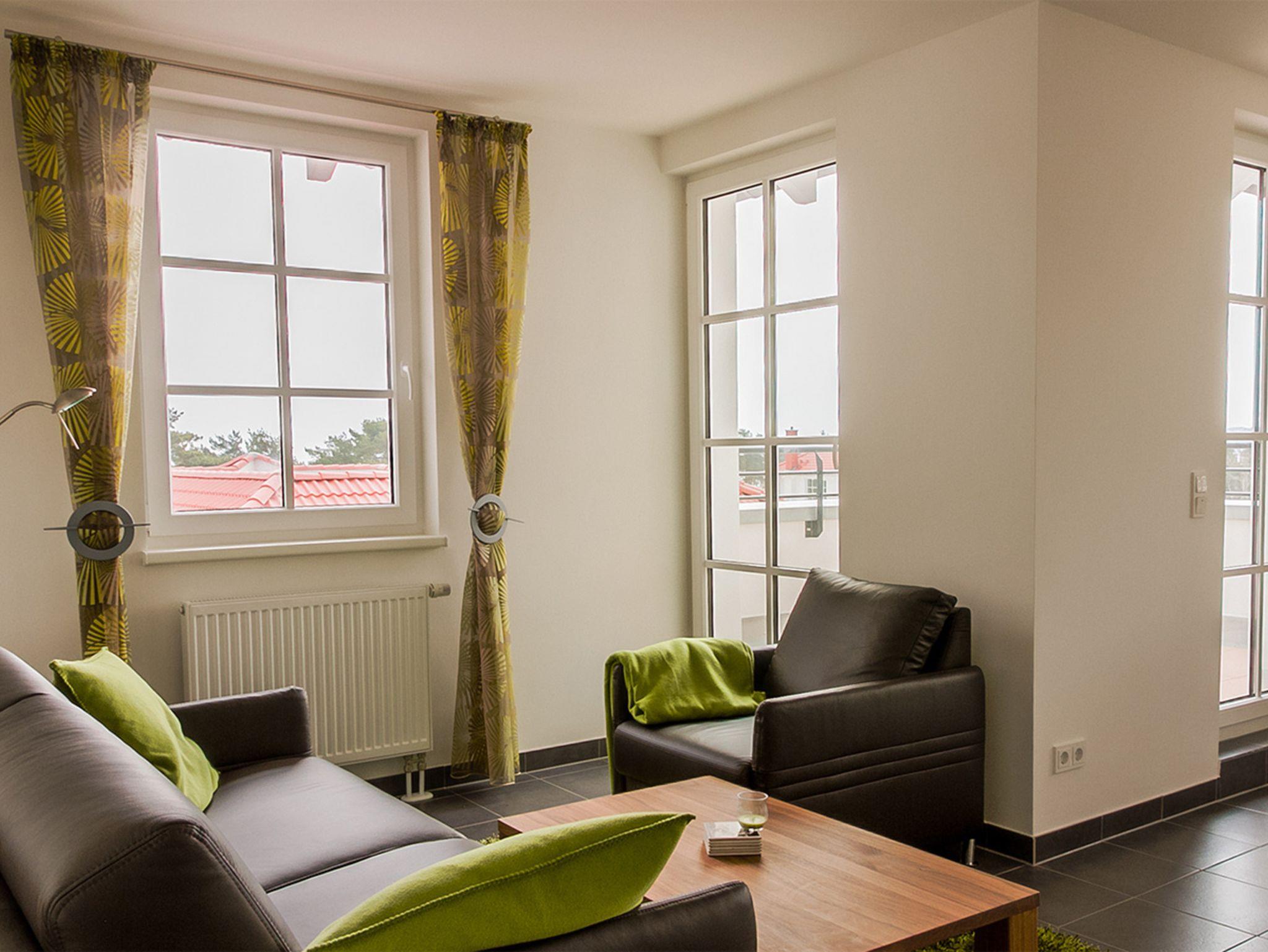 Diese 45 qm große Ferienwohnung liegt in der 4. Etage des 2013 eröffneten Haus Meeresblick, einer Residenz direkt am Strand von Baabe mit Schwimmbad, Massagen und Sauna im Haus .
