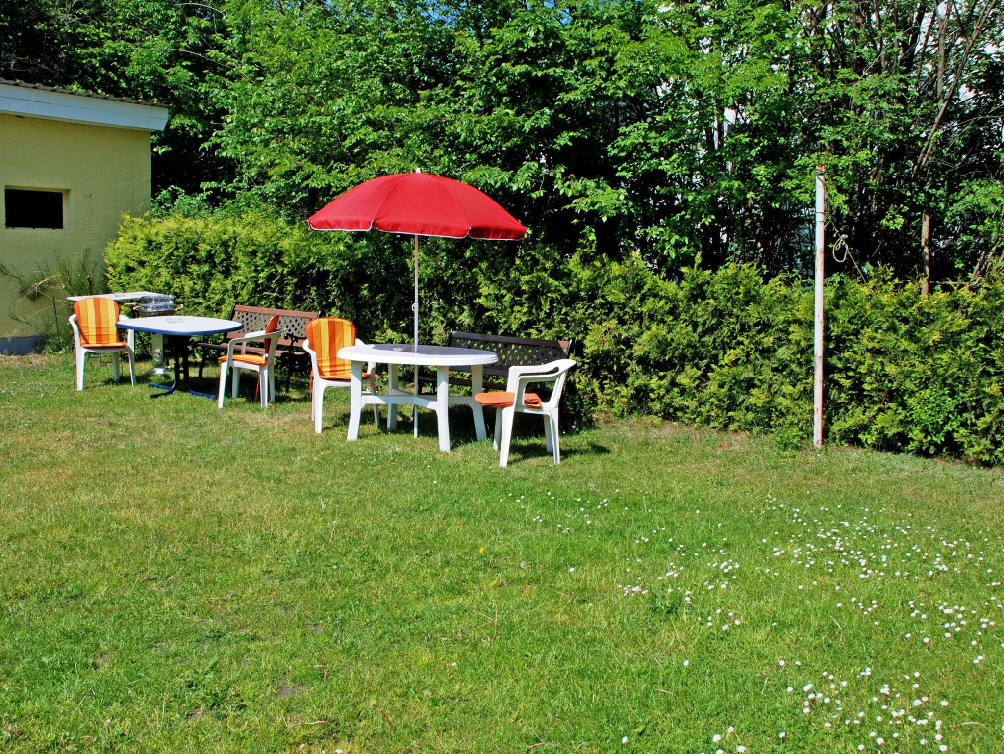 Hinter der Villa können Gäste dieser Ferienwohnung einen Platz mit Gartenmöbeln und Grillmöglichkeit mit nutzen.
