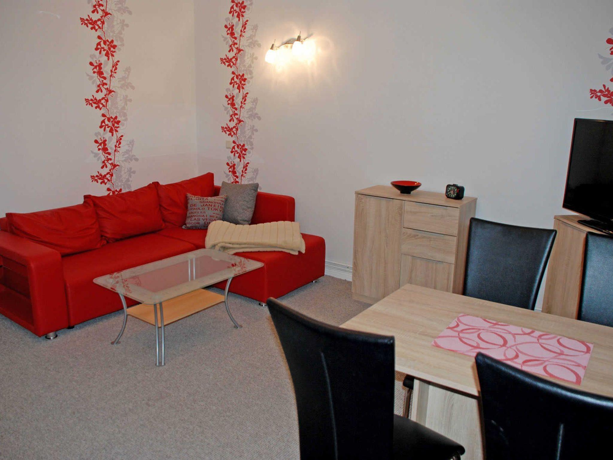 Im großen Wohnraum befindet sich eine bequeme Eckcouch, ein Couchtisch und ein Sidebord, ein Esstisch mit vier Stühlen sowie ein modernes Flachbild-TV-Gerät. Die Küchenzeile verfügt über einen Herd, Mikrowelle, Wasserkocher, Kaffeemaschine, Toaster und Kühlschrank mit Gefriermöglichkeit. WLAN steht Ihnen inklusive zur Verfügung.