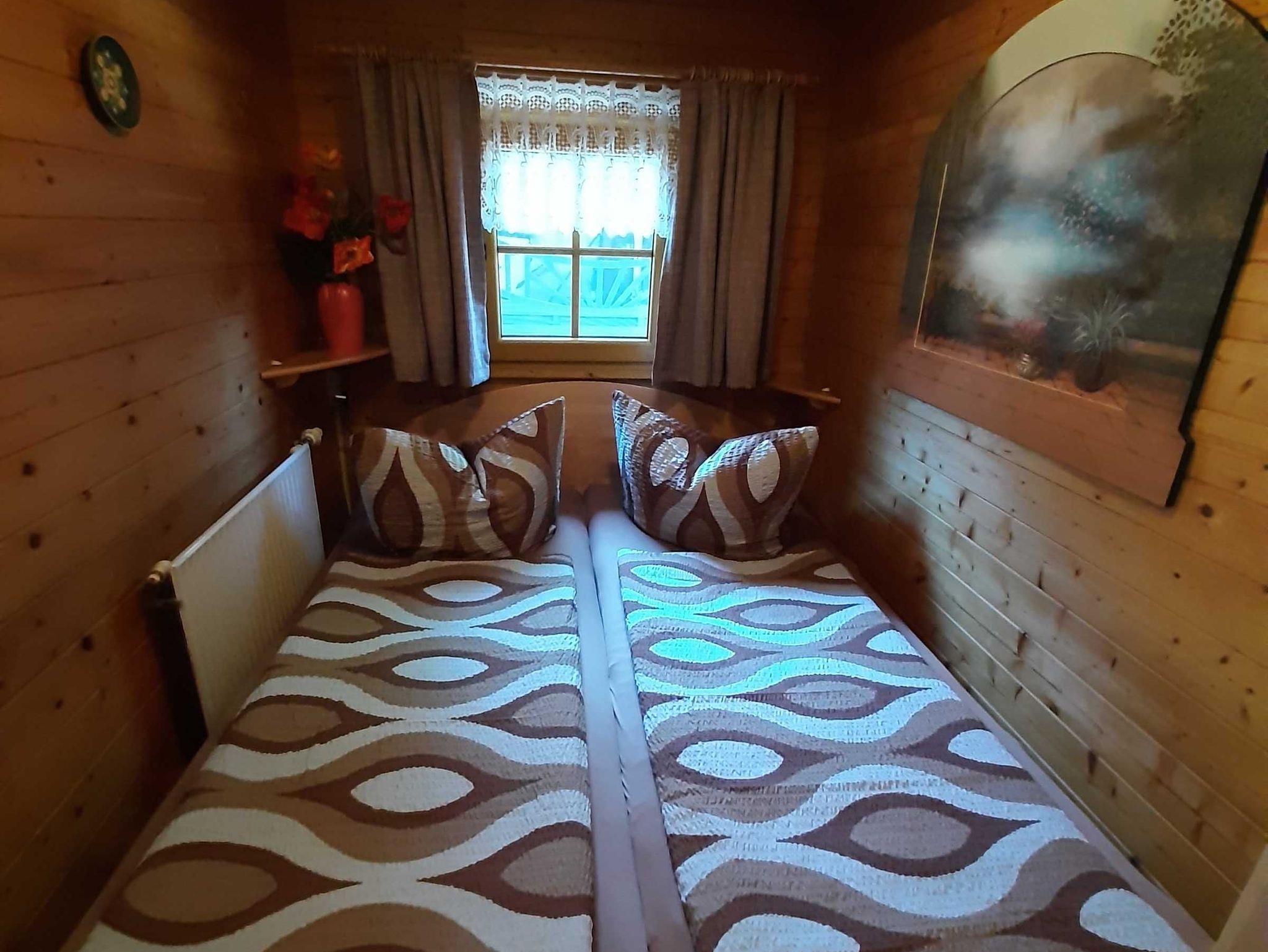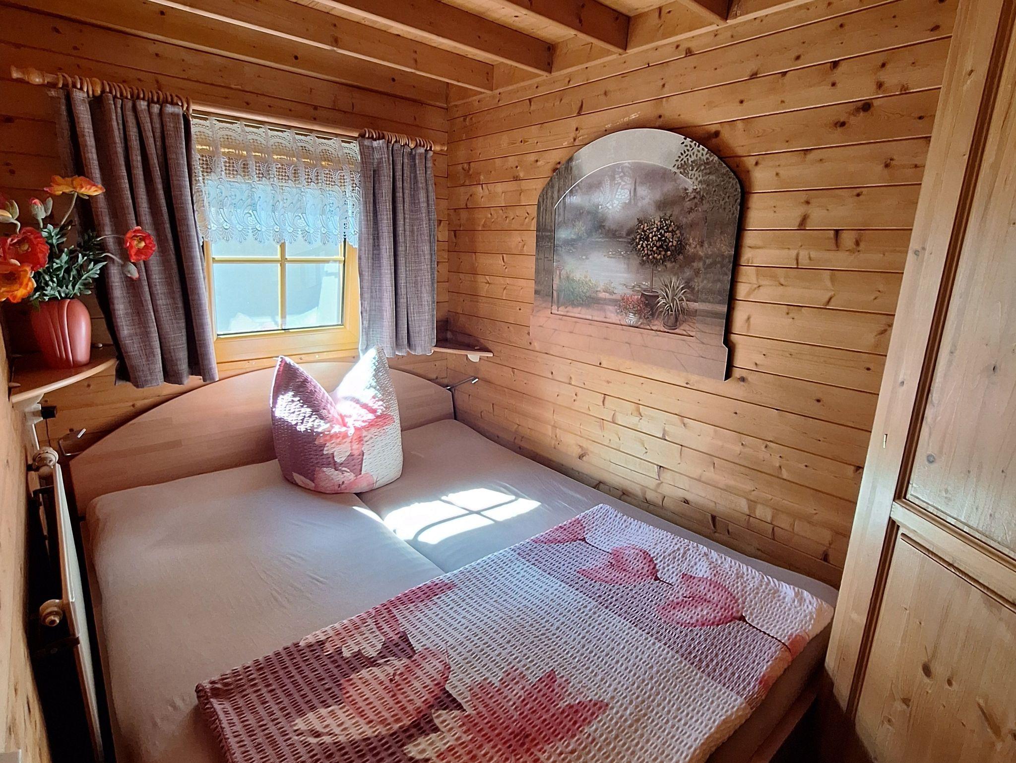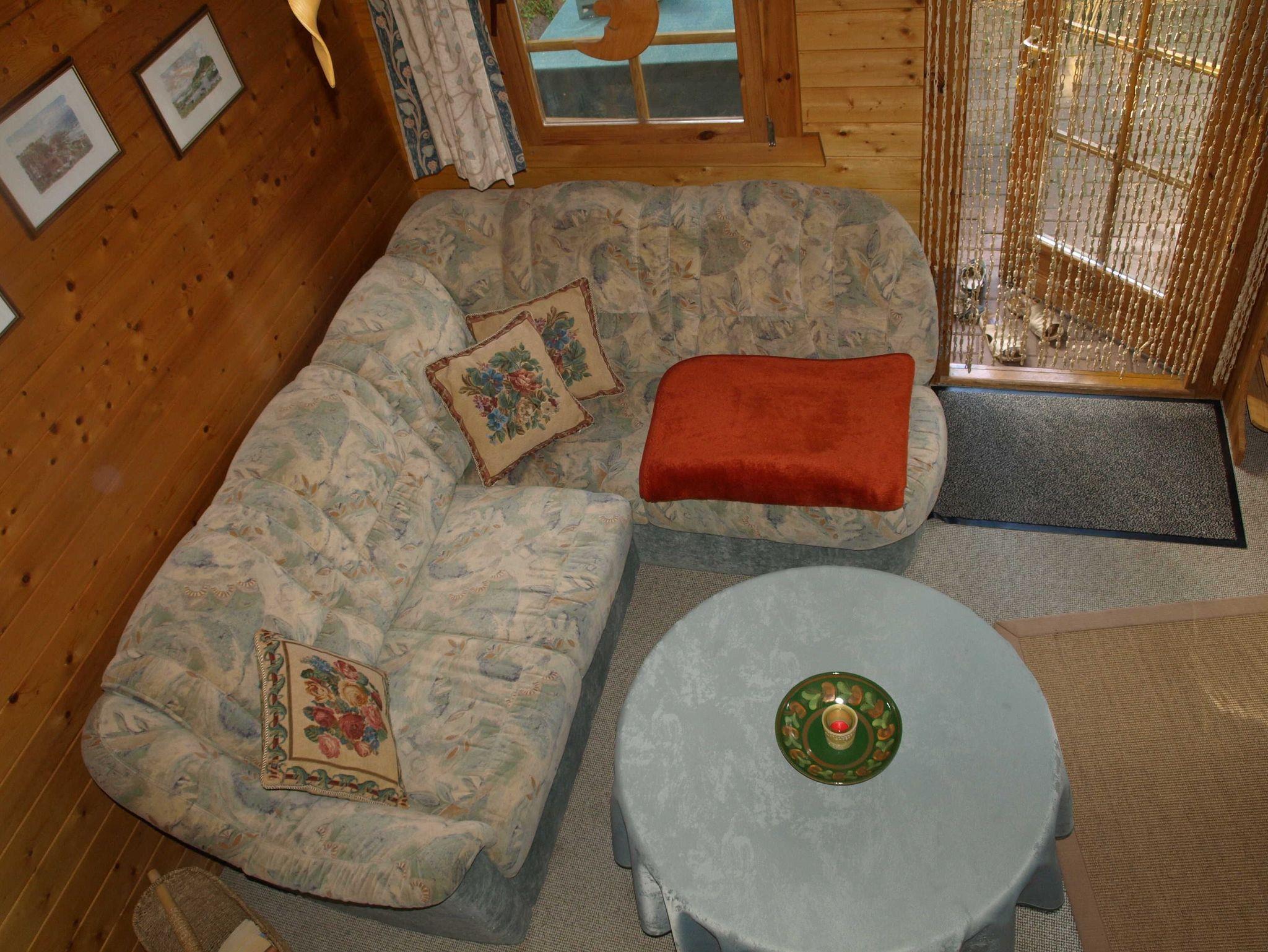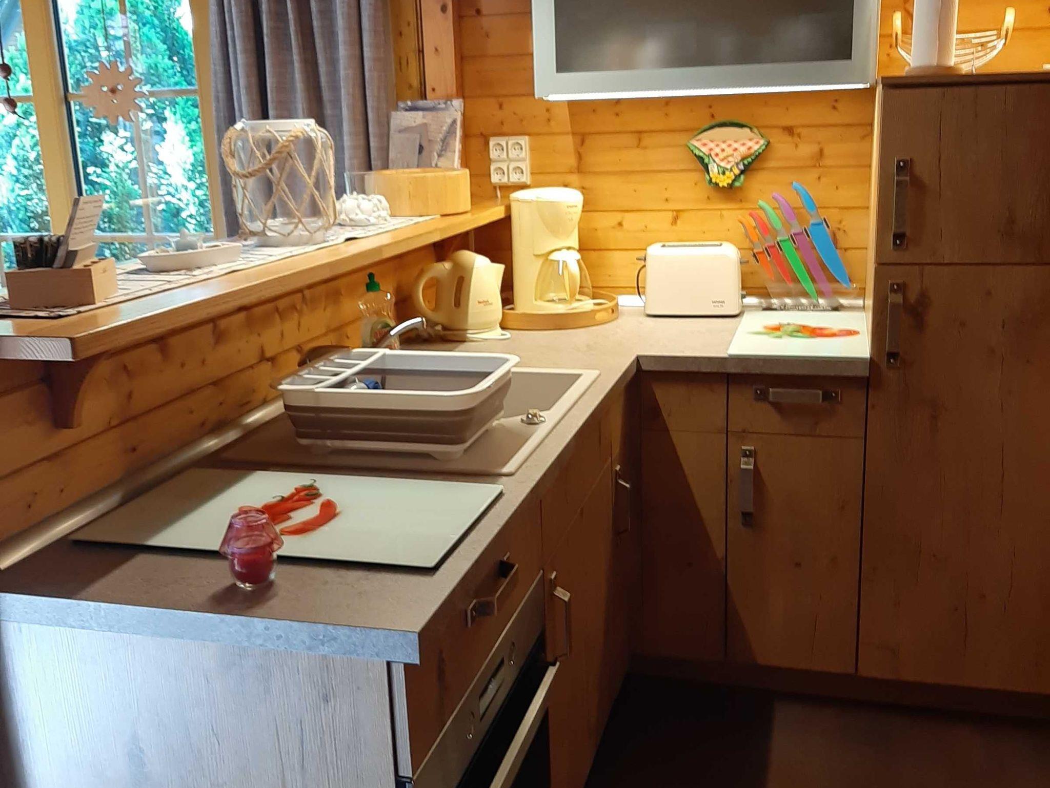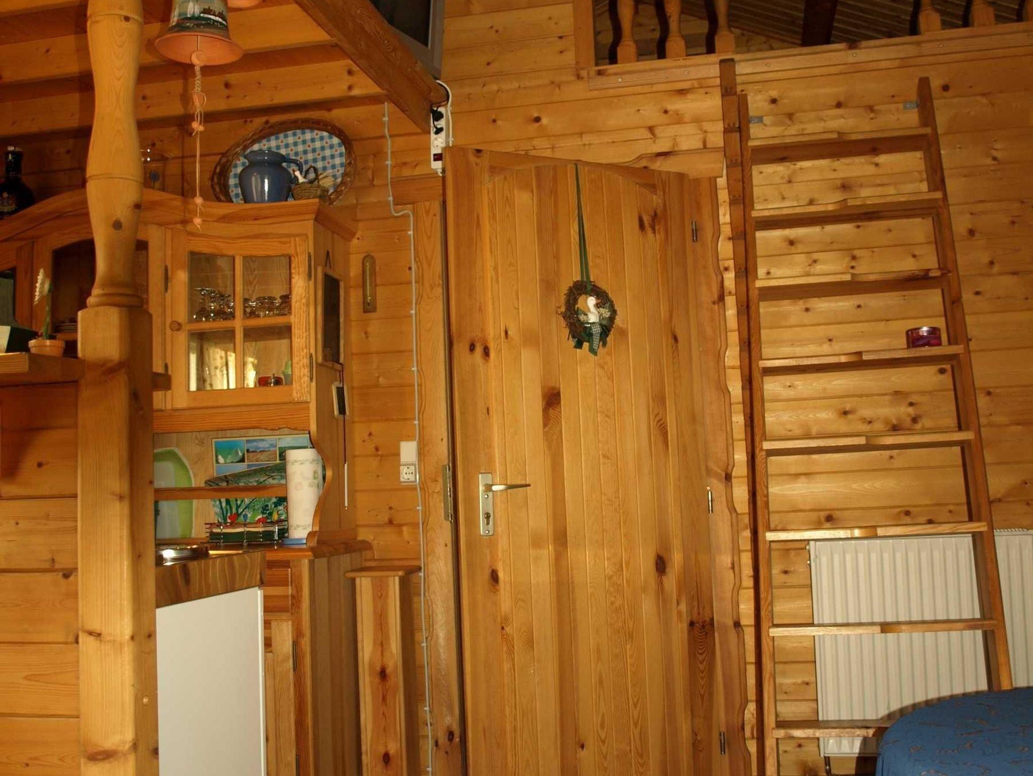 Die 2 Raum Ferienwohnung im Blockhaus ist in ein Wohn-, Schlaf- und separatem Essraum mit einer offenen Küche mit Kühlschrank aufgeteilt.