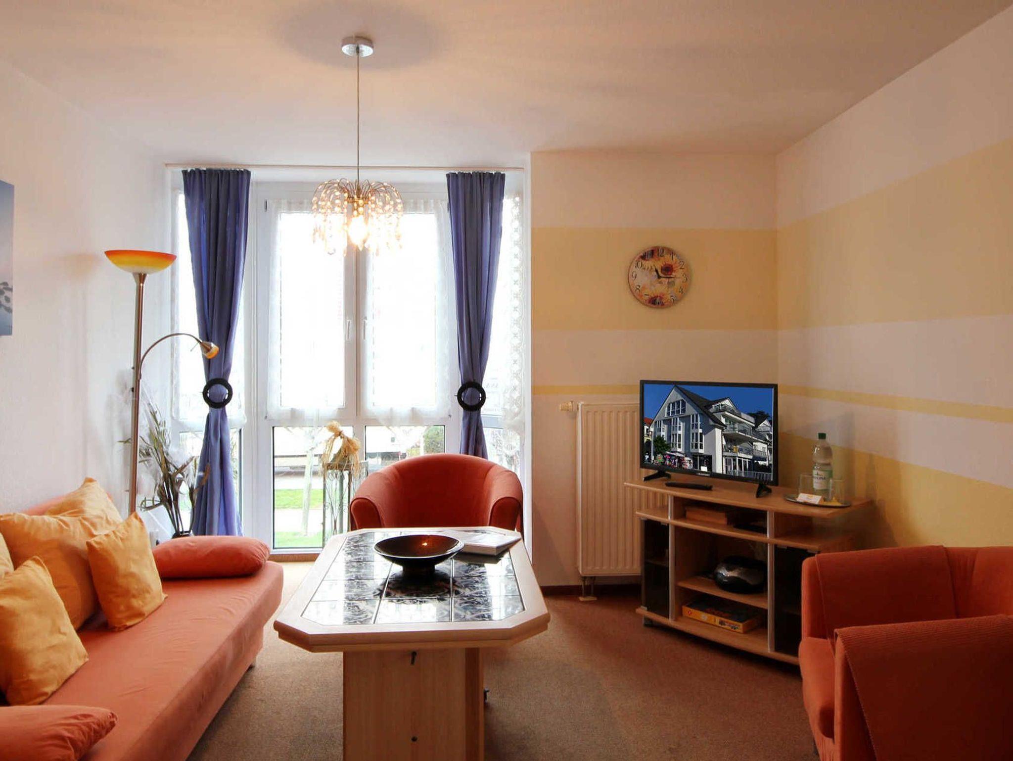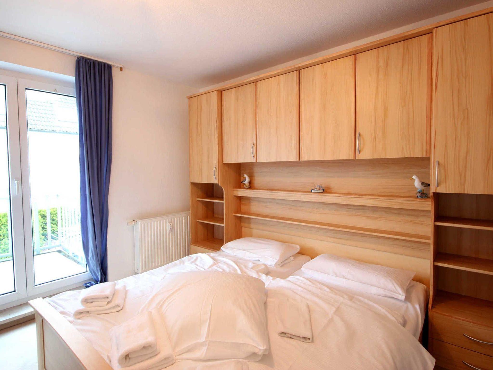 Ihre 2-Zimmerwohnung 54RB7 (Nichtraucher) hat eine Größe von ca. 41 qm und ist für bis zu 4 Personen eingerichtet. Sie befindet sich im 1. Obergeschoss und verfügt über einen großen Ostbalkon auf dem Sie bei Sonne frühstücken können und Blick auf die Flaniermeile des Ortes haben. Die Wohnung teilt sich auf in Wohnraum mit kompletter Küchenzeile, Bad, Balkon und einen Schlafraum. Im Wohnbereich finden Sie ein Flachbild-TV, Radio / CD-Player und ein Schlafsofa, welches eine Schlafgelegenheit für die 3. und 4. Person bietet. Im Schlafraum gibt es ein Doppelbett mit integriertem Schrank, der Ihnen genug Stauraum bietet. Das Badezimmer verfügt über ein Fenster, Waschtisch, Dusche, Handtuchheiztrockner und WC. Die Küchenzeile ist mit 4-Platte-Kochfeld, Backofen, Kühlschrank, Kaffeemaschine, Toaster und diversen kleinen Küchenhelfern ausgestattet. Von der Küche / Wohnbereich und dem Schlafzimmer aus haben Sie direkten Zugang zu dem Balkon. Ein wohnungseigener Garagenstellplatz steht Ihnen zur Verfügung.