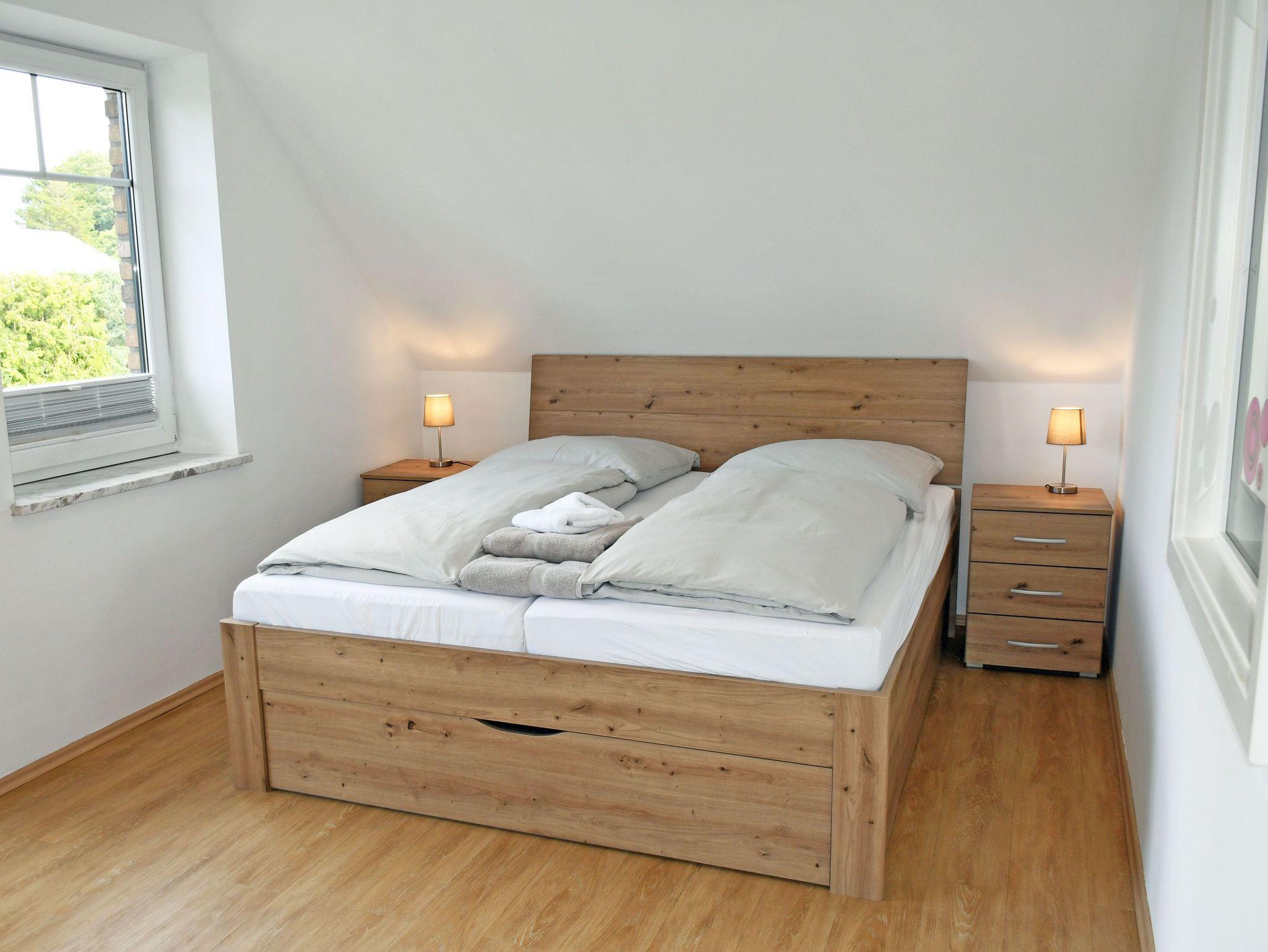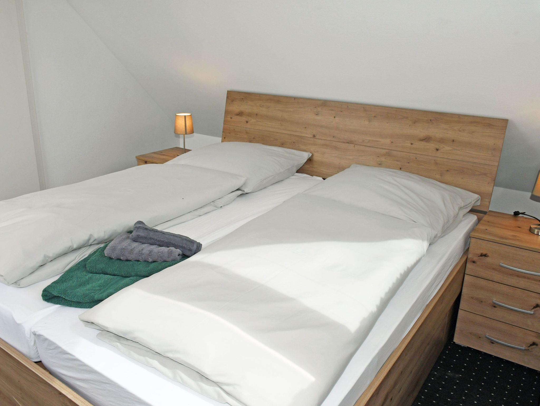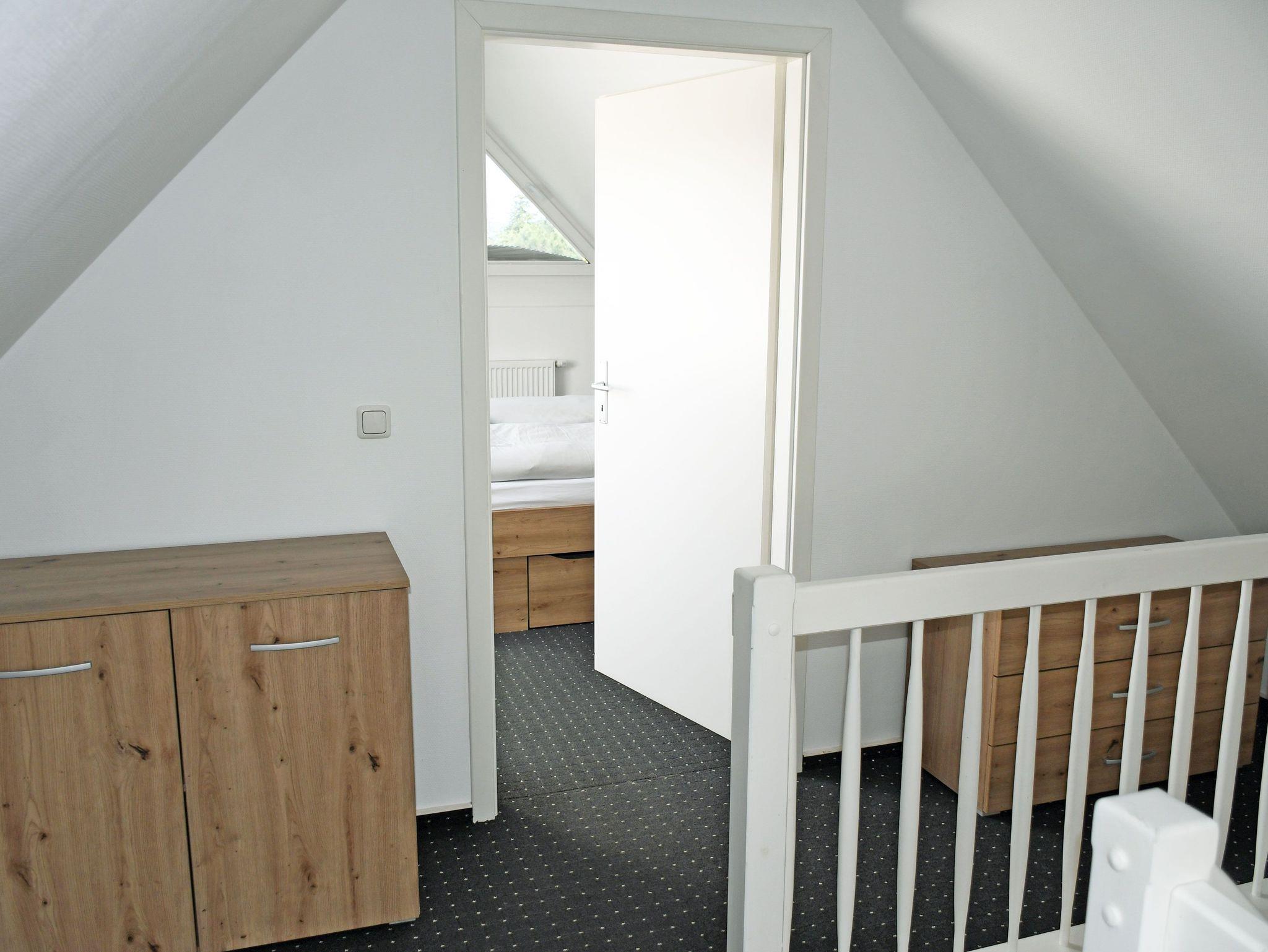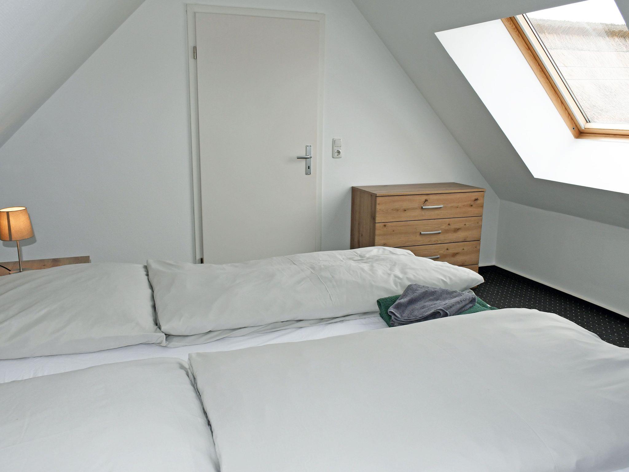 Das 1. Schlafzimmer liegt im 1. OG und ist mit einem bequemen Doppelbett (180 x 200cm) mit Nachttischen und Leselampen sowie einem Kleiderschrank ausgestattet. Das 2. Schlafzimmer hat die gleiche Ausstattung und ist über eine Treppe im Dachgeschoss erreichbar. Ein kleines Kinderreisebett und ein Hochstuhl können auf Wunsch kostenlos in diesen beiden Schlafzimmern zur Verfügung gestellt werden. Ebenfalls im Dachgeschoss (ohne Türabtrennung nach unten zum Wohnbereich) befindet sich das 3. Schlafzimmer, ebenfalls mit einem bequemen Doppelbett (180 x 200cm) mit Nachttischen und Leselampen sowie einem Kleiderschrank ausgestattet.