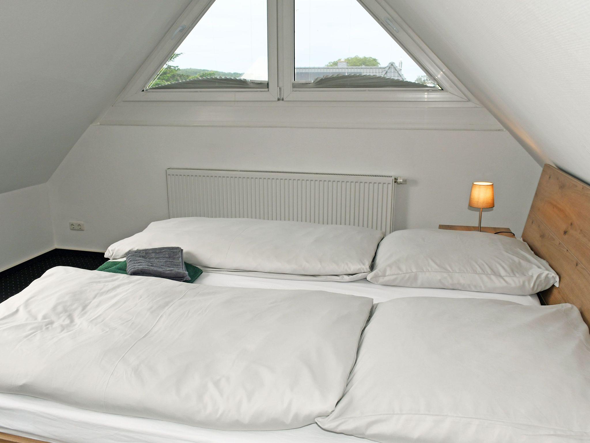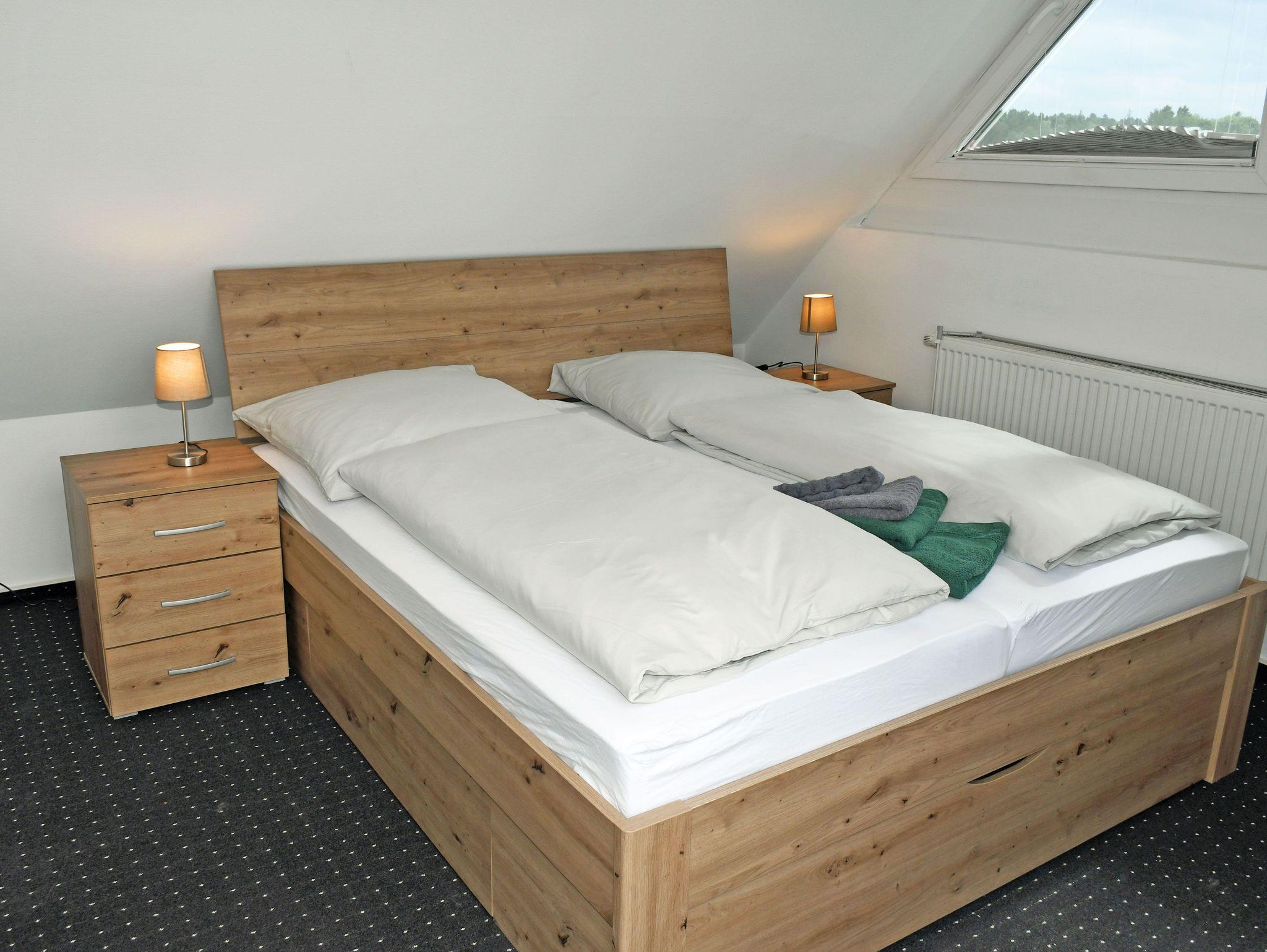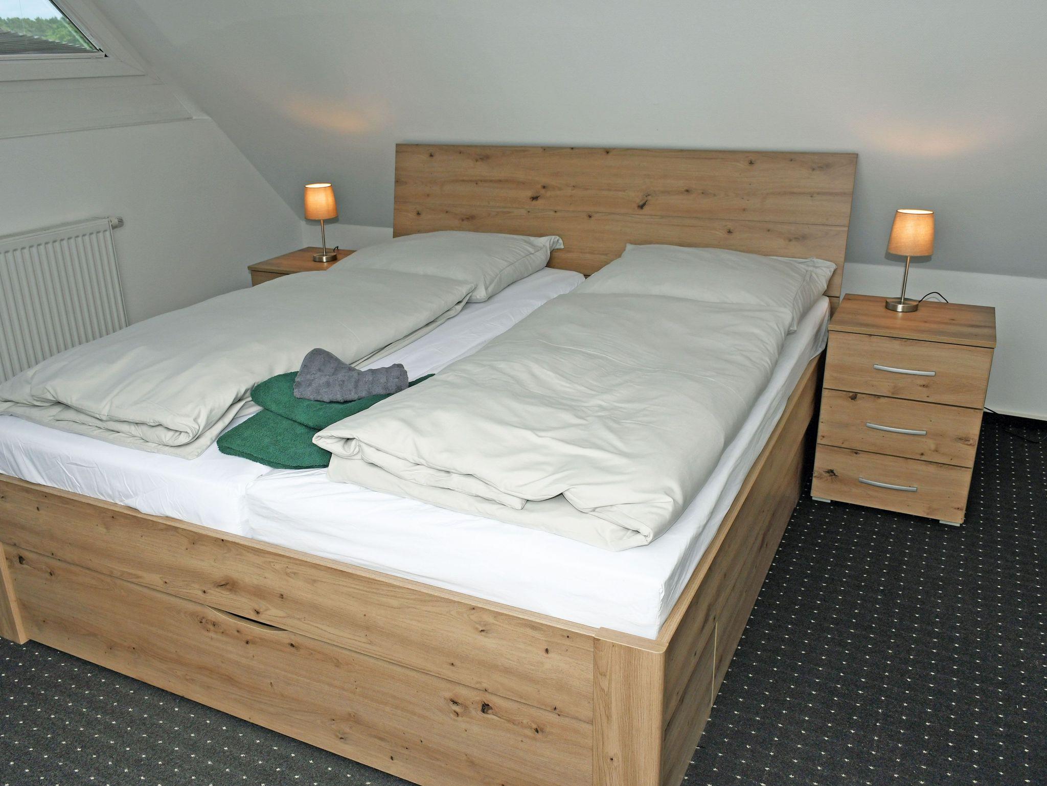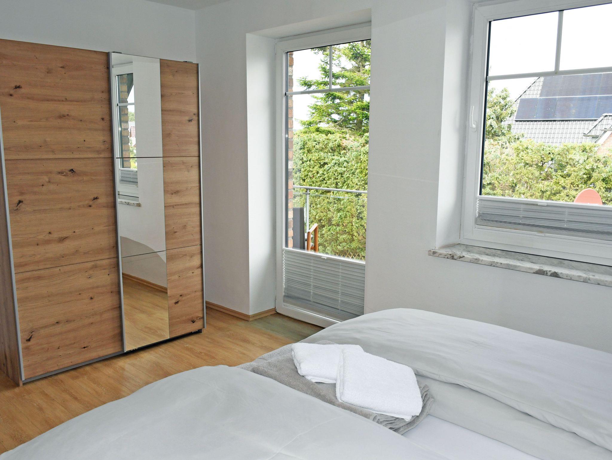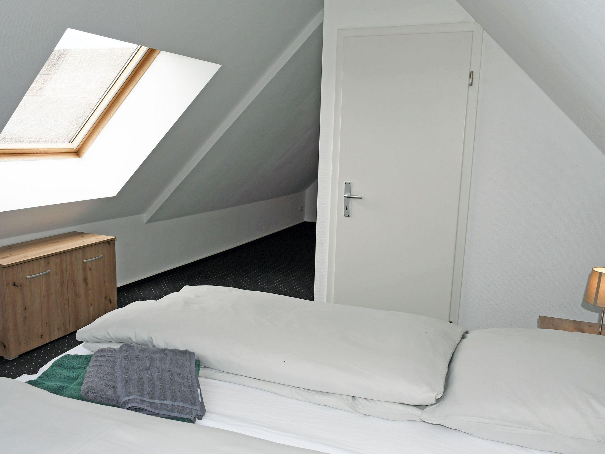 Das 1. Schlafzimmer liegt im 1. OG und ist mit einem bequemen Doppelbett (180 x 200cm) mit Nachttischen und Leselampen sowie einem Kleiderschrank ausgestattet. Das 2. Schlafzimmer hat die gleiche Ausstattung und ist über eine Treppe im Dachgeschoss erreichbar. Ein kleines Kinderreisebett und ein Hochstuhl können auf Wunsch kostenlos in diesen beiden Schlafzimmern zur Verfügung gestellt werden. Ebenfalls im Dachgeschoss (ohne Türabtrennung nach unten zum Wohnbereich) befindet sich das 3. Schlafzimmer, ebenfalls mit einem bequemen Doppelbett (180 x 200cm) mit Nachttischen und Leselampen sowie einem Kleiderschrank ausgestattet.