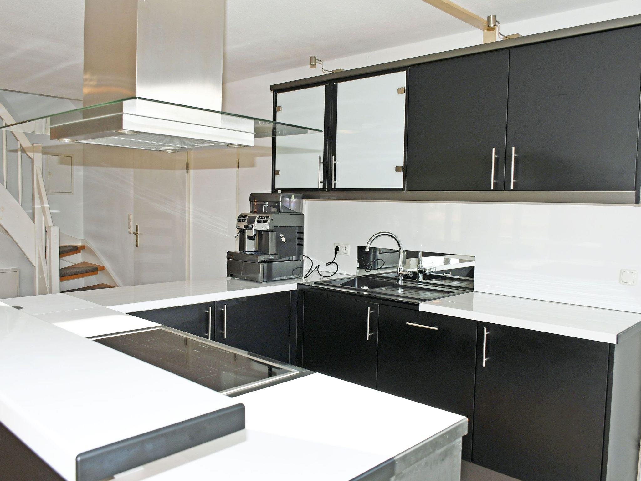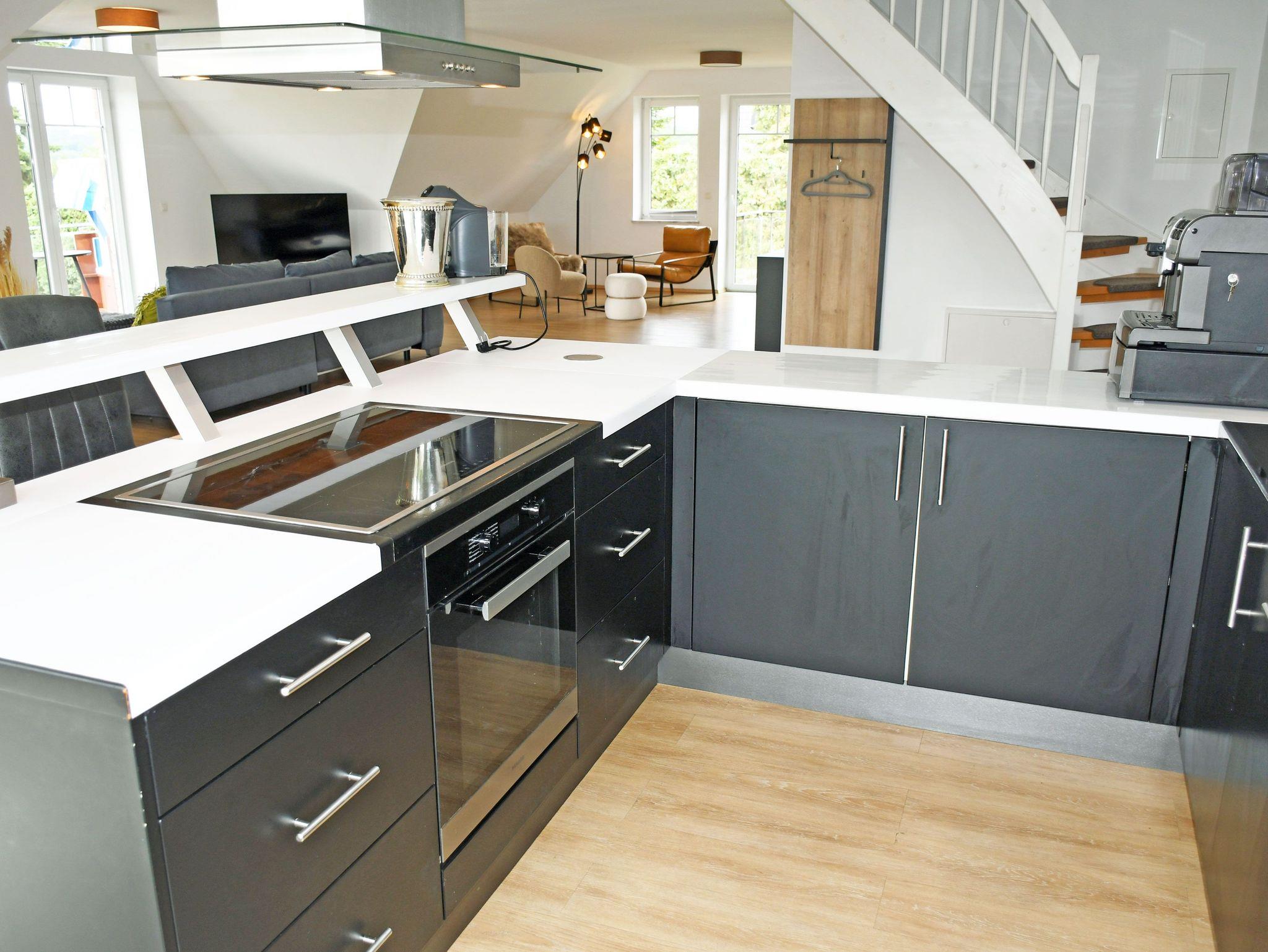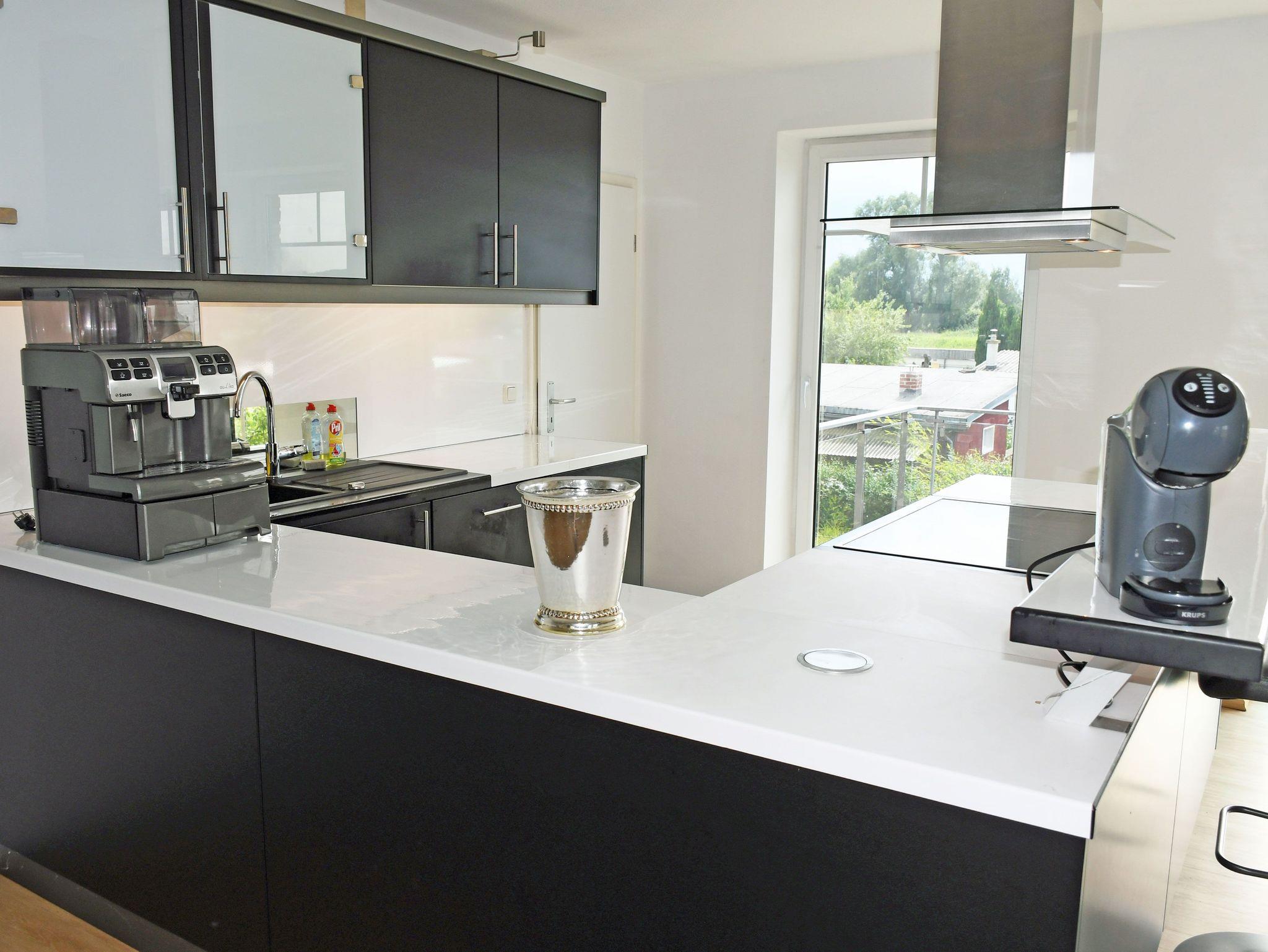 Die moderne Küchenzeile ist komplett ausgestattet mit Cerankochfeld, Abzugshaube, Geschirrspülmaschine, Wasserkocher, Kaffeemaschine, Toaster und umfangreichen weiteren Küchenutensilien.