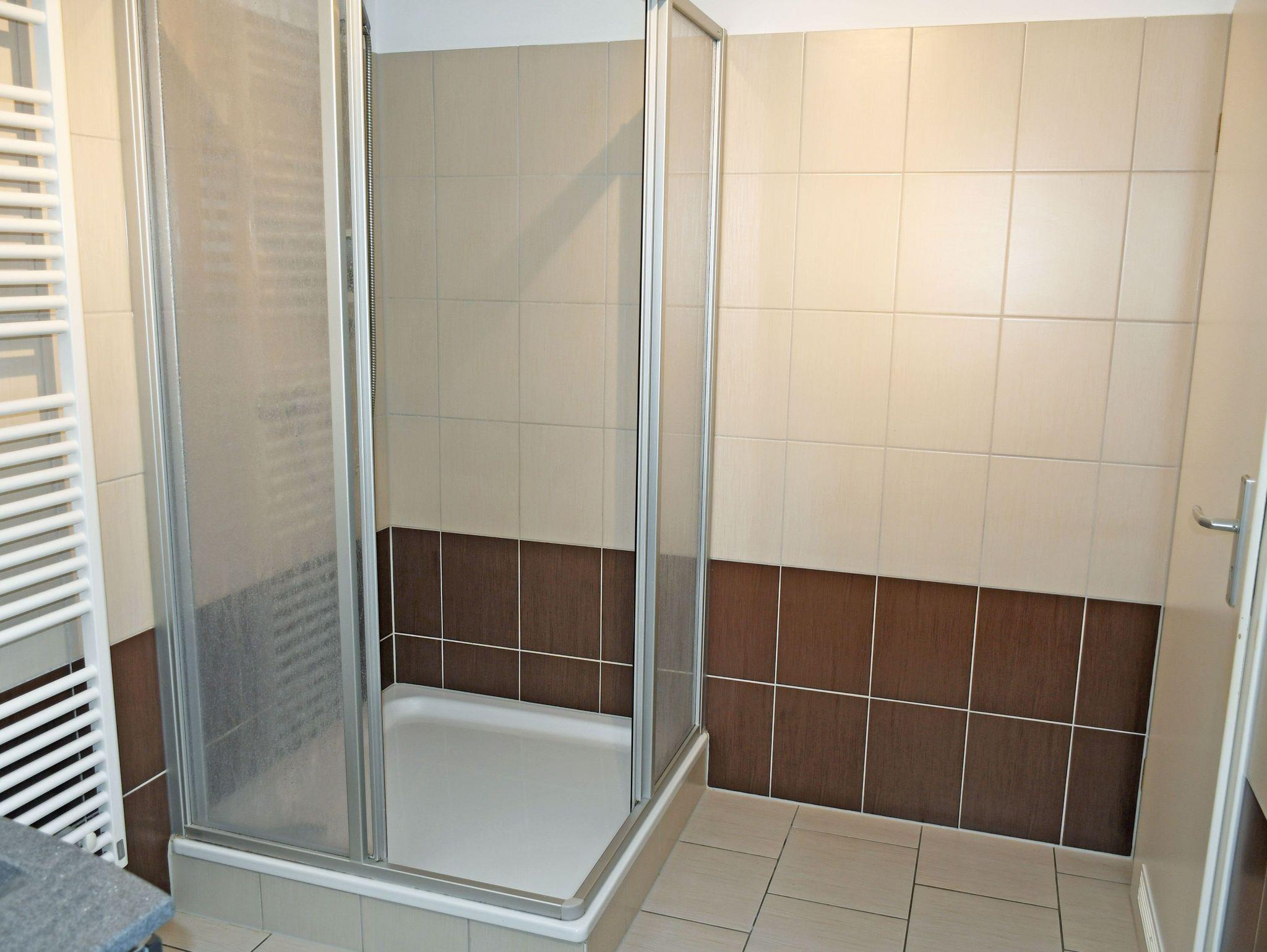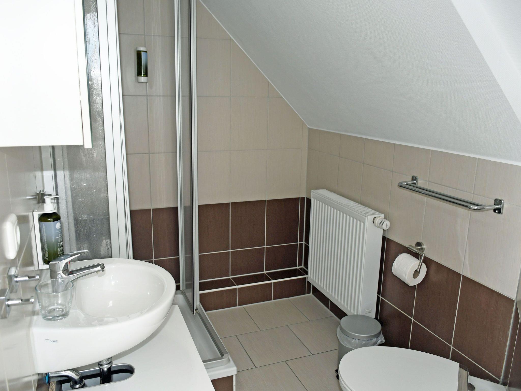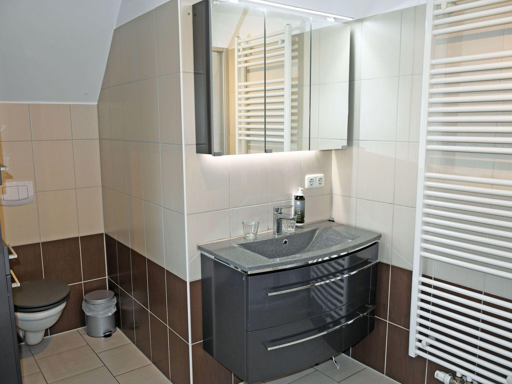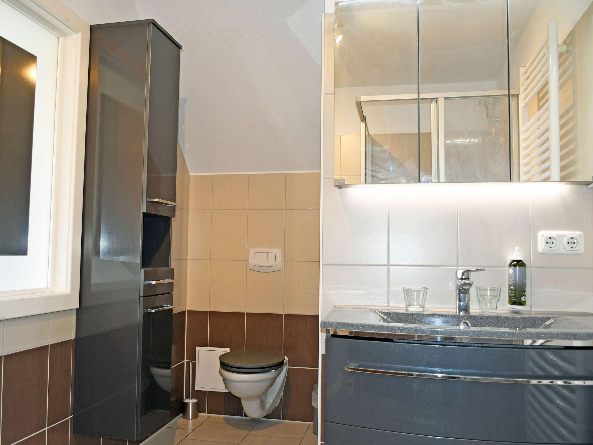 2 moderne Bäder sind mit Dusche, WC, Handtuchtrockner und Waschtisch ausgestattet. Es gibt zusätzlich ein Gäste-WC mit Waschbecken.