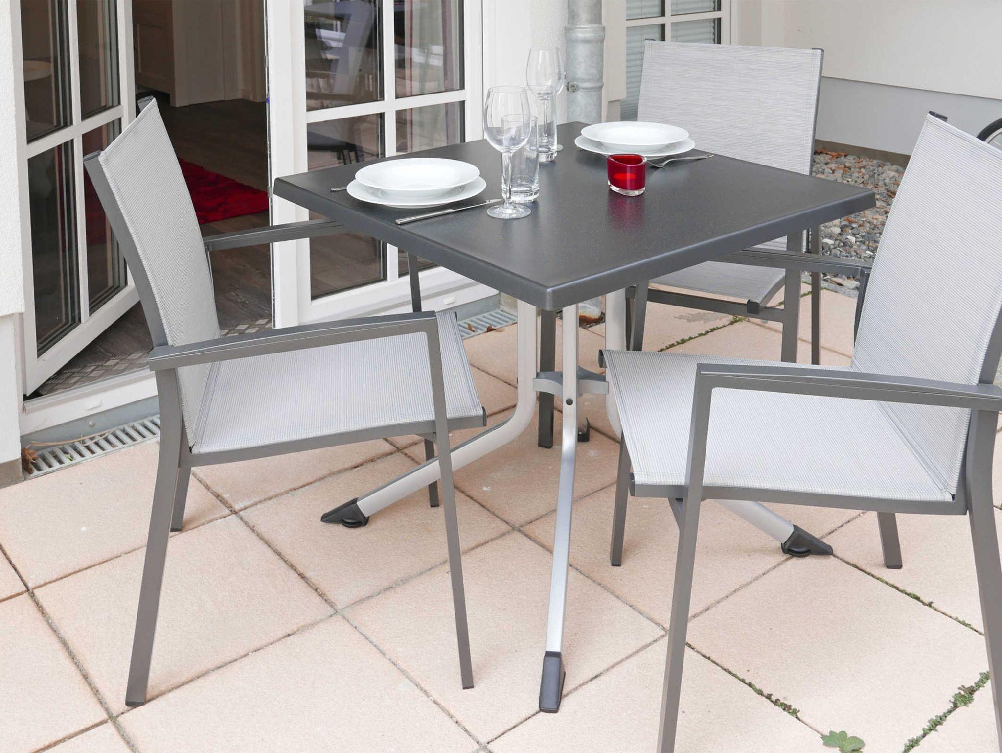 Der Wohn-/Essbereich verfügt über eine moderne Küchenzeile, einem Essplatz sowie einem gemütlichen Sitzbereich mit Sofa, Sessel und Flachbildfernseher. Ein Schlafzimmer ist mit einem hochwertigen Boxspringbett (180 x 200 cm) ausgestattet, das andere mit einem Einzelbett. Auf der Terrasse befindet sich ein Tisch mit drei Stühlen. Die Wohnung ist stufenfrei, das Bad hat einen großen Wendekreis und im Einzelzimmer ebenfalls.
