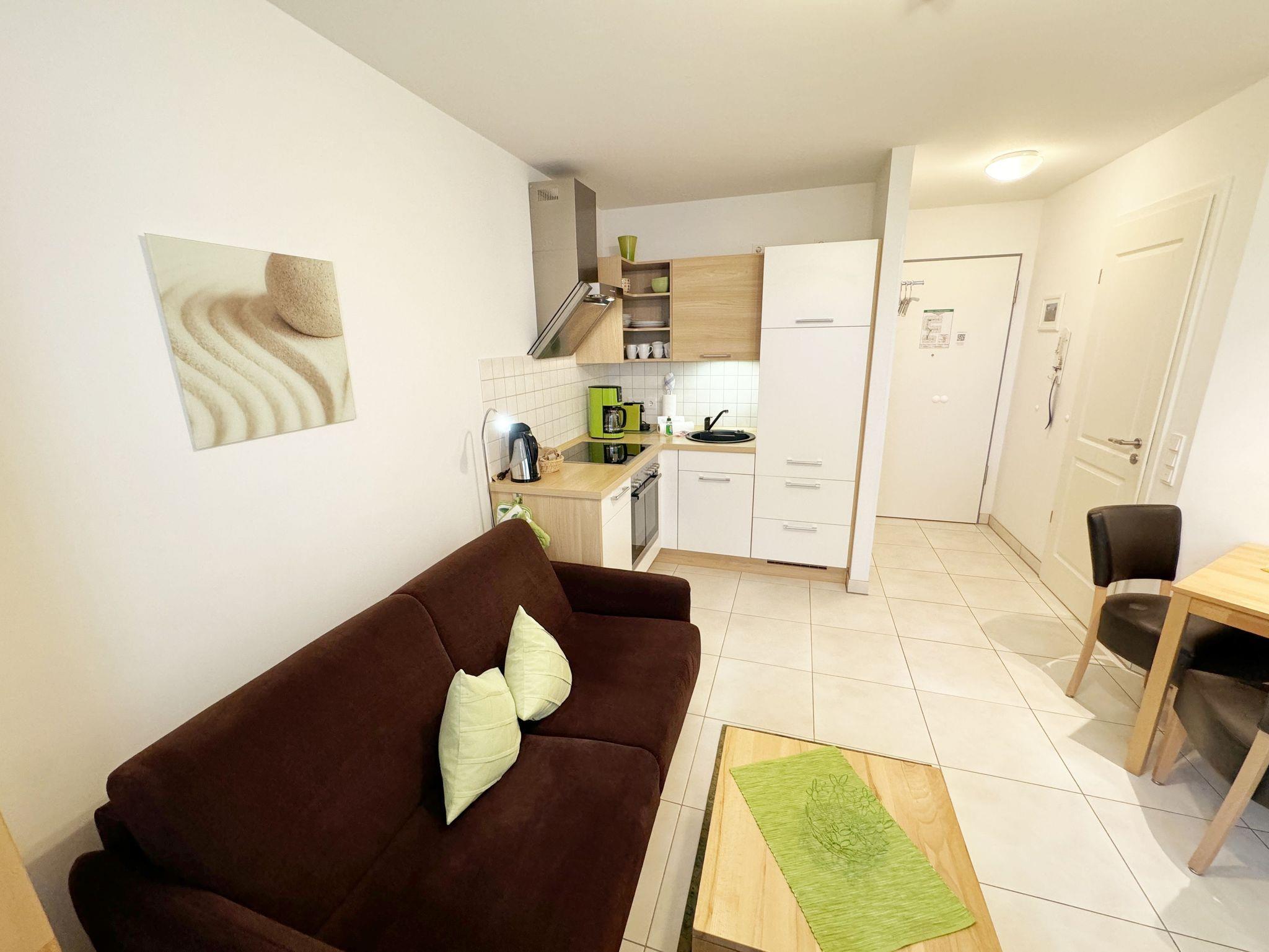 Ihre Nichtraucher/Ferienwohnung Ostseegold ist mit viel Liebe zum Detail ausgestattet und eingerichtet worden. Sie wohnen in einer ca. 38 qm 2-Zimmer Wohnung, die für 2 bis 3 Personen ausgelegt ist. Die Wohnung befindet sich in der 1. Etage und ist per Fahrstuhl bequem zu erreichen. In der Wohnung finden Sie einen kombinierten Wohn/Koch- und Essbereich, der mit hochwertigen hellen Fliesen versehen ist. Die integrierte helle Küchenzeile lässt mit Küchengeräten von Neff wie Backofen, Ceranfeld, Spülmaschine, Kühlschrank mit Gefrierfach, Nespresso Maschine, Kaffeemaschine und anderen praktischen Helfern keine Wünsche offen. Im Wohnbereich ist weiterhin eine Essecke mit Stühlen und Esstisch aus Kernbuche massiv hell (Echtholz) sowie ein gemütliches Sofa vorhanden. Dieses hochwertige Schlafsofa mit Kaltschaumpolsterung im Sitz, Rücken und Liegefläche, kann in wenigen Handgriffen zur 2. Schlafstätte (1,20m x 2,00m) für die 3. Person umfunktioniert werden. Abgerundet wird der Wohnbereich durch einen Flat-TV, DVD-Player und einer CD-Musikanlage. Auf einen Internetanschluss (WLAN) müssen Sie im Urlaub nicht verzichten. Dieser ist für Sie inklusive. Der Balkon (Nord/West - Richtung Kiefern) ist vom Wohn/Essbereich begehbar und komplett möbliert. Die großen lichtdurchfluteten Balkonfenster lassen die Wohnung und die Echtholzmöbel sehr schön zur Geltung kommen. Das moderne Schlafzimmer aus Kernbuche (Lack creme Fronten) ist mit einem komfortablen Doppelbett (1,80m x 2,00m), hochwertigen Matratzen, Nachttischkonsolen, einem 4-trg. Drehtürenkleiderschrank und einem weiteren TV ausgestattet. Verdunklungsplissees im Schlafzimmer garantieren einen ruhigen Schlaf. Das Bad verfügt über eine ebenerdige Dusche, Fön, Waschbecken, WC und einen Handtuchtrockner. Ein eigener PKW-Stellplatz (Nr.101, Einfahrtshöhe 2,00m) befindet sich in der Tiefgarage des Hauses. Im Keller des Hauses haben Sie die Möglichkeit eine Waschmaschine/Trockner gegen Gebühr zu nutzen. Ein Hund (Kniehoch, keine Katzen) gegen einen Aufpreis ist möglich. Mit dem Fahrstuhl des Hauses A gelangen sie in das Untergeschoss der Meeresblickanlage, wo Sie ein großzügiger und heller Wellnessbereich erwartet. Hier können sie in einem Pool kleine Bahnen schwimmen, in 2 Saunen Ihren Kreislauf in Schwung bringen, in einem dazugehörigen Ruheraum Ihren Körper wieder beruhigen, in einer Schneckendusche sowie weiteren Duschen das kühle Nass genießen und auf einer Außenterrasse mit Außendusche die frische Luft einatmen. Die Erstausstattung eines Wäschepaketes (komplette Bettwäsche, 1 Duschhandtuch, 2 kleine Handtücher) können Sie bis 14 Tage vor Anreise gegen einen Aufpreis dazu buchen oder durch eigene ergänzen. Ab 2 gebuchten Paketen erhalten Sie einmalig 1 Geschirrhandtuch und 1 Duschvorleger hinzu.
