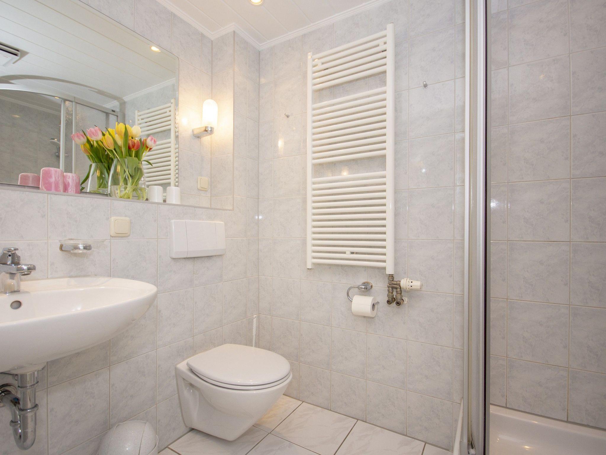 Das Badezimmer verfügt über eine Dusche, WC und einen Waschtisch mit großen Spiegel.