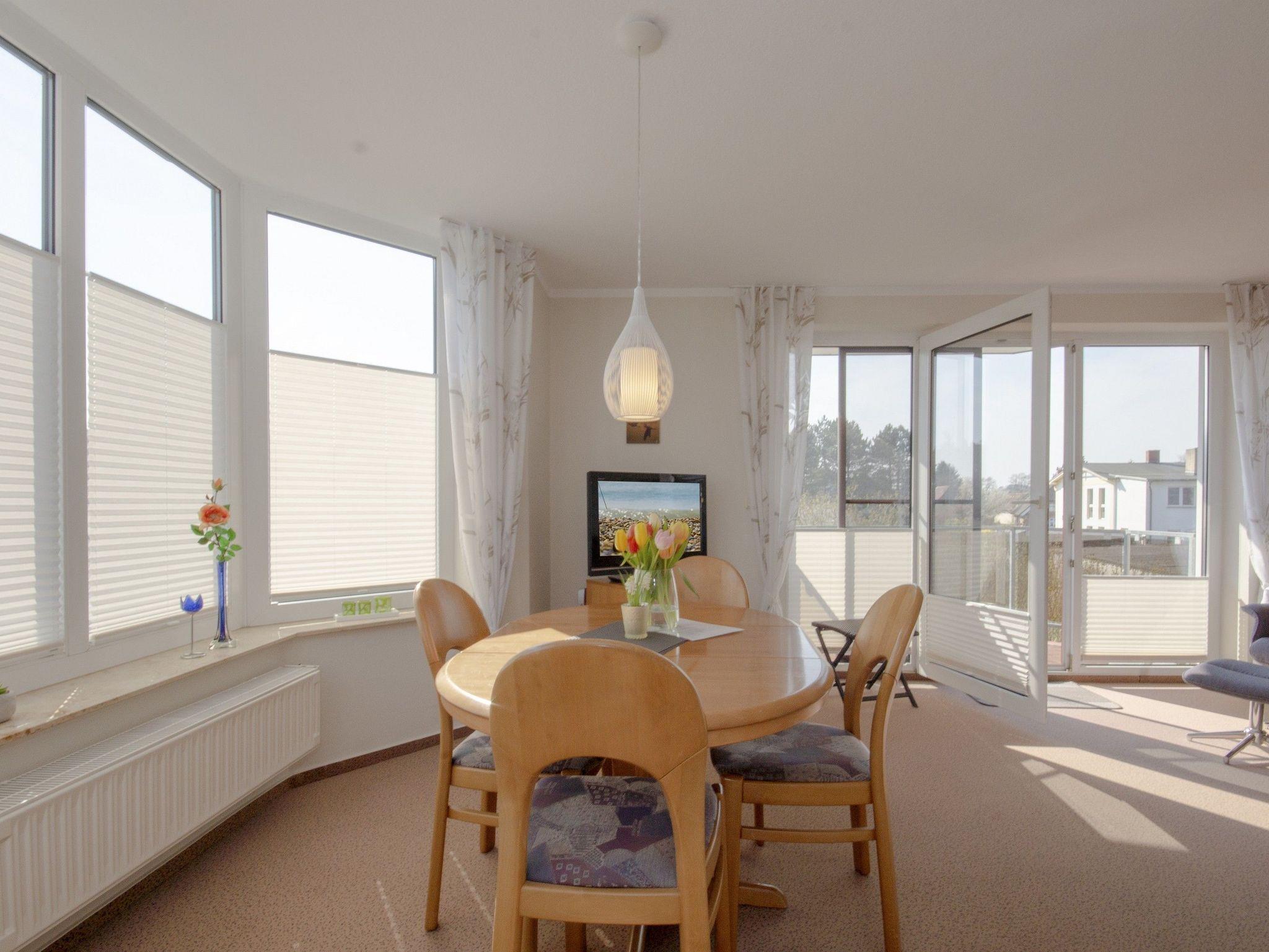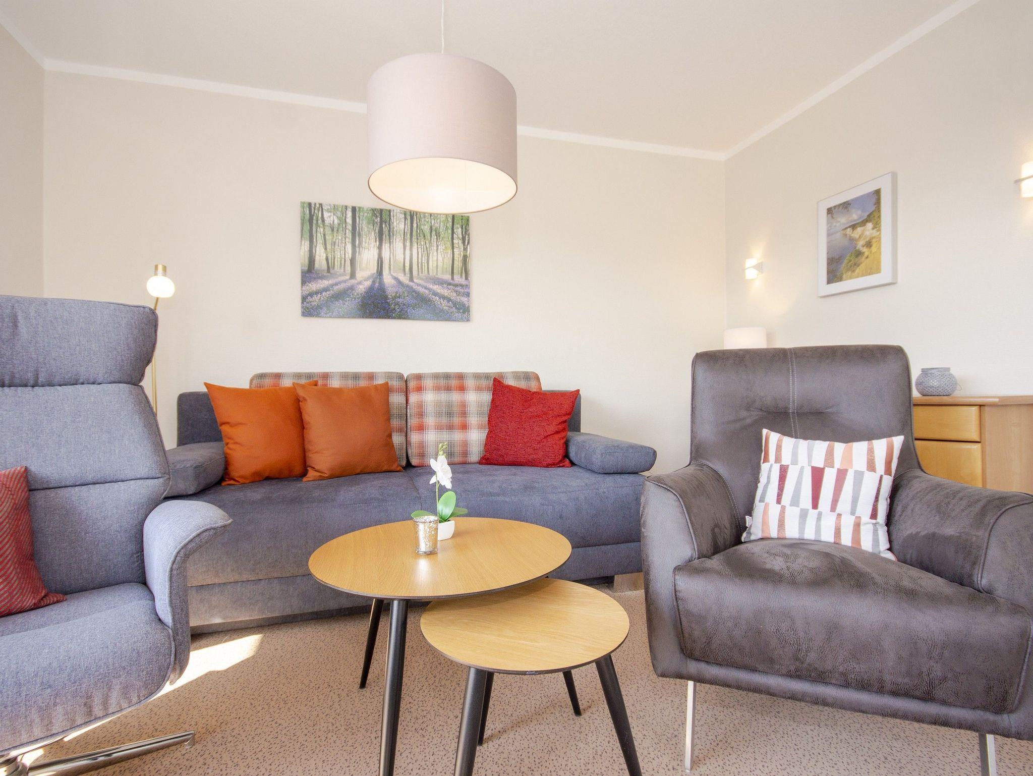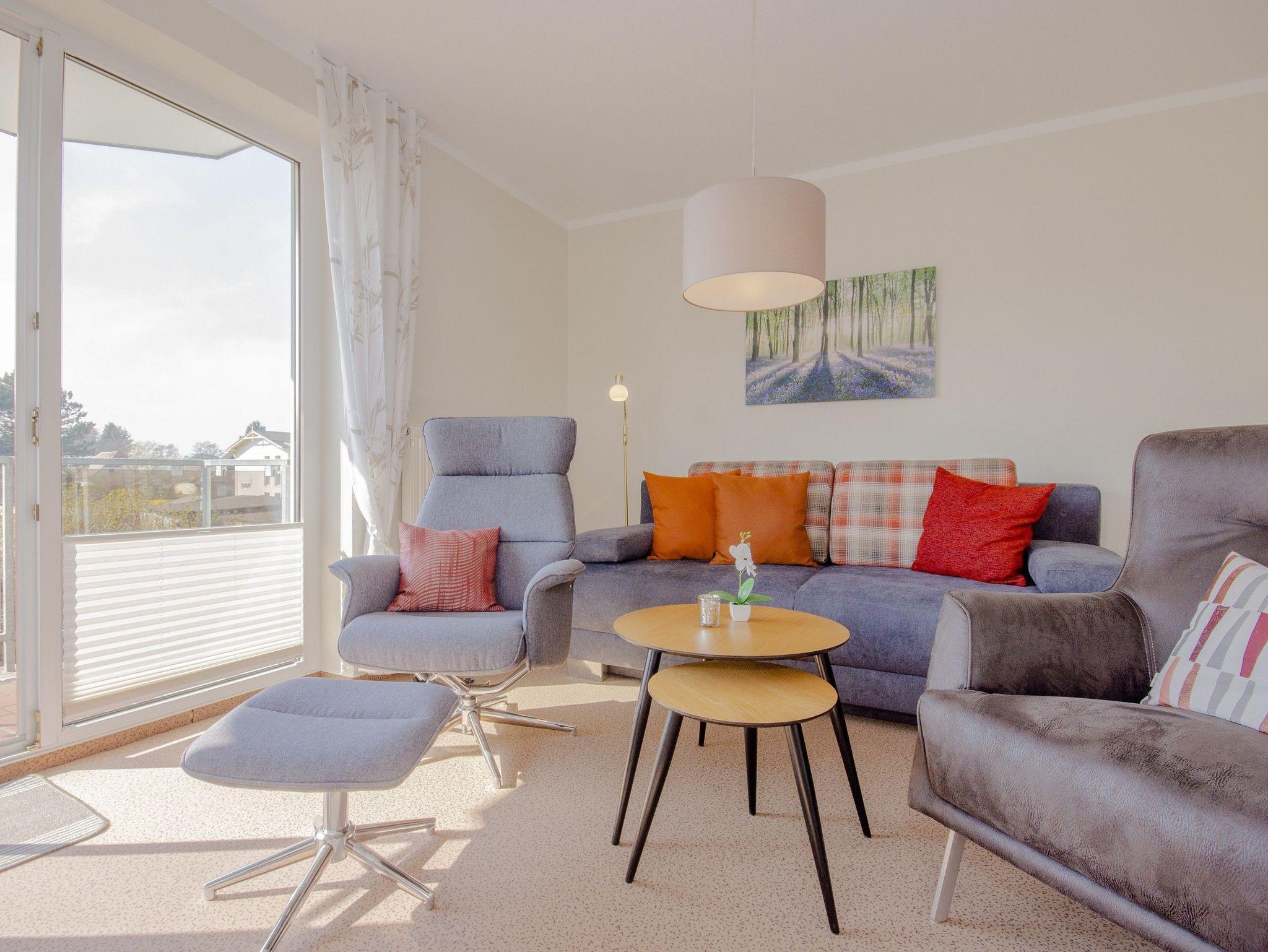 Der freundliche Wohnbereich bietet einen gemütlichen Ort zum Ausklingen der erlebnisreichen Tage auf Rügen. Hier befindet sich neben einem modernen Flachbild-TV auch eine außerordentlich komfortable Couchgarnitur, die eine optionale Aufbettung für bis zu 2 weitere Personen darstellt. Von diesem Zimmer erhalten Sie einen direkten Zugang auf den Balkon, welcher mit komfortablen Balkonmöbeln ausgestattet ist. Hier können Sie nach einem erlebnisreichen Strandtag in Baabe einfach mal die Seele baumeln lassen.