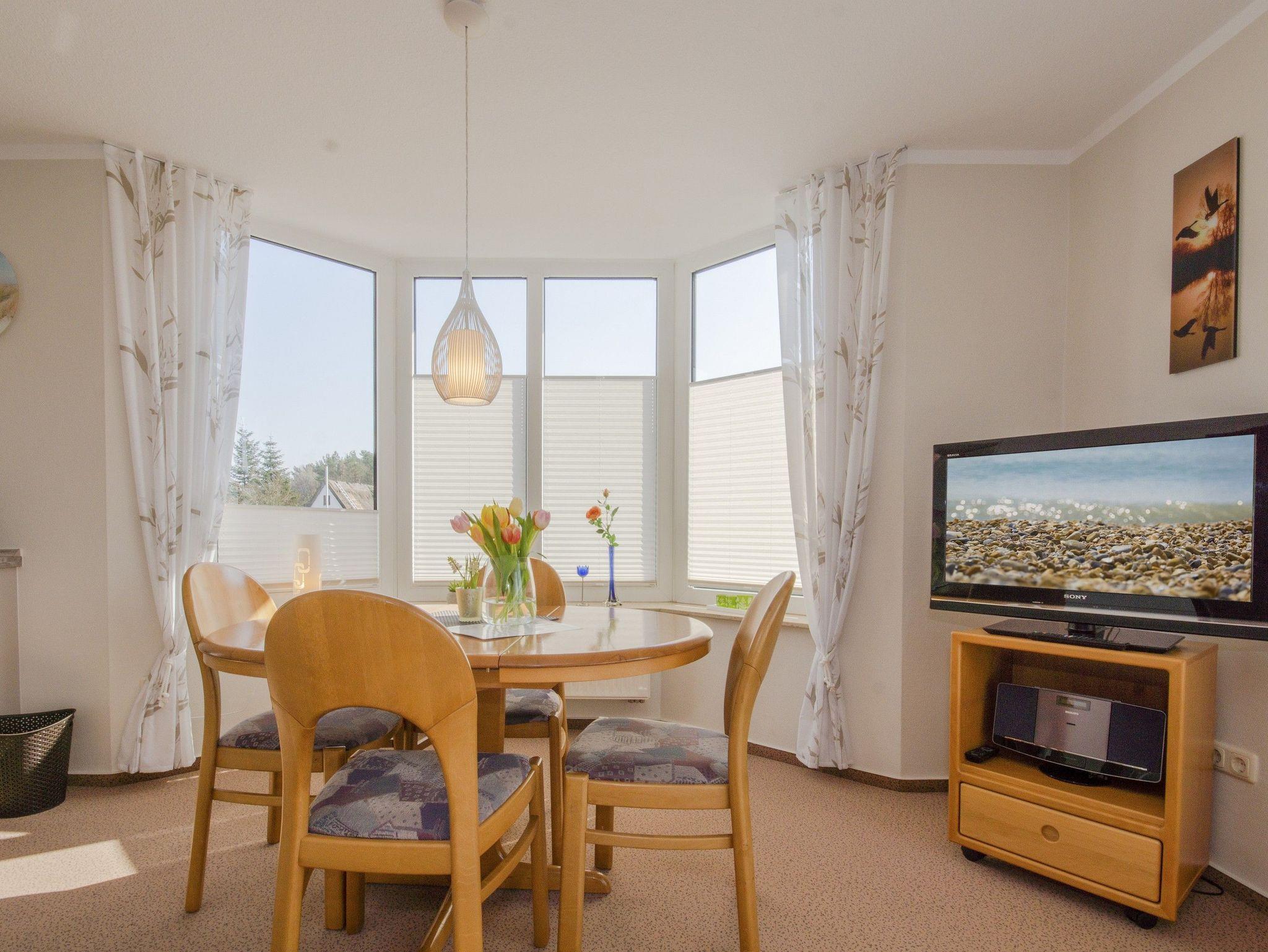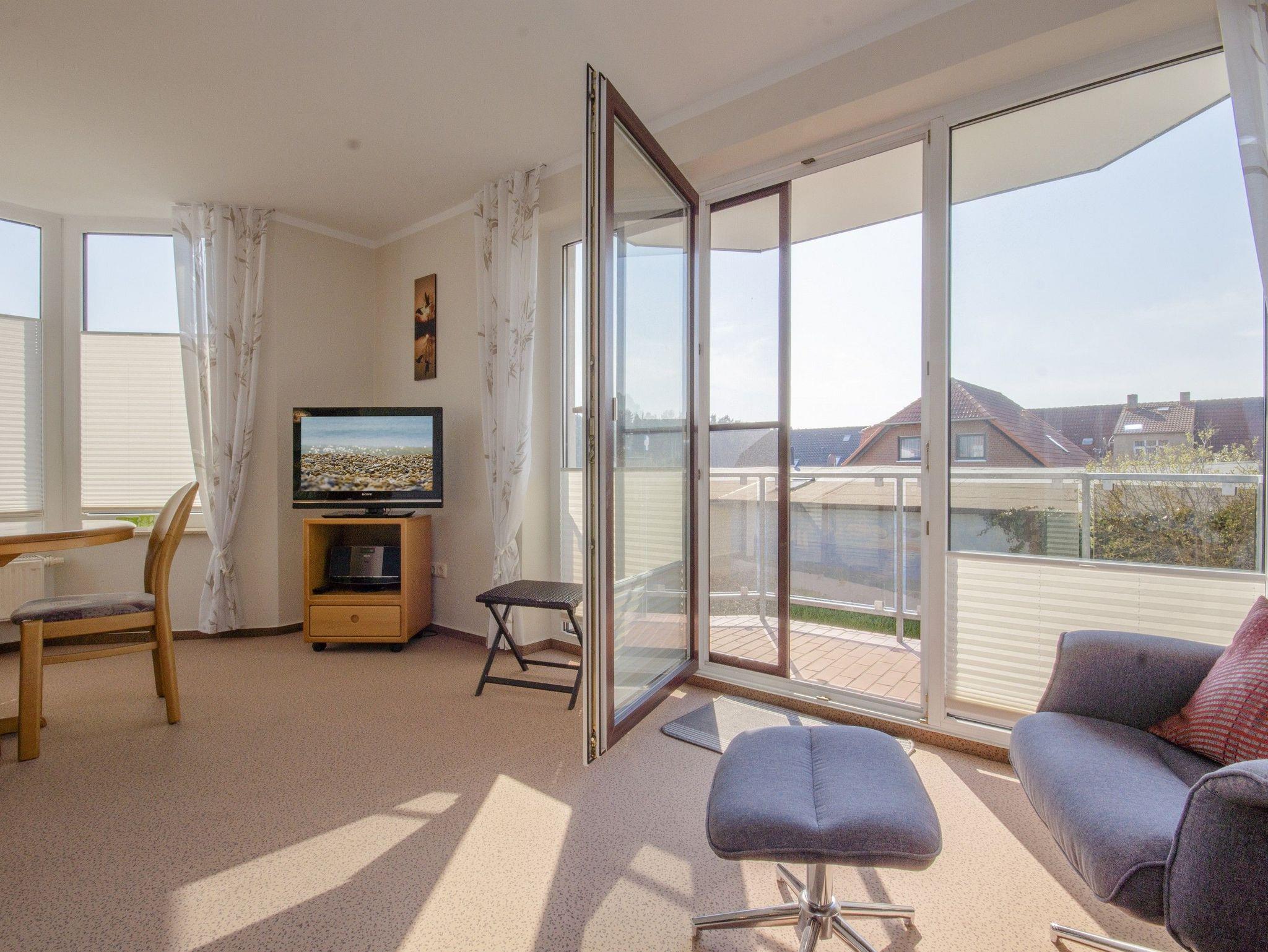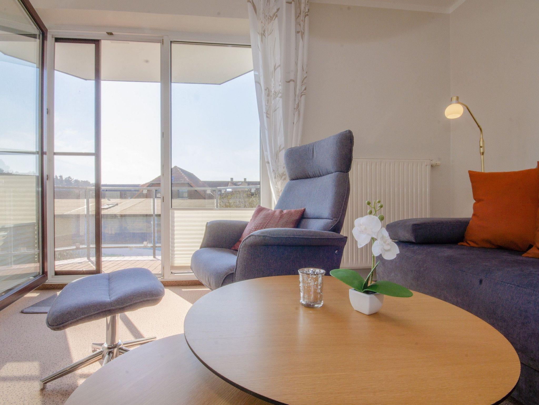 Der freundliche Wohnbereich bietet einen gemütlichen Ort zum Ausklingen der erlebnisreichen Tage auf Rügen. Hier befindet sich neben einem modernen Flachbild-TV auch eine außerordentlich komfortable Couchgarnitur, die eine optionale Aufbettung für bis zu 2 weitere Personen darstellt. Von diesem Zimmer erhalten Sie einen direkten Zugang auf den Balkon, welcher mit komfortablen Balkonmöbeln ausgestattet ist. Hier können Sie nach einem erlebnisreichen Strandtag in Baabe einfach mal die Seele baumeln lassen.