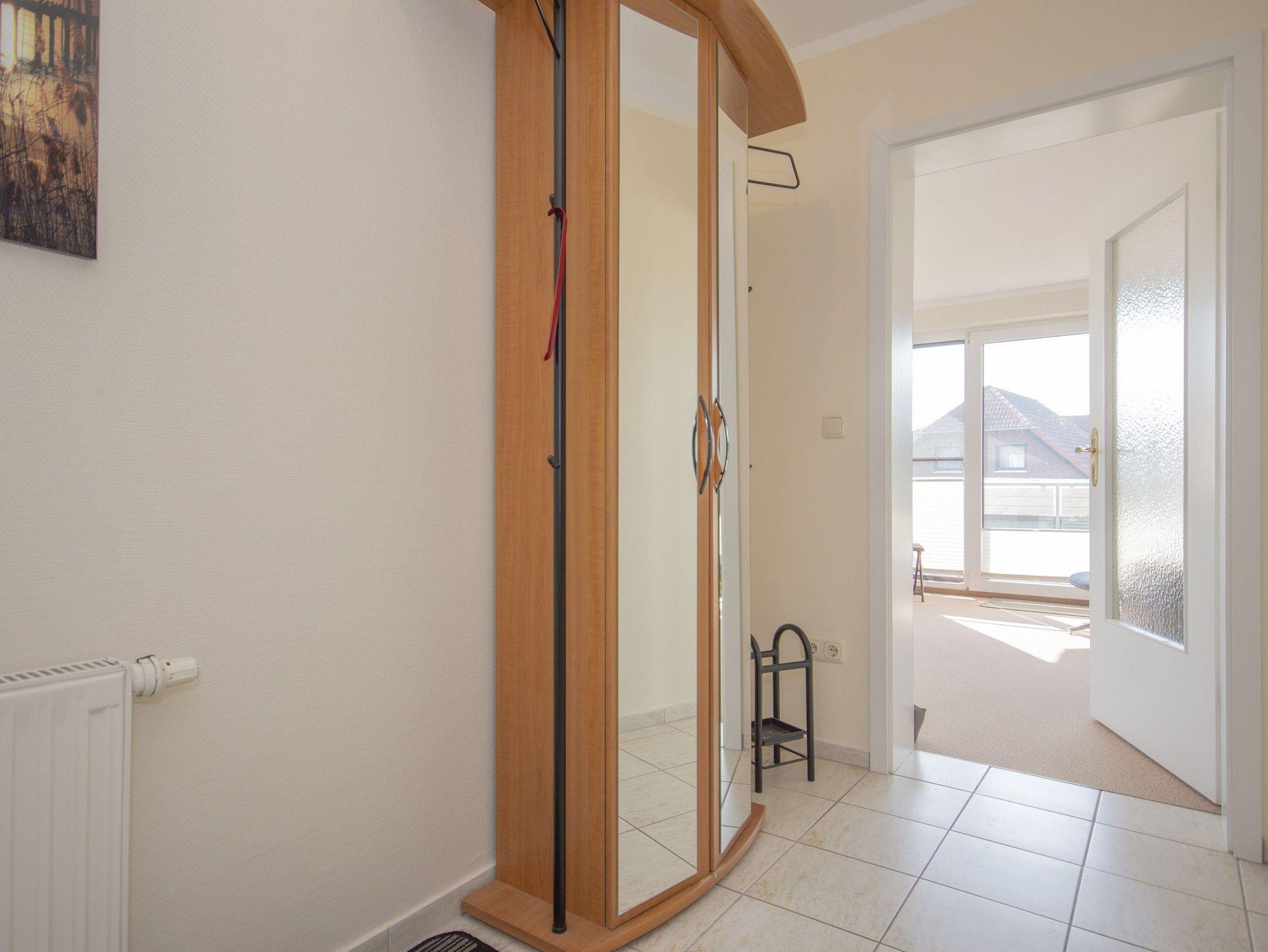 Die Ferienwohnung 5 im 1. Obergeschoss im Haus Rügensonne verfügt über einen freundlichen Eingangsbereich, einen Balkon, einen gemütlichen Wohnbereich und ein separates Schlafzimmer.