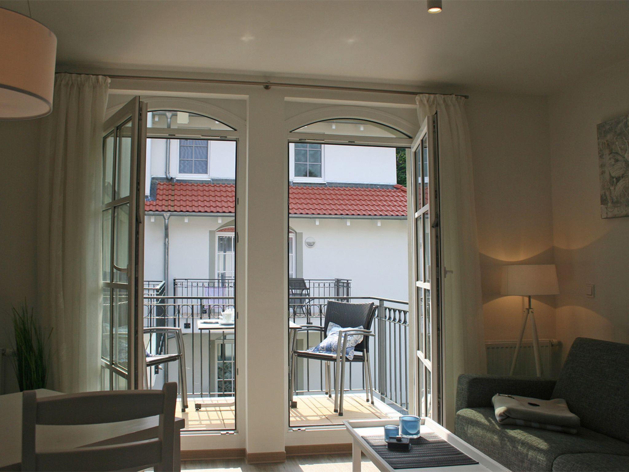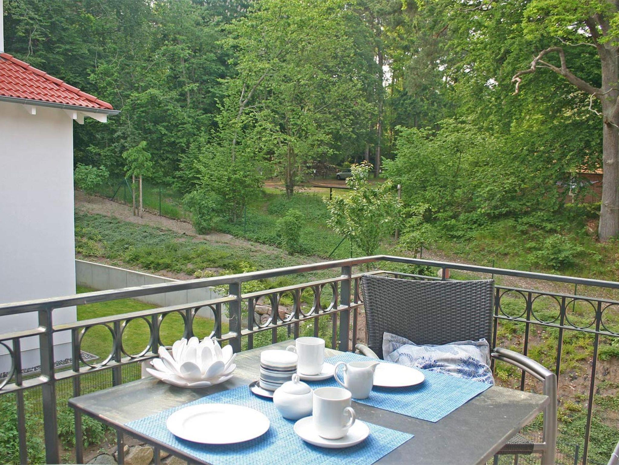 Moderne Ferienwohnung mit Balkon und Meeresblick in Baabe, nahe Strand und Wellnessbereich.