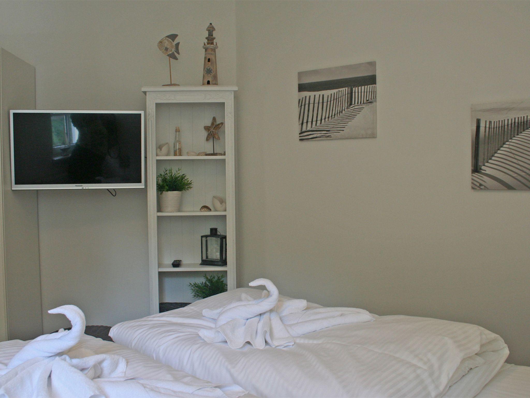 In dem separaten Schlafzimmer mit TV und Schrank übernachten Sie in einem bequemen Boxspring-Doppelbett.