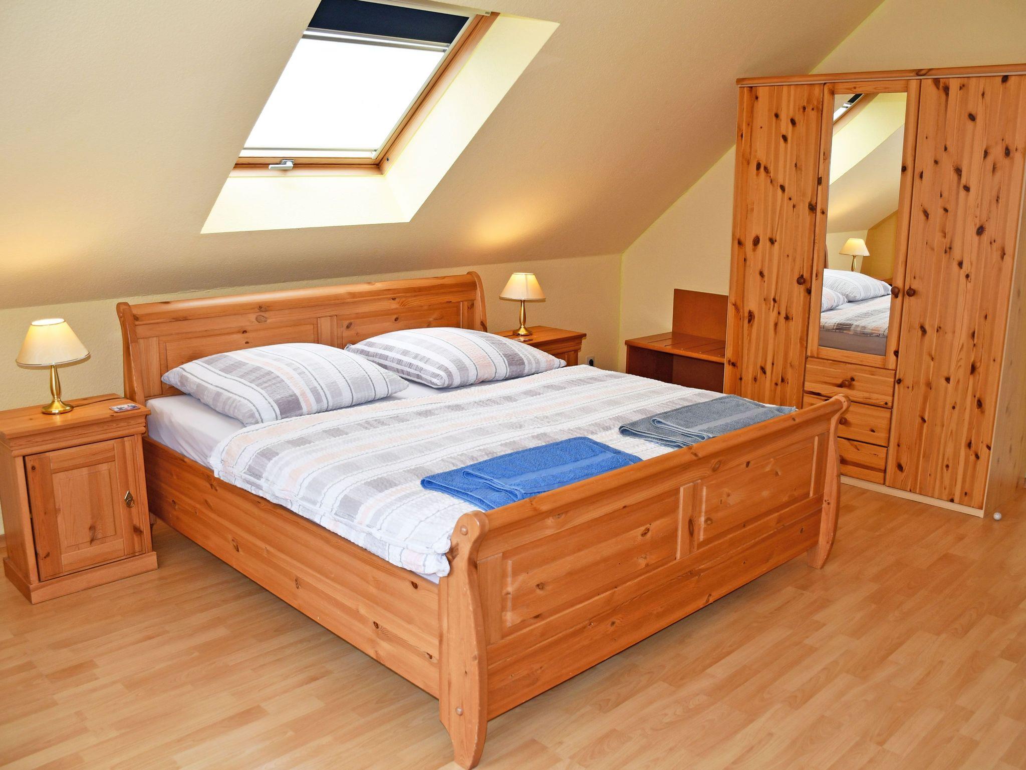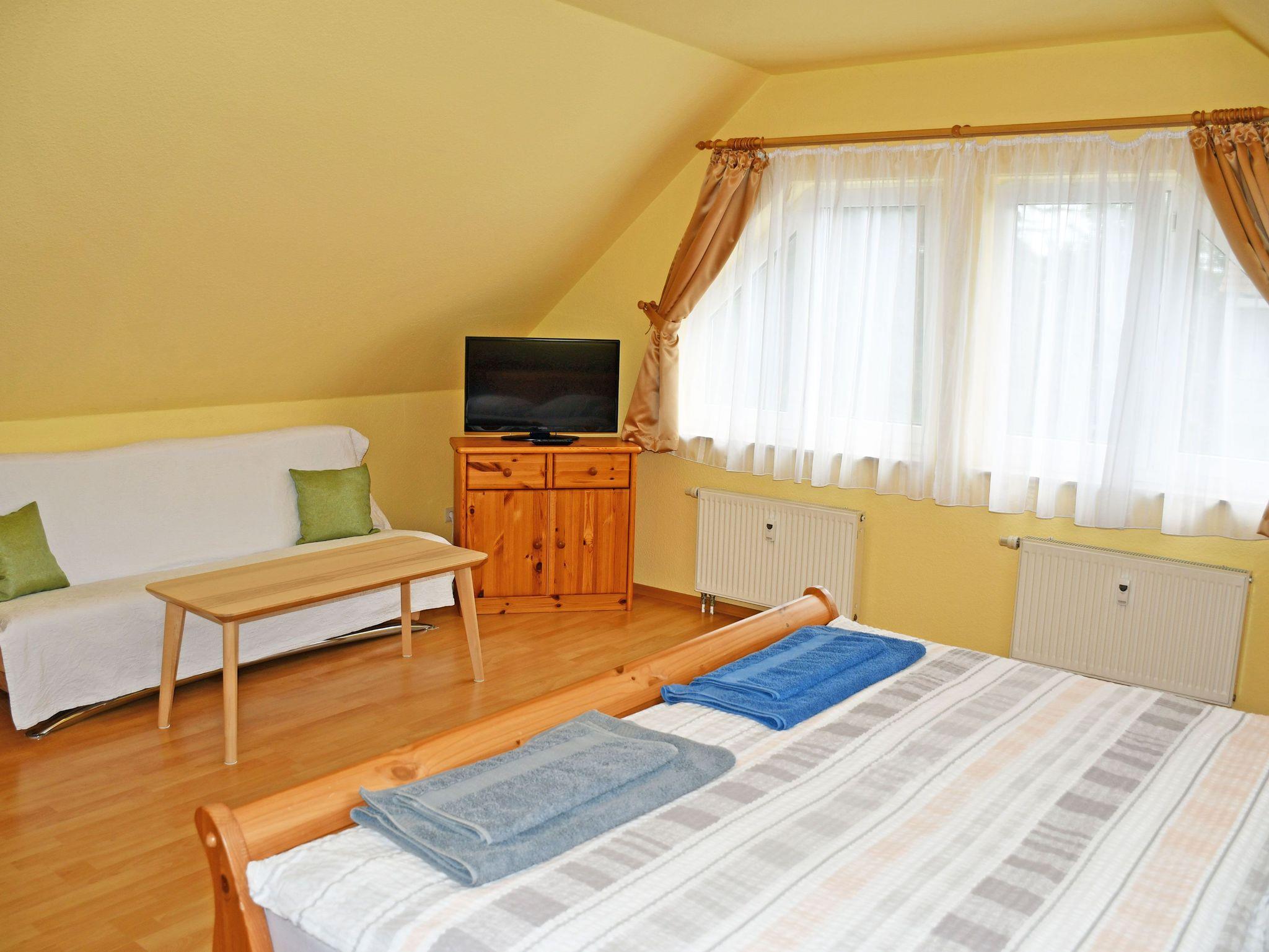 Im dem hell und freundlich kombinierten, großzügigen Wohn-/Schlafraum befinden sich eine Schlafcouch, ein TV-Gerät und eine Musikanlage sowie ein Kleiderschrank. Hier befindet sich auch ein bequemes Doppelbett mit Nachttischen und Leselampen. Bei Bedarf kann die Schlafcouch auch für einen dritten Gast aufgebettet werden.