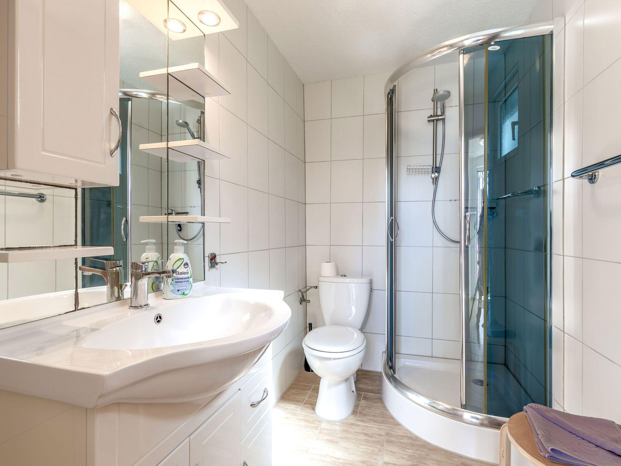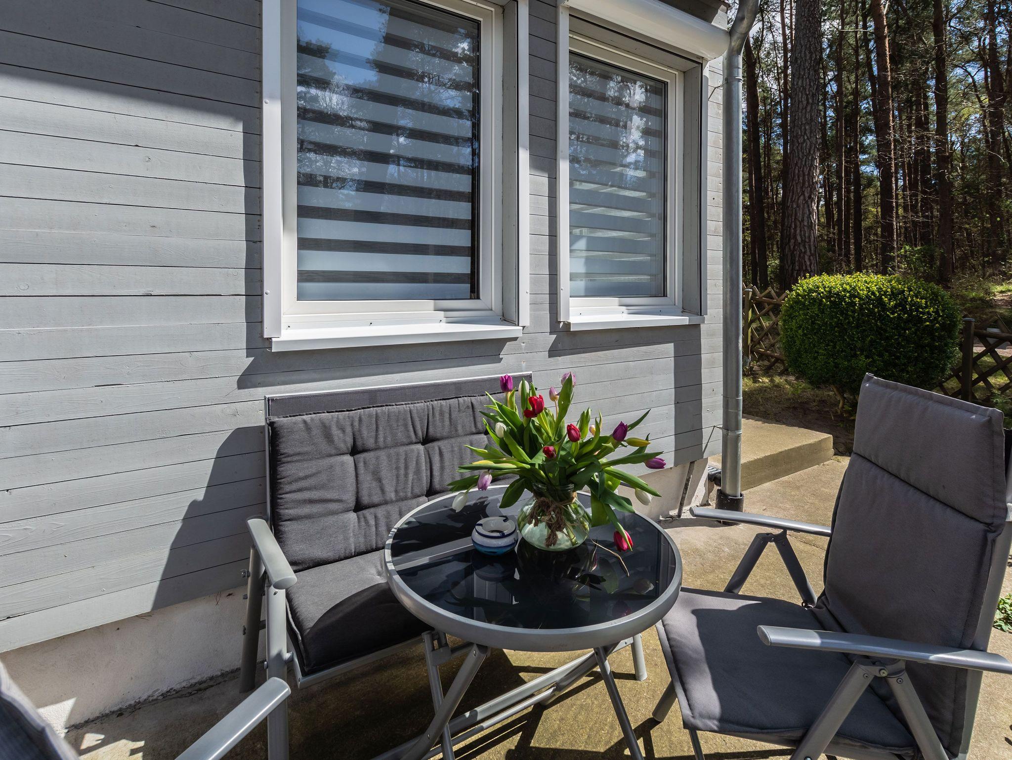 Alle Räume verfügen über Außenjalousien, die zusätzlich die Privatsphäre unterstützen. Auf der sonnigen Terrasse, die man über den Wohnbereich erreicht, stehen Gartenmöbel und ein Holzkohlegrill bereit.