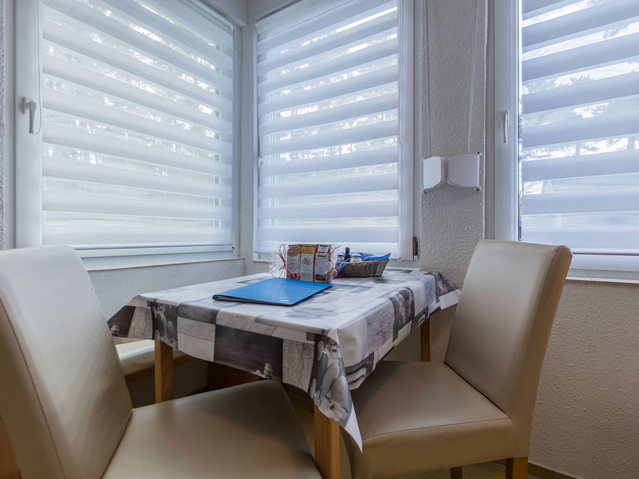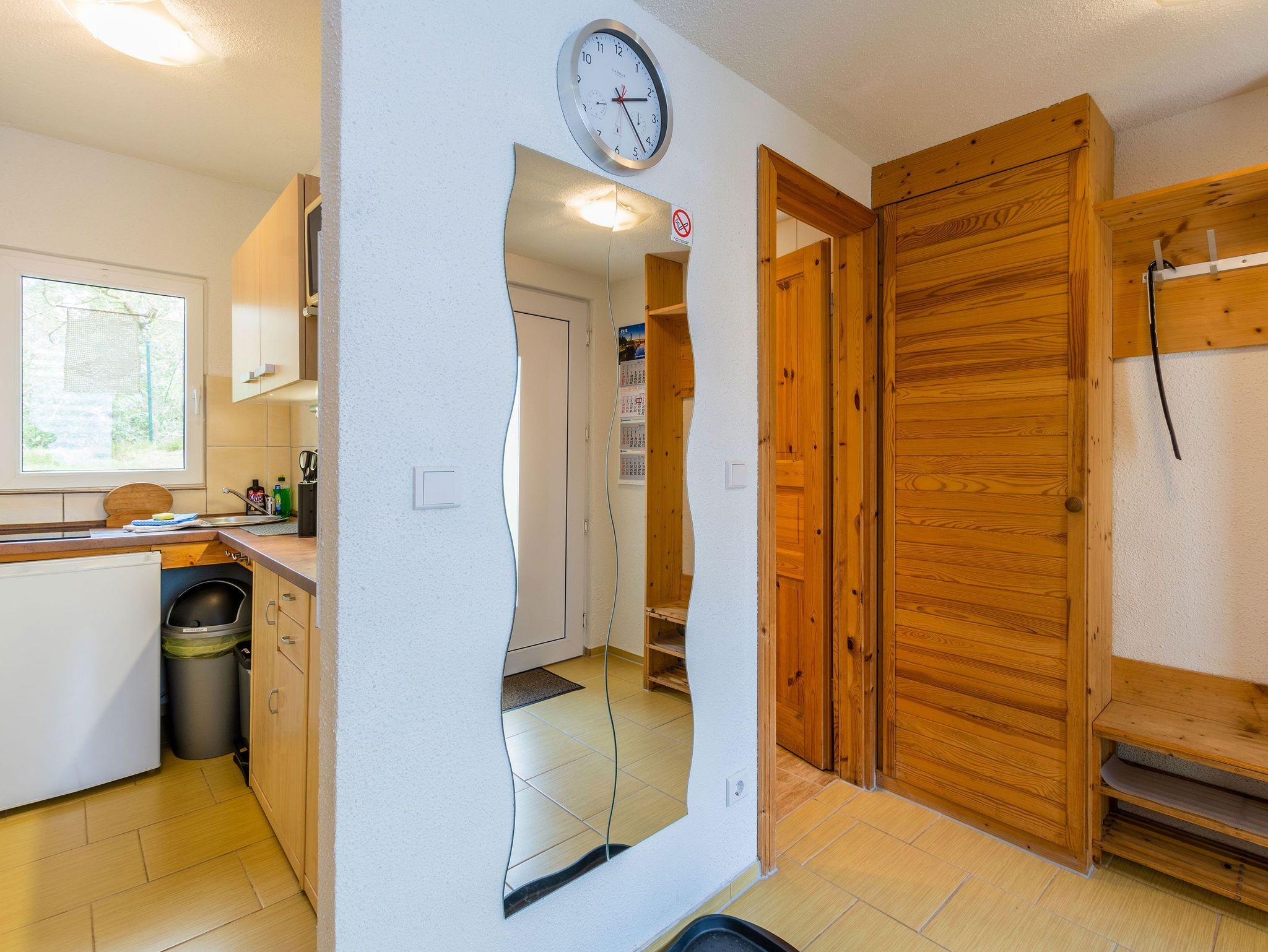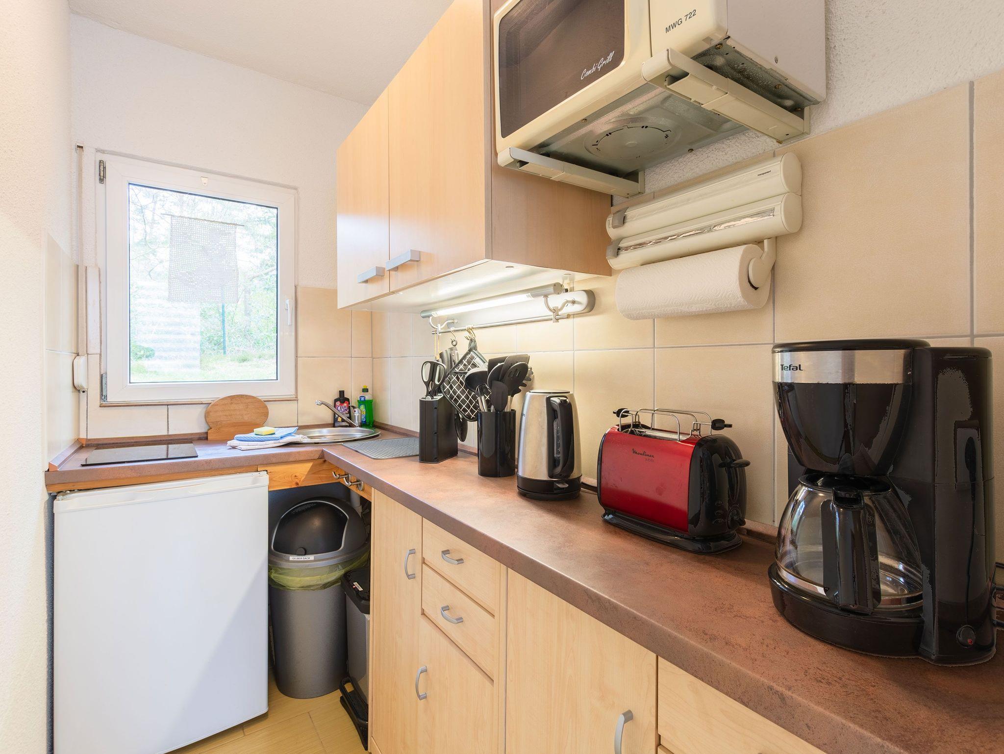 Die offene Küche ist mit einem kleinen Kochfeld, einem Kühlschrank, Kaffeefiltermaschine, Wasserkocher, Toaster sowie einer Mikrowelle ausgestattet. Ein kleiner Essbereich rundet das Gesamtangebot ab. Im Schlafbereich befindet sich ein Doppelbett (140 x 200) und ein Kleiderschrank.