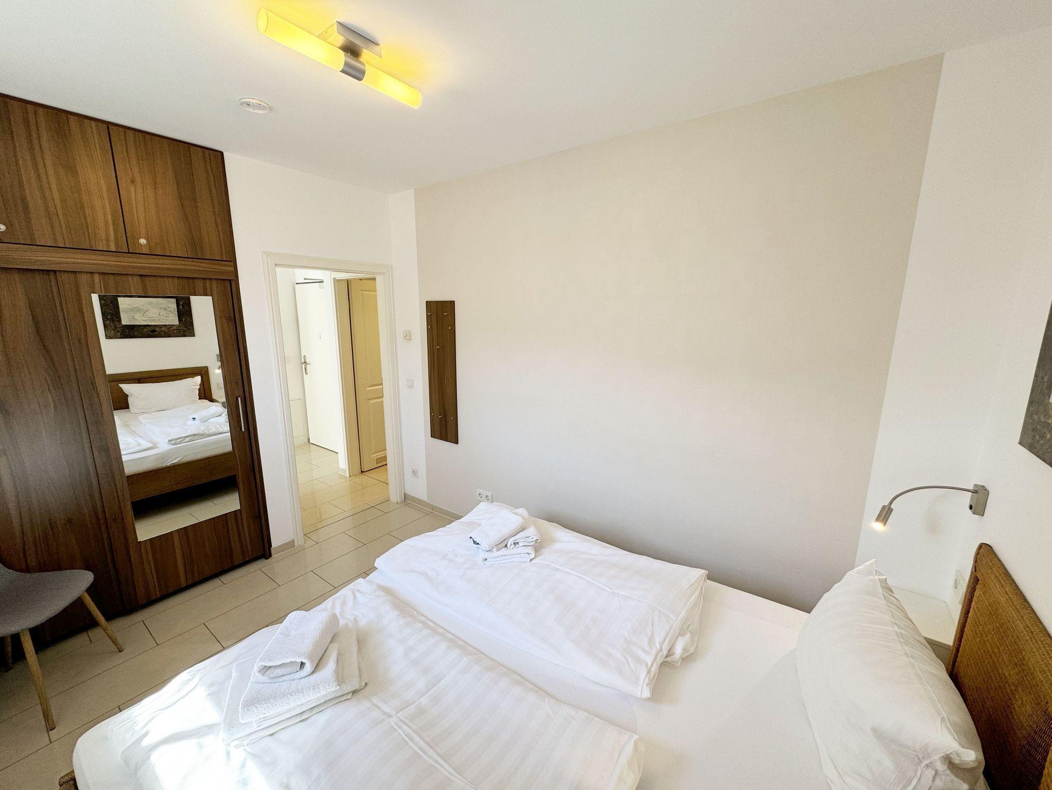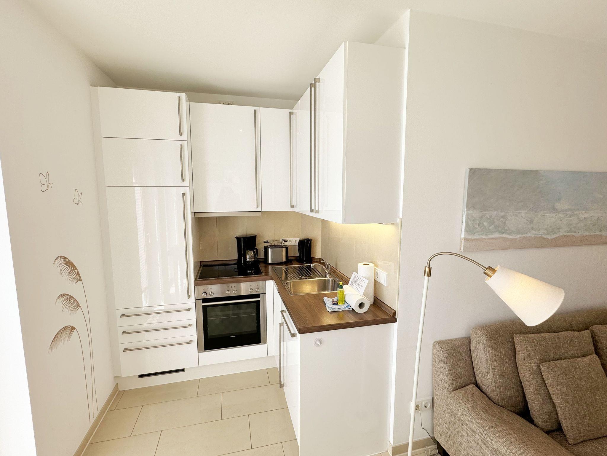 Die Nichtraucherwohnung hat eine Nutzfläche von etwa 40 m², ist für 2 Personen eingerichtet und befindet sich im 2. OG in der Kurparkresidenz im Ostseebad Baabe. Im Haus befindet sich ein Fahrstuhl, der Sie bequem zur Wohnung führt. Die Kurparkresidenz liegt unmittelbar am Kurpark in erster Reihe zur Ostsee. Der feine Sandstrand der Ostsee ist etwa 100 Meter entfernt. Durch die Strandkiefern des Kurparks hindurch hat man teilweise Meerblick. Die Entfernung zur Strandstraße in Baabe beträgt etwa 90 Meter. Freuen Sie sich auf eine Wohnung, die komplett gefliest und mit einer Fußbodenheizung ausgestattet ist (Allergikerfreundlich). Durch die großen bodentiefen Glasfenster bzw. ?Türen bekommt die Wohnung viel Tageslicht. Das Wohnzimmer verfügt über eine Sitzcouch mit Tisch, LED-TV, DVD-Player und einer integrierten Küchenzeile mit Geschirrspüler, Ceranfeld, Backofen, Kühlschrank mit Gefrierfach und diversen Küchenutensilien. Auch im Urlaub brauchen Sie in der Wohnung nicht auf einen Internetanschluss (LAN/WLAN) verzichten. Dieser ist für Sie inklusive!!! Das Schlafzimmer besteht aus einem Doppelbett (2 x 0,90 m x 2,00 m) und einem Kleiderschrank. Das Bad ist mit Dusche und WC ausgestattet. Auf einem der beiden Balkone können Sie schon morgens die Sonne genießen. Bei der Einrichtung haben wir viel Wert auf hochwertige Materialien gelegt und auf eine angenehme Atmosphäre geachtet, denn Sie haben Urlaub und sollen sich wohl fühlen. Im Keller des Hauses befindet sich eine Waschmaschine und ein Trockner, der gegen Gebühr genutzt werden kann. Zur Wohnung gehört ein wohnungseigener Außenstellplatz (Nr.13). Die Erstausstattung eines Wäschepaketes (komplette Bettwäsche, 1 Duschhandtuch, 1 kleines Handtuch) können Sie bis 14 Tage vor Anreise gegen einen Aufpreis dazu buchen oder durch eigene ergänzen. Ab 2 gebuchten Paketen erhalten Sie einmalig 1 Geschirrhandtuch und 1 Duschvorleger hinzu.
