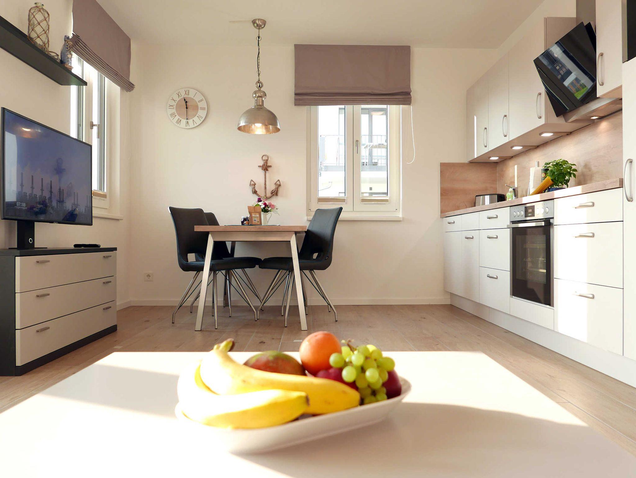 Im Wohn-/Esszimmer befindet sich ein hochwertiges Schlafsofa von Messina (140x200 cm). Die Wohnküche ist mit Backofen, Kühlschrank mit Gefrierfach, Mikrowelle und Spülmaschine ausgestattet.