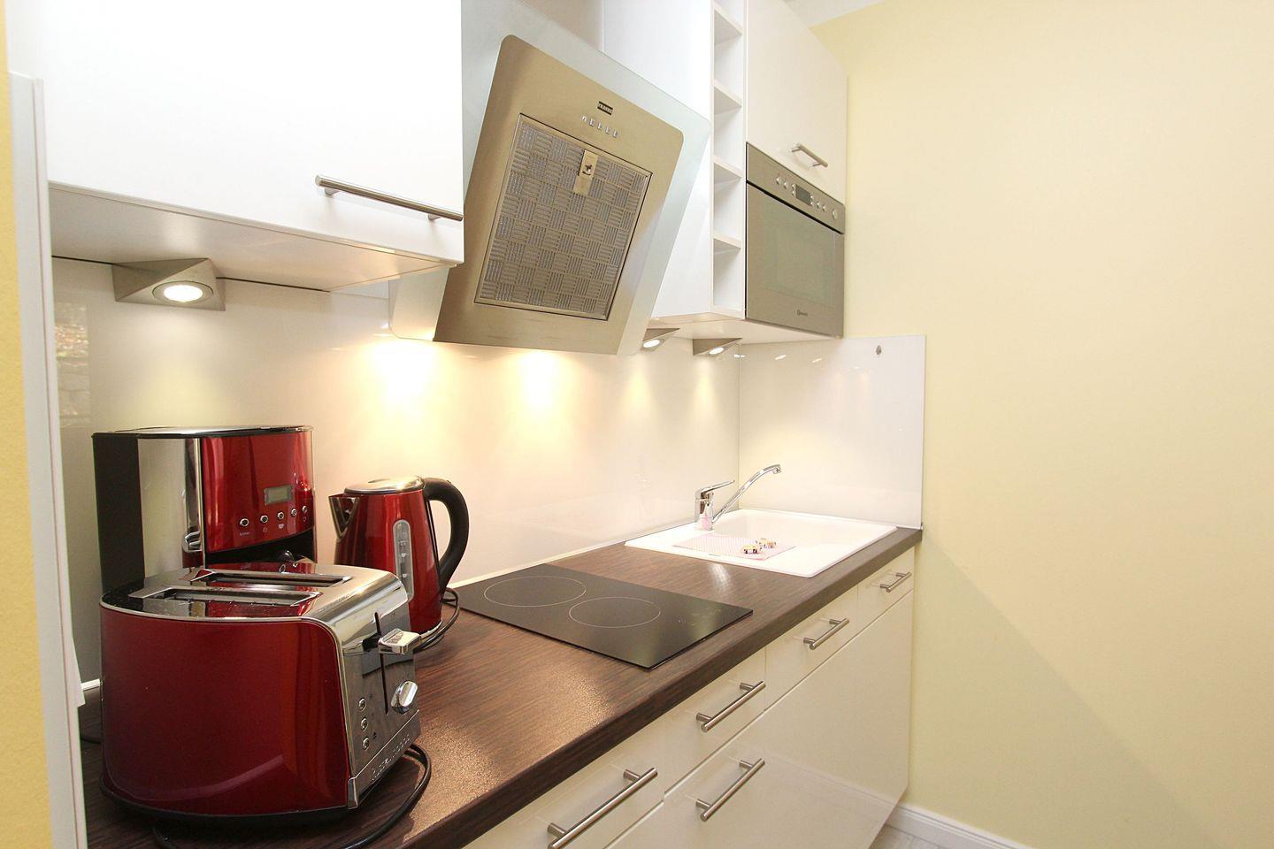 KÜCHE // exquisite Küchenzeile, 2-Platten Ceranherd, Spülmaschine, Kühlschrank mit Gefrierfach, Mikrowelle mit Grillfunktion, Toaster, Wasserkocher, Kaffeemaschine, Besteck, Geschirr und reichlich Küchenutensilien ++