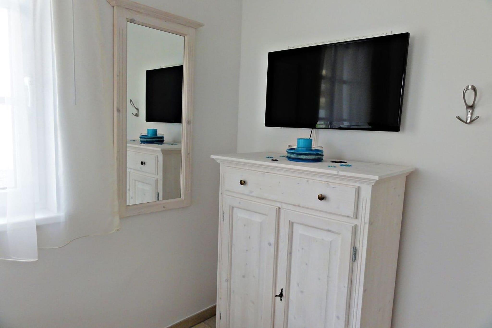 Die 54 m² große 3-Zi.- Ferienwohnung befindet sich im Erdgeschoss, Südterrasse mit kleinem Meerblick, sie ist freundlich und hochwertig eingerichtet. Diele mit Abstellraum im Eingangsbereich, 2 Schlafräume (1 x mit Doppelbett + 1 x 2 Einzelbetten) und Badezimmer mit begehbarer Dusche. Wohn-/Esszimmer mit LED-TV. Die offene Küchenzeile ist ausgestattet mit leisem Geschirrspüler, Mikrowelle mit Grill, Kühlschrank mit Gefrierfach, 2-Platten-Cerankochfeld und diversen Kleingeräten. Die Südterrasse ist seewindgeschützt durch Dünen und Kiefern. Ein kostenfreier, bequemer Tiefgaragenstellplatzist vorhanden . Der Wellnessbereich im 'Haus Meeresblick' beinhaltet ein Schwimmbecken, zwei Saunen, eine Erlebnisdusche, eine Schneckendusche.