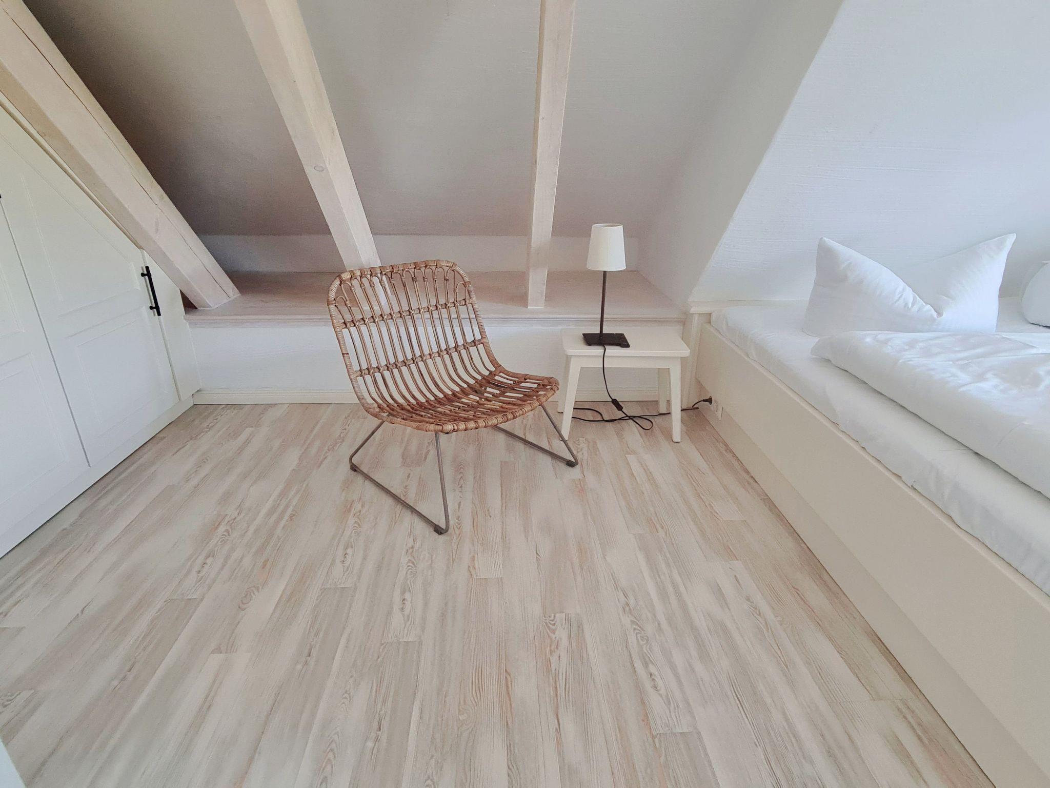 Ganz oben unter dem Dach des Hauses befindet sich ein weiteres großzügiges Schlafzimmer mit "offenem Gebälk". Das großzügige Schlafzimmer, ausgestattet mit einem Doppelbett und Smart-TV, Sitzecke, sowie einem Arbeitsplatz.