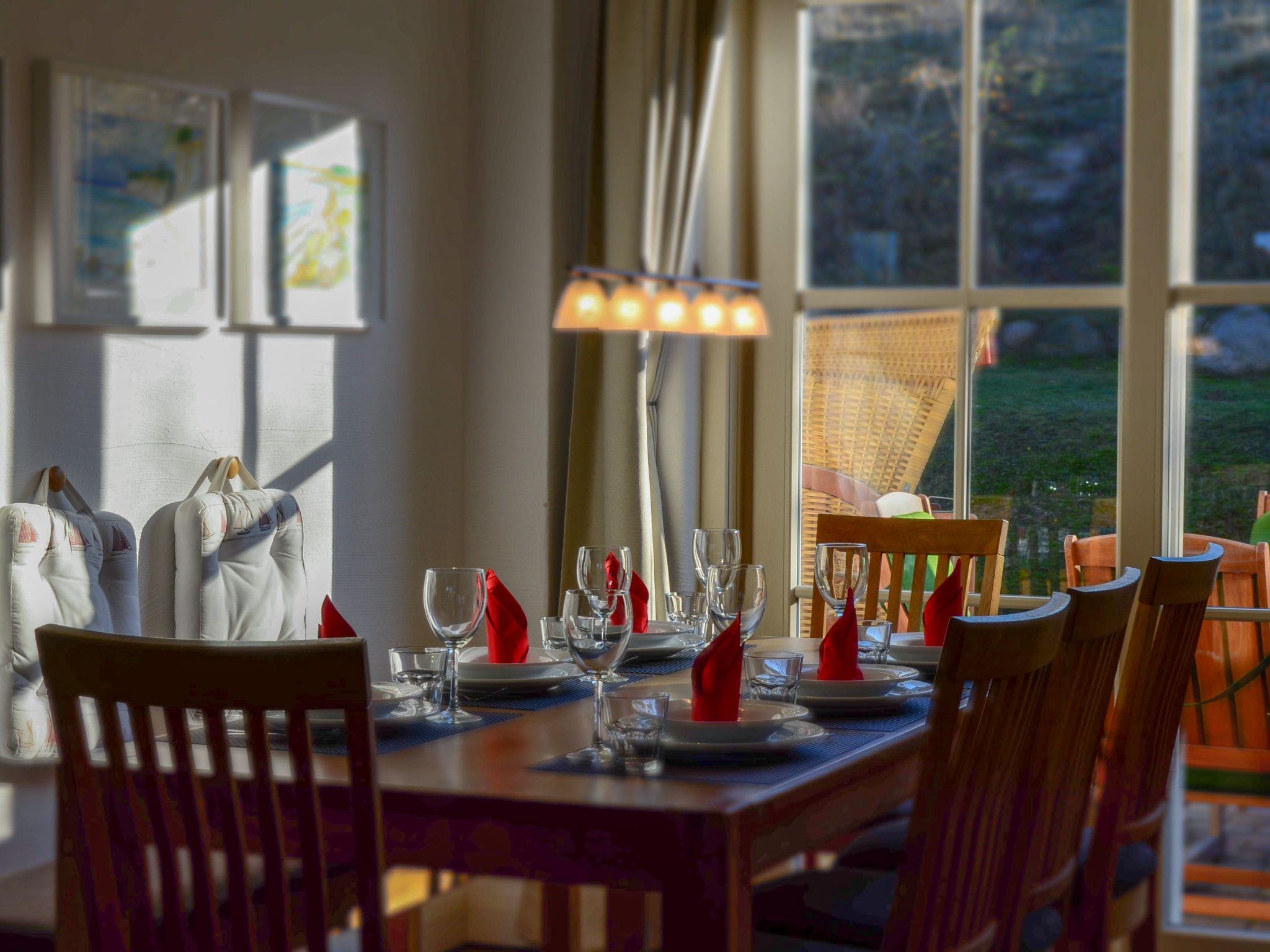 Bei Ihren gemeinsamen Kochmomenten mit der Familie oder Freunden ist die offene und voll ausgestattete Landhaus-Küche mit bodentiefen Fenstern und großem Esstisch Ideal. Von hier haben Sie direkten Zugang auf die Südterrasse und den Garten um ungestört zu Frühstücken oder einfach die in der Rügenen-Sonne relaxen.