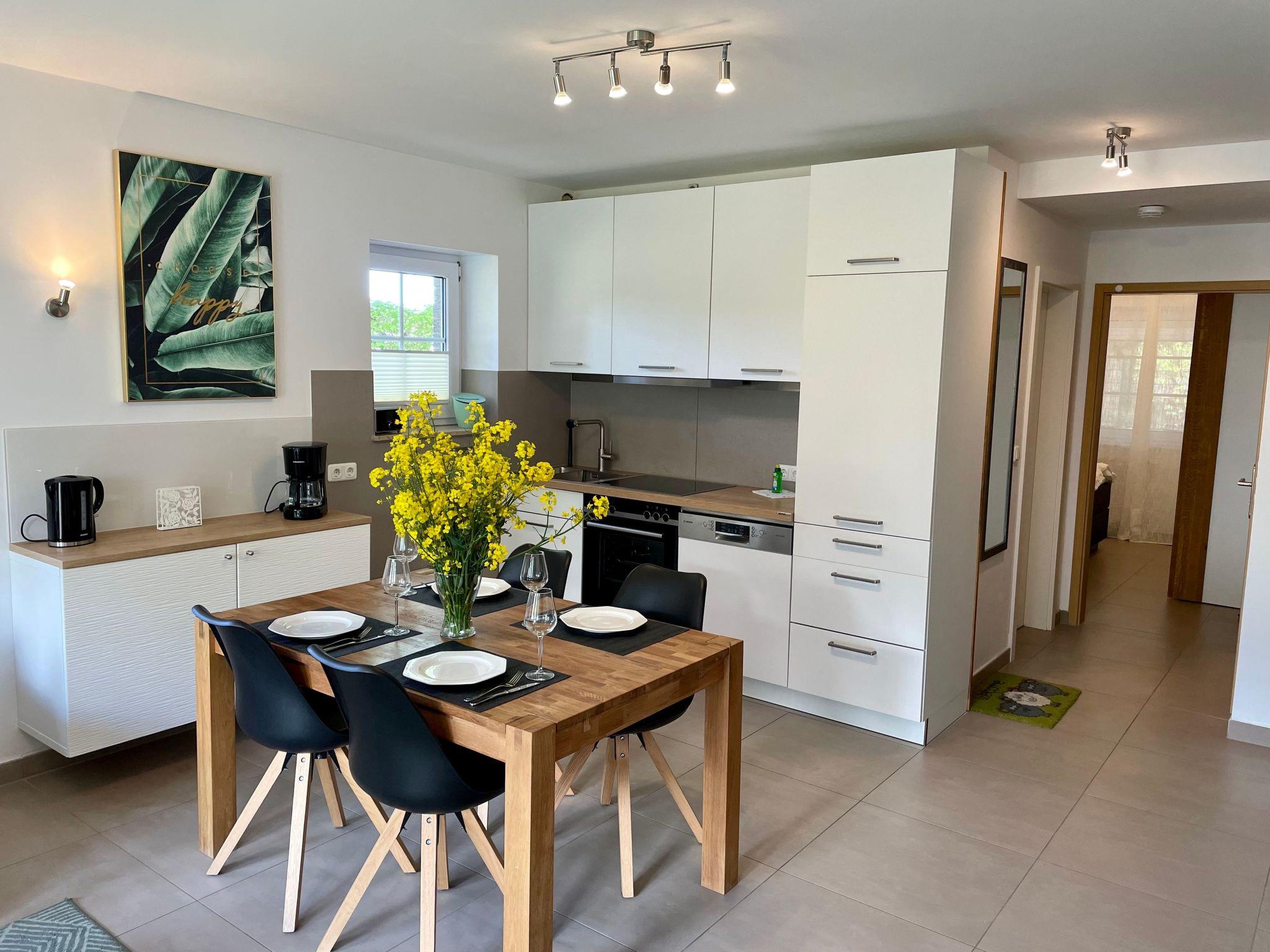 Die 3-Zimmer Maisonettewohnung verfügt über zwei Schlafzimmer mit Kingsize Boxspringbetten (1,80 m x 2,00 m), einen Wohnraum mit Couchgarnitur (Schlafsofa 1,40 m x 2,00 m), eine integrierte Einbauküche, einen Essbereich und zwei Duschbäder. Die komplett eingerichtete Küche mit Essbereich ist in den großen Wohnraum integriert. Von hier aus haben Sie Zugang zum Balkon mit einem wunderschönen Blick in die Natur.