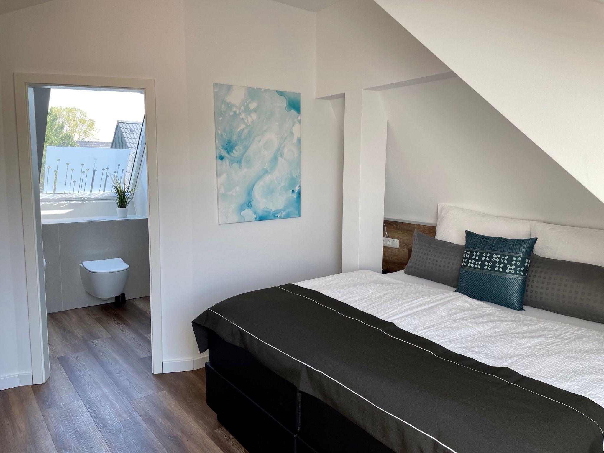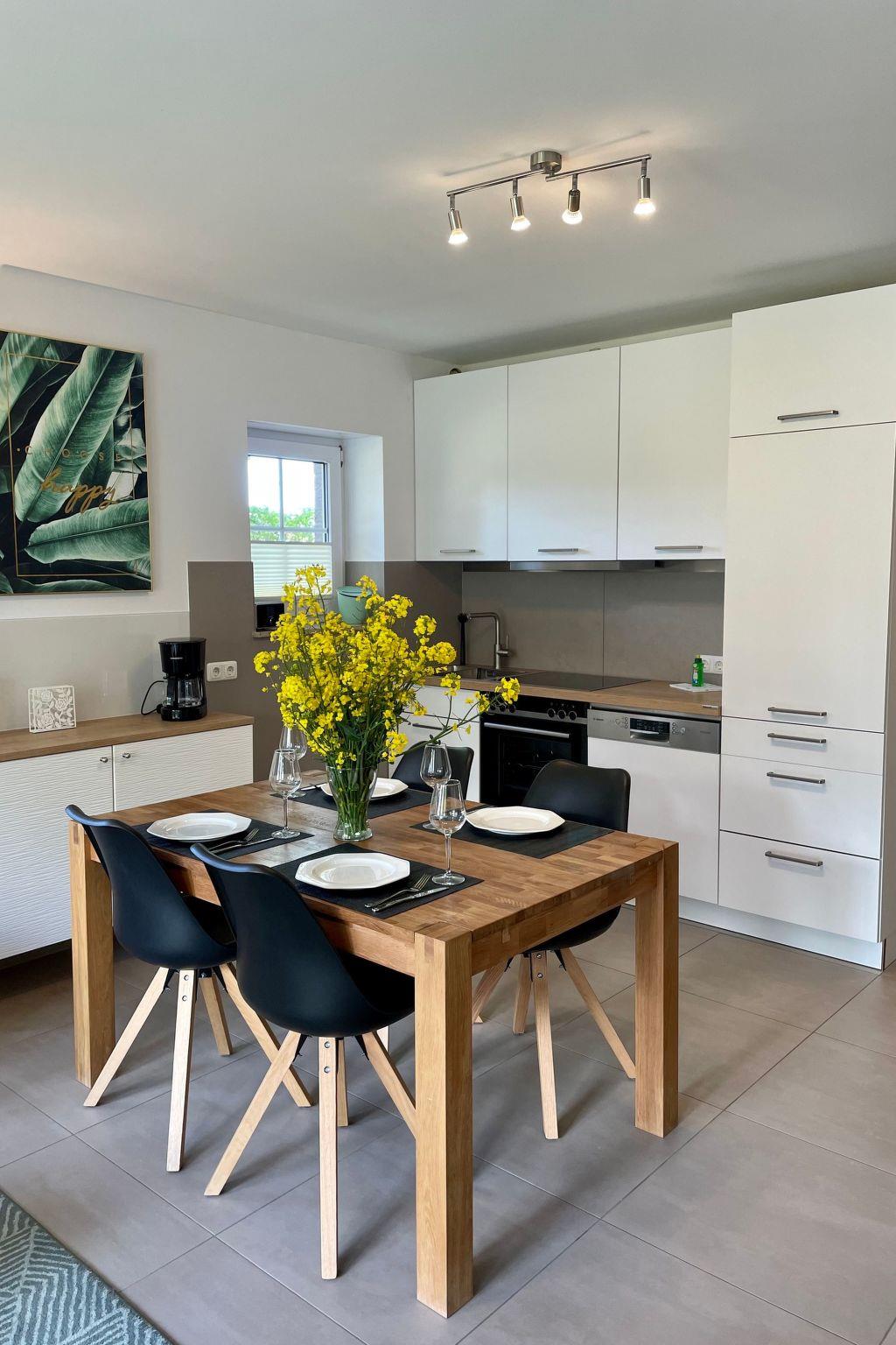 Die 3-Zimmer Maisonettewohnung verfügt über zwei Schlafzimmer mit Kingsize Boxspringbetten (1,80 m x 2,00 m), einen Wohnraum mit Couchgarnitur (Schlafsofa 1,40 m x 2,00 m), eine integrierte Einbauküche, einen Essbereich und zwei Duschbäder. Die komplett eingerichtete Küche mit Essbereich ist in den großen Wohnraum integriert. Von hier aus haben Sie Zugang zum Balkon mit einem wunderschönen Blick in die Natur.