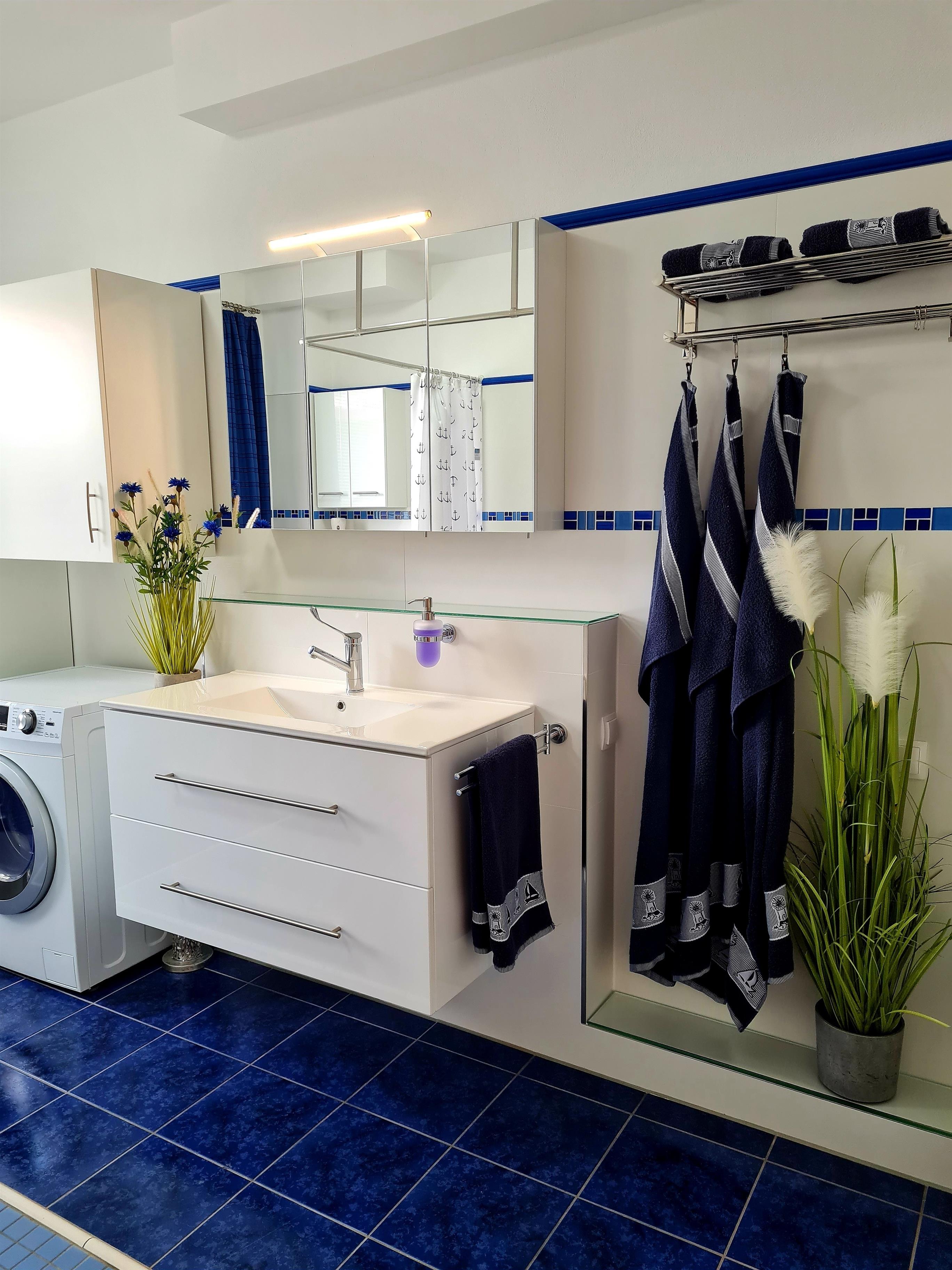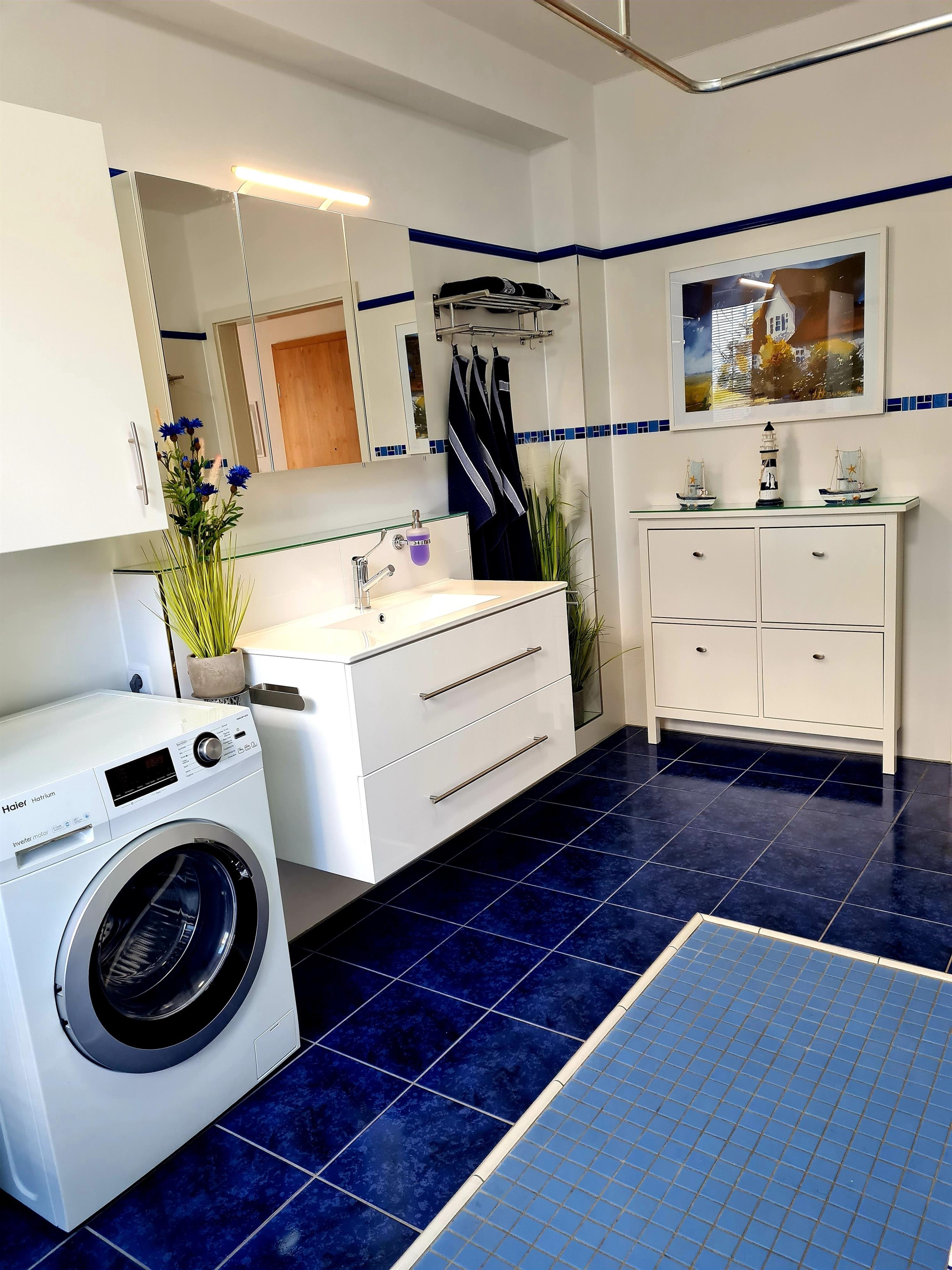 Im Bad finden Sie eine Waschmaschine, Wäscheständer, Bügelbrett, Bügeleisen, Staubsauger, Haartrockner, Kosmetikspiegel, Schränke, Komfort- WC und eine große Dusche.